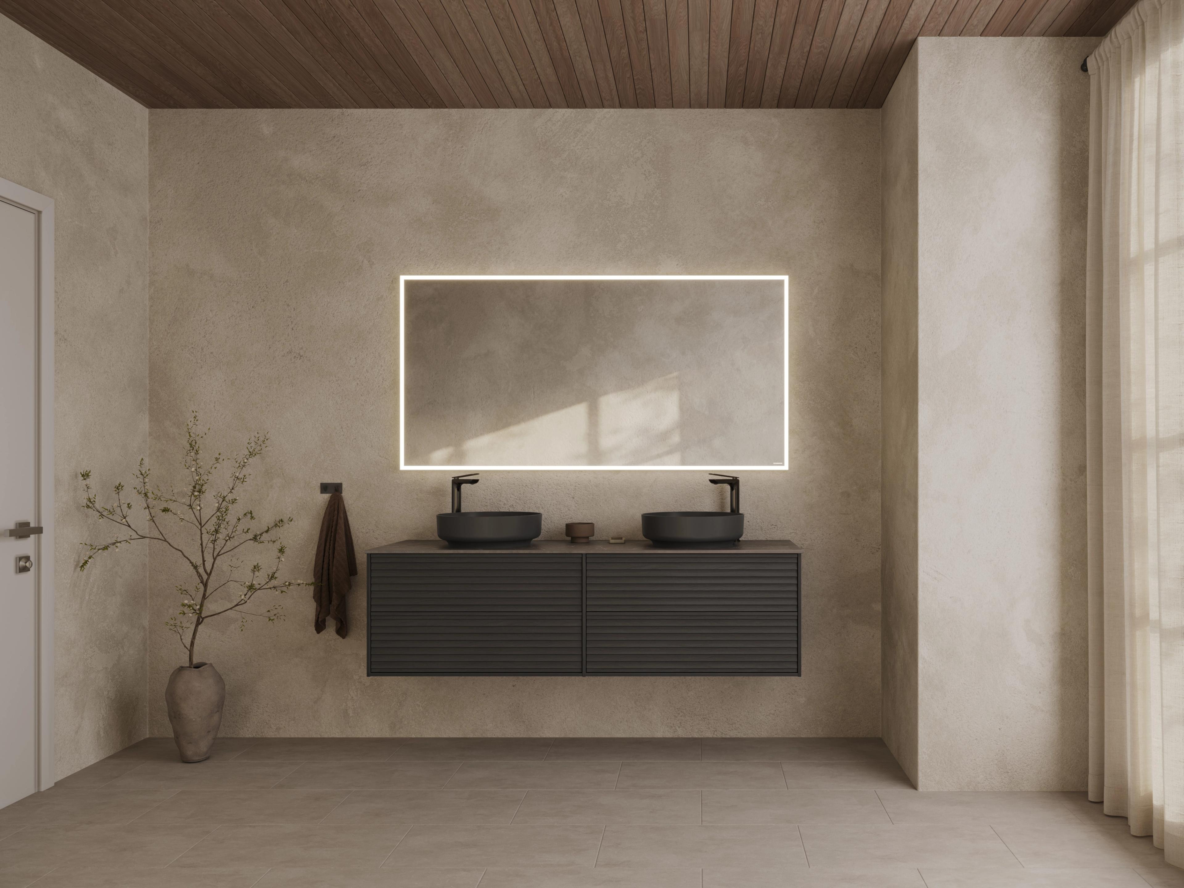 Baderomsmøbel i sort ask som inkluderer servantskapet (60x57x45 cm) med list front, to skuffer og integrerte håndtak. Hav servant (60x45 cm) i hvit og Skuru speilskap med LED-lys, strømuttak og to hyller. Pris uten servantkran.