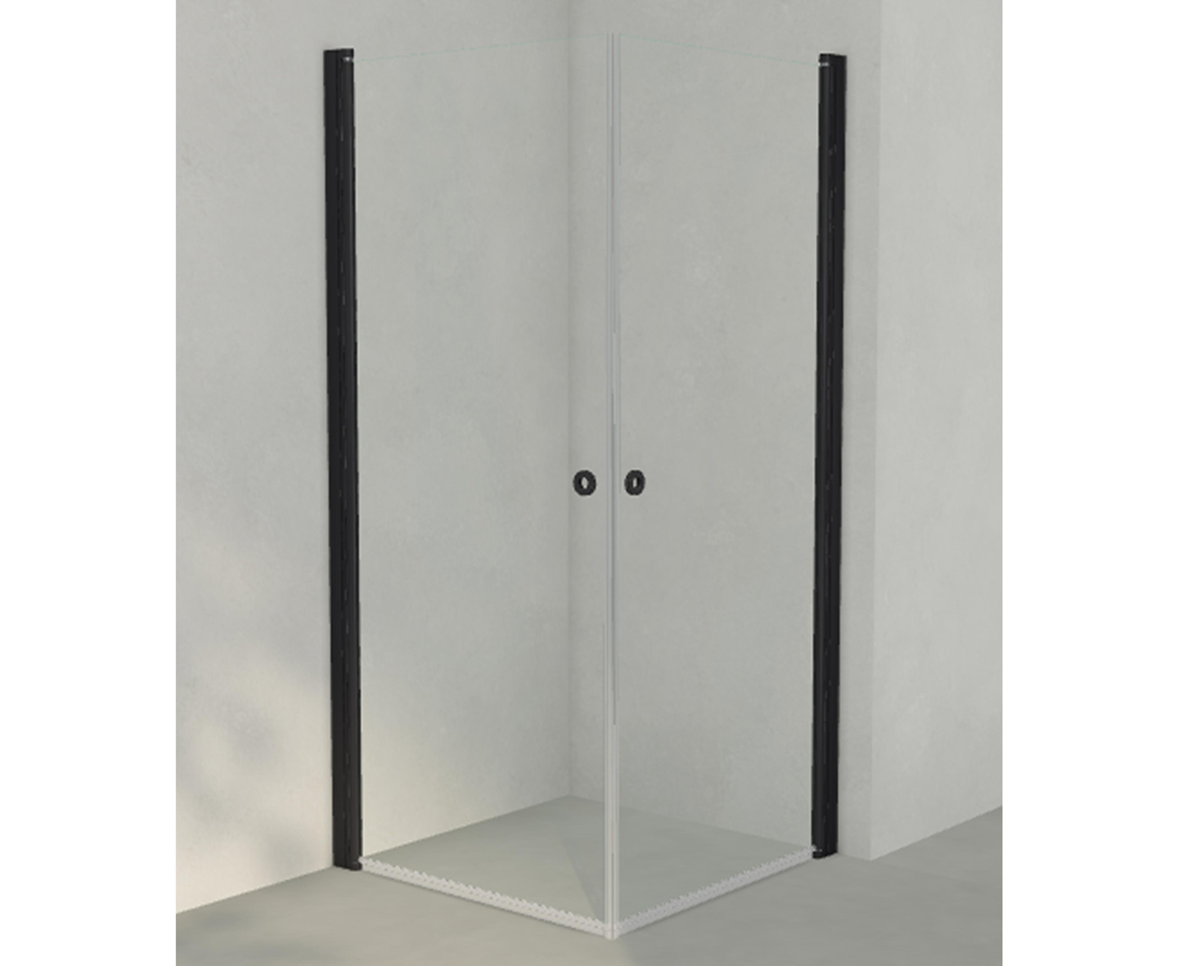 Dusjhjørne med sort matte profiler og klart sikkerhetsglass. Dusjhjørne i høy kvalitet, som leveres i flere forskjellige størrelser, glasstyper og profilfinish. Dørene er vendbare, og er utstyrt med hev-/senkbeslag. Alle dusjvegger fra INR er laget med termisk herdet sikkerhetsglass. Mål: 70x70 cm.