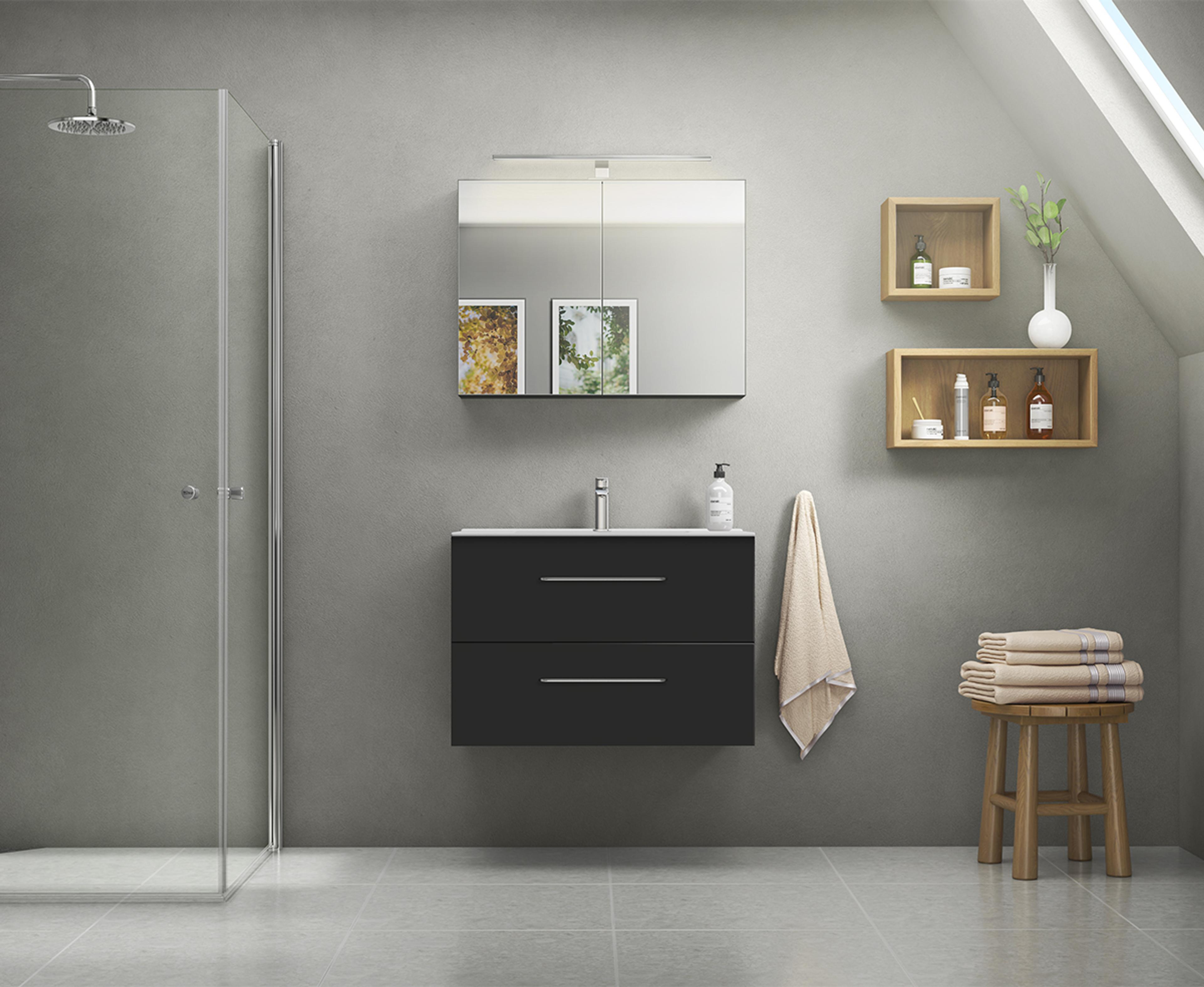 Baderomsmøbel i grå matt som inkluderer servantskapet (79,7x55x45,6 cm) med to skuffer og håndtak i krom. Heldekkende tynn porselensservant (81x17x46 cm) i hvit og speilskap (79,7x70x13,6 cm) med to-sidig speil, myktlukkende hengsler og toppmontert LED-lampe. Velg mellom flere ulike overflater og størrelser. Pris uten servantkran. Mål B x H x D: 81x56,8x46 cm
