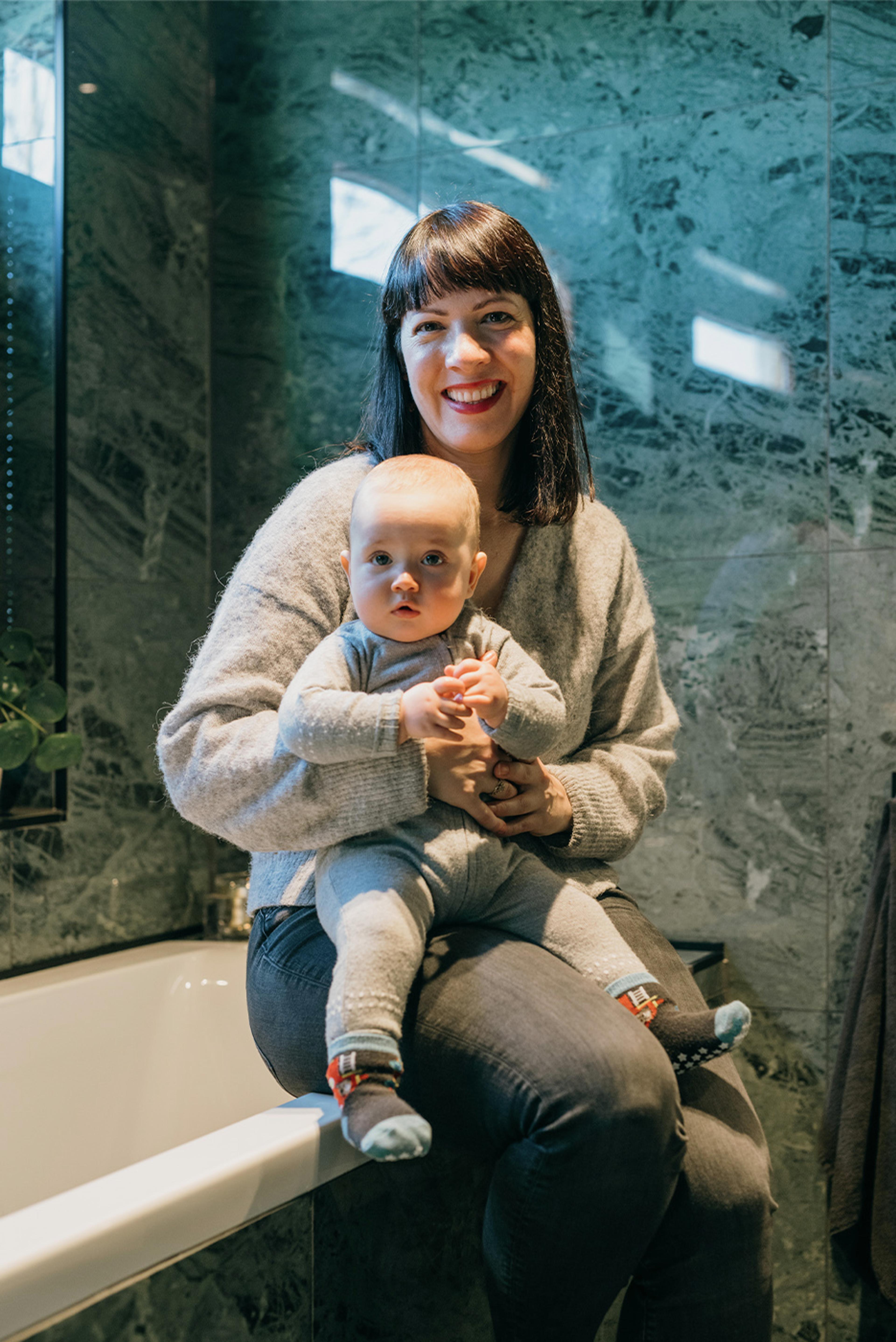 – Selv om vi senere skal flytte stellebordet er vi glad for at vi endte opp med denne løsningen. Det er egentlig ganske bra for det ble bedre plass inn mot dusjen, forklarer Sunniva og smiler til minstemann som sitter trygt på armen hennes.