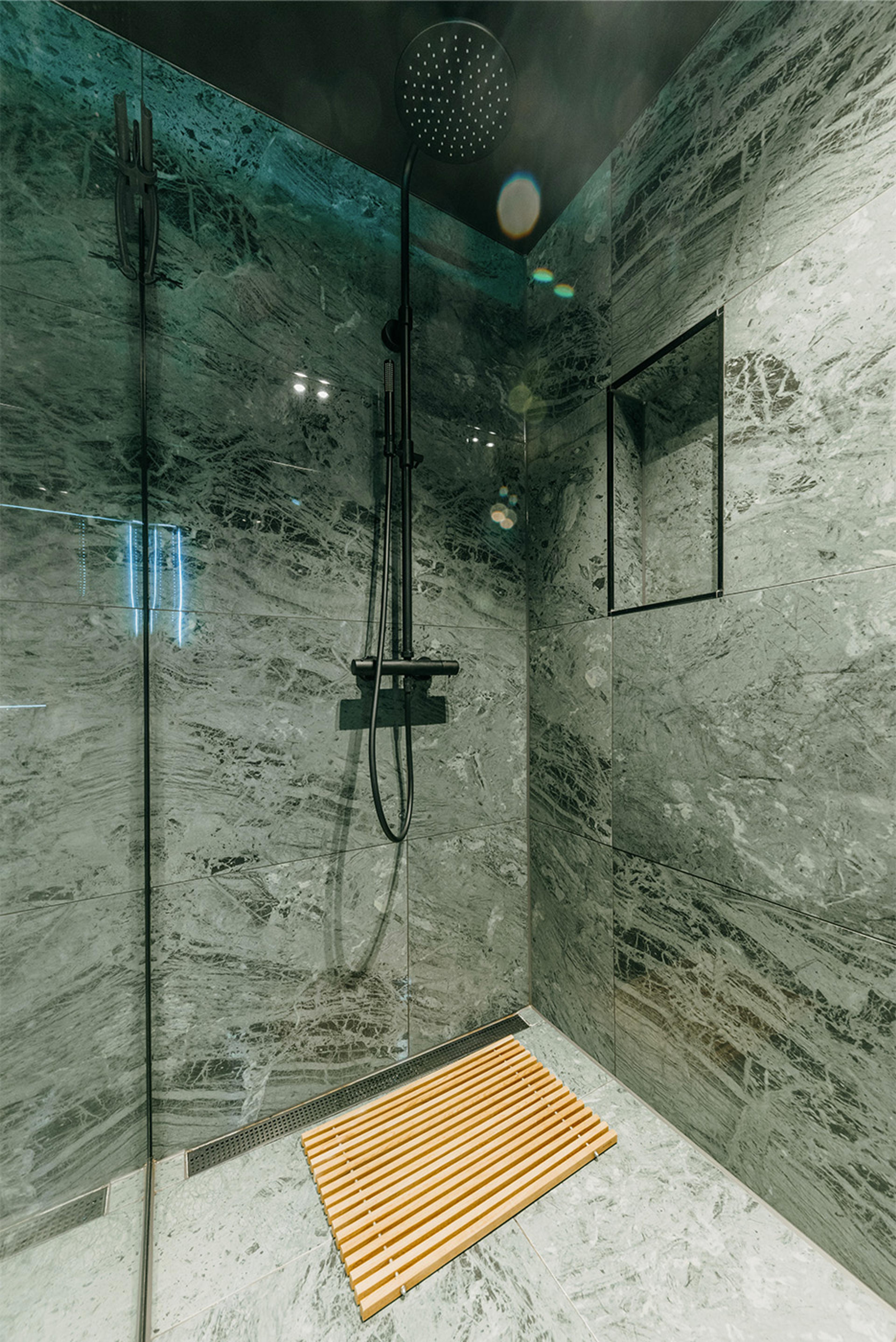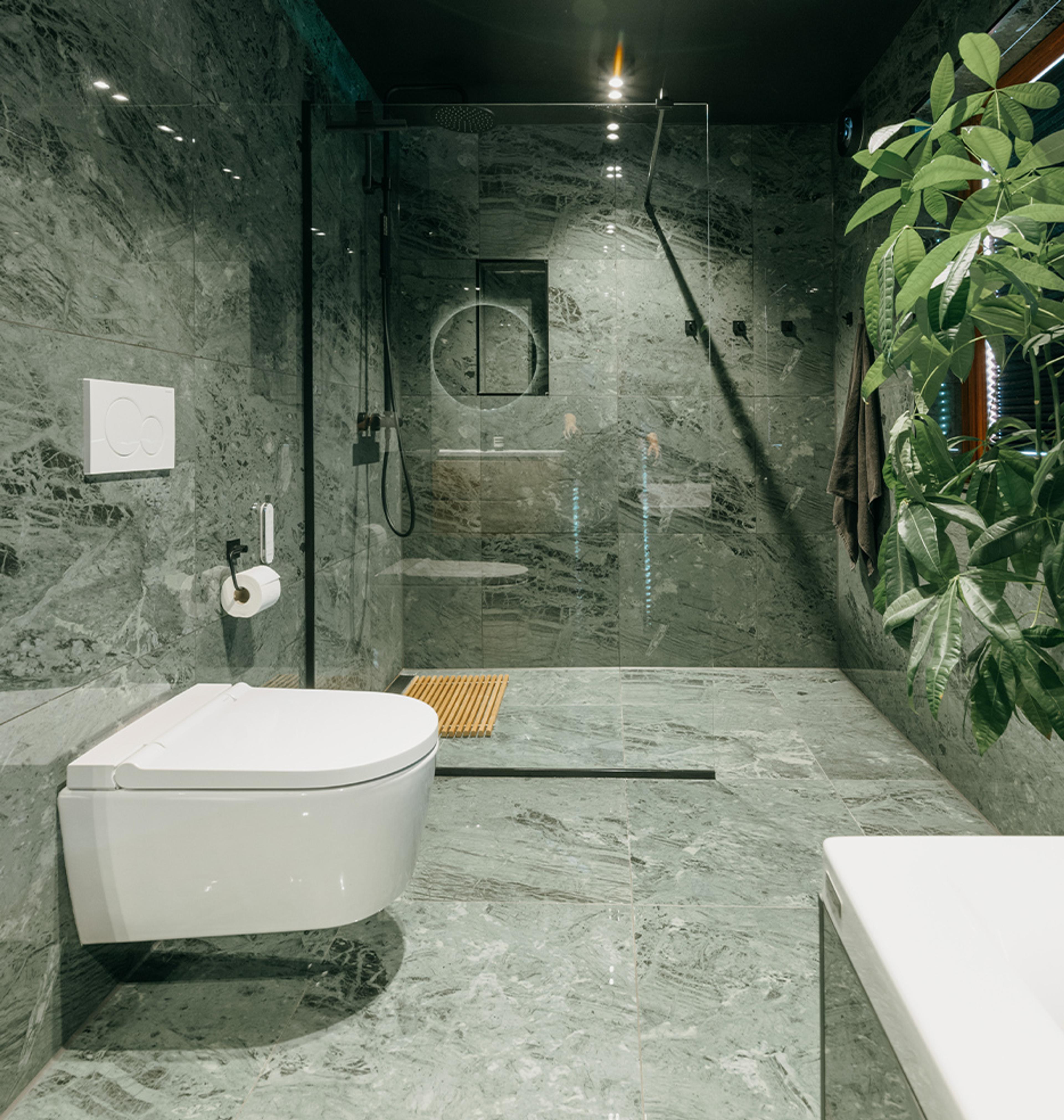 MANGFOLDIG GRØNT: De mørkegrønne marmorflisene står i fin kontrast til de sorte detaljene som går igjen på badet. Sunniva har også valgt å dra inn naturmaterialer og grønne planter for å skape en ekstra koselig stemning. Den flotte dusjveggen «ARC 20 Frame» med sort profil er fra INR.