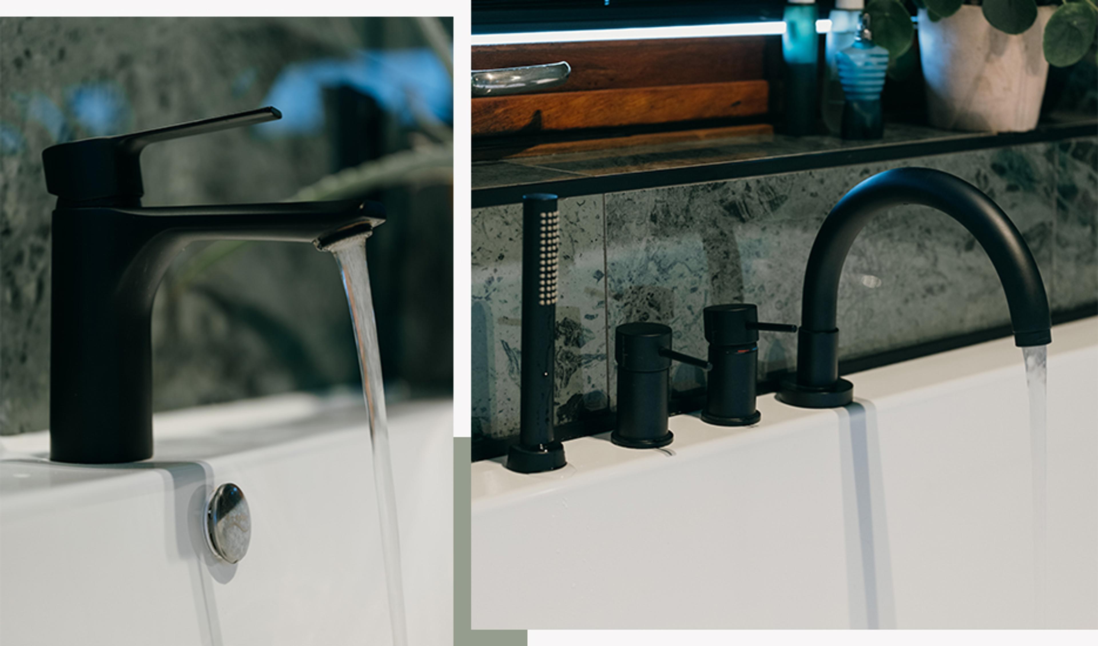 DEMPET SORT: Familien har valgt sorte detaljer på alt av kraner og tilbehør. Servantkran og karkantkran i sort matt. Se flere servantkraner og badekarkraner.