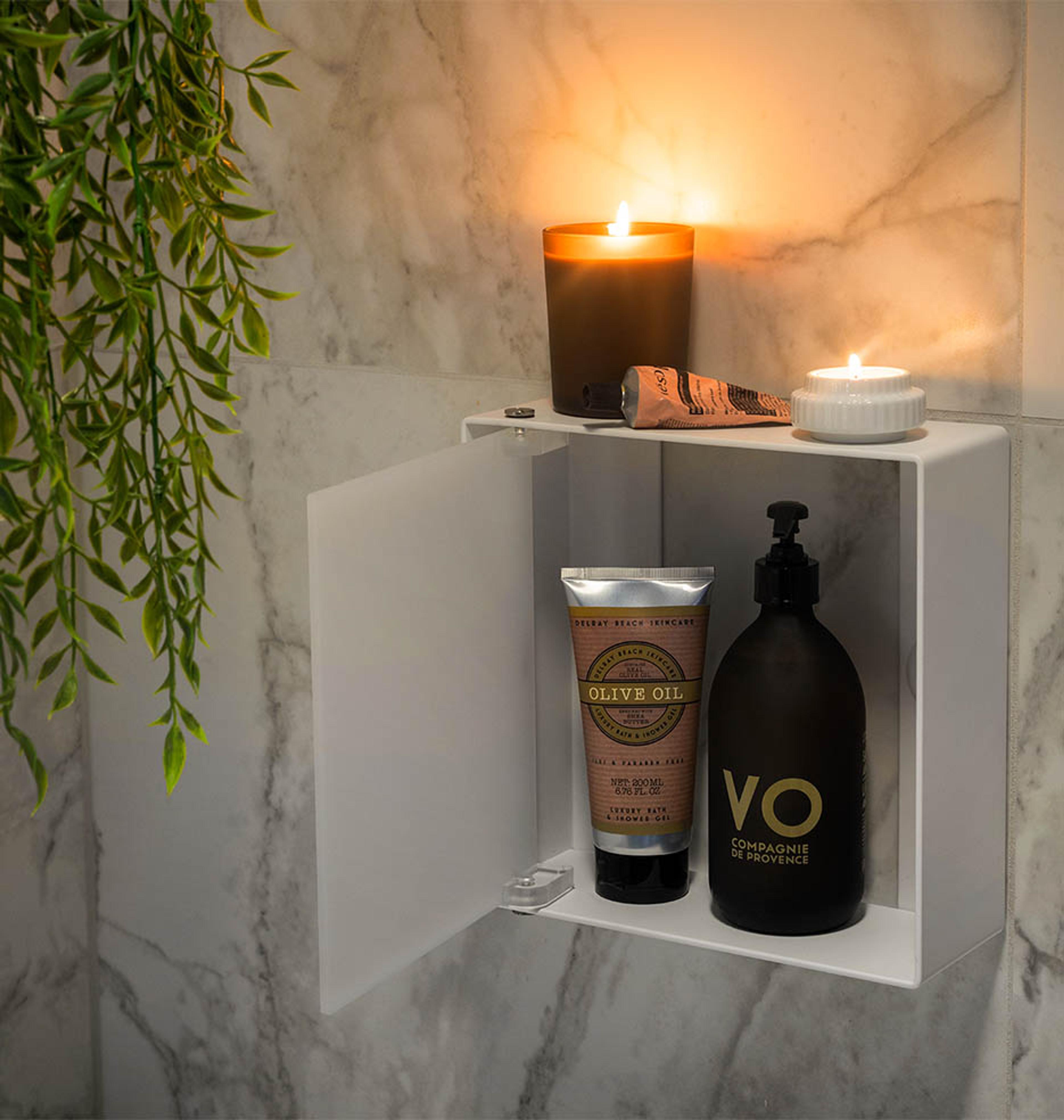 Lei av å se på flaskene med shampo og såpe når du står i dusjen? Med skapene «NEST» og "CASE" fra INR holder du flaskene godt skjult. Vipp ut den frostede døren, og hent ut produktene du trenger – når du trenger dem.