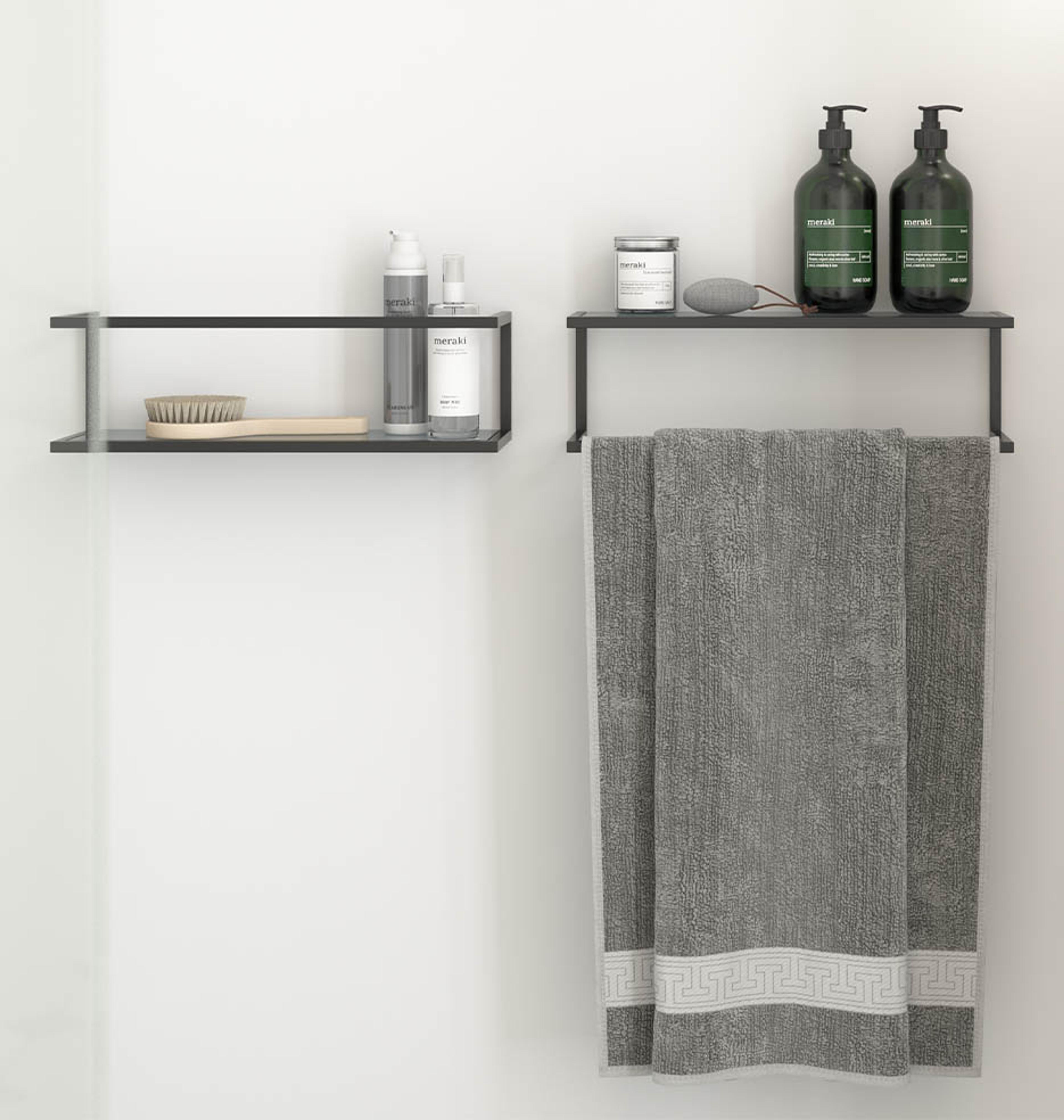 Hylle til oppbevaring, håndklestang – eller kanskje begge deler? De avtakbare glasshyllene gjør denne hyllen fra Dansani til et praktisk og stilsikkert innslag på baderommet.