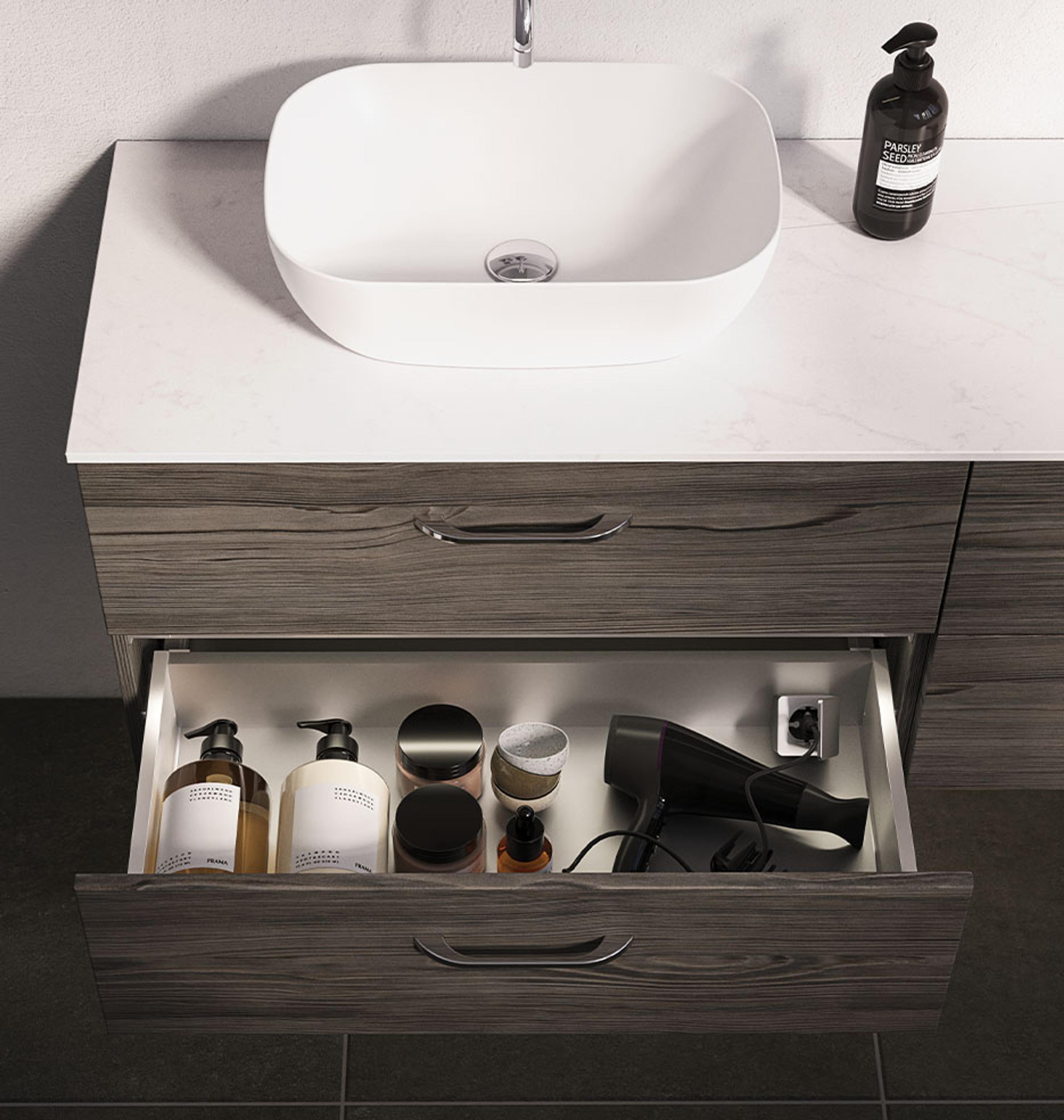 Med integrert stikkontakt i baderomsmøblene kan du flytte hårføneren, barbermaskinen og den elektriske tannbørsten ned i en skuff eller inn i et skap.