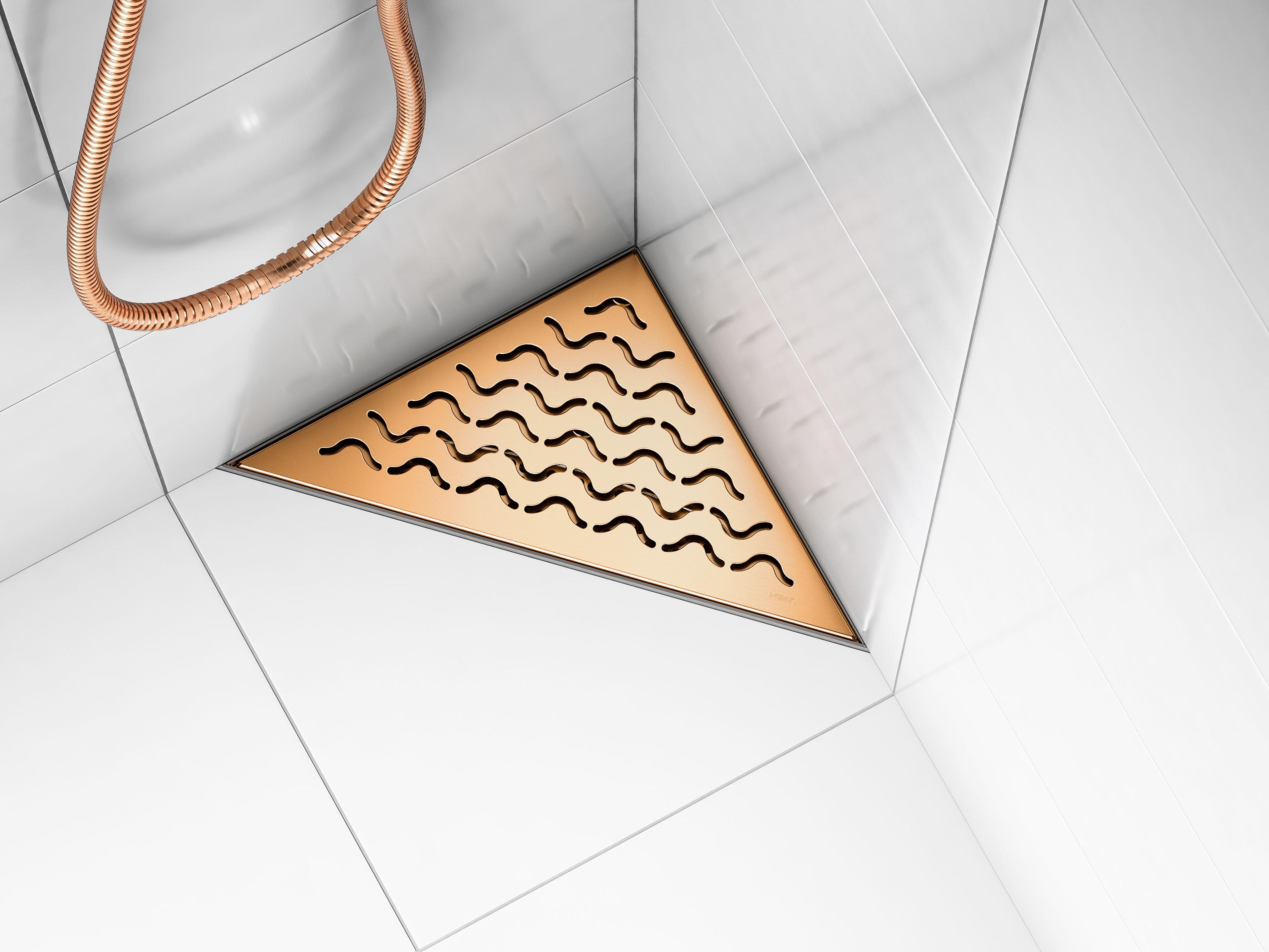 DESIGNSLUK I ROSEGULL: Purus Corner Wave i rosegull tilfører badet eleganse. Plasser den som du vil – inntil veggen, i hjørnet eller ute på gulvet som en avgrensning mot resten av rommet.