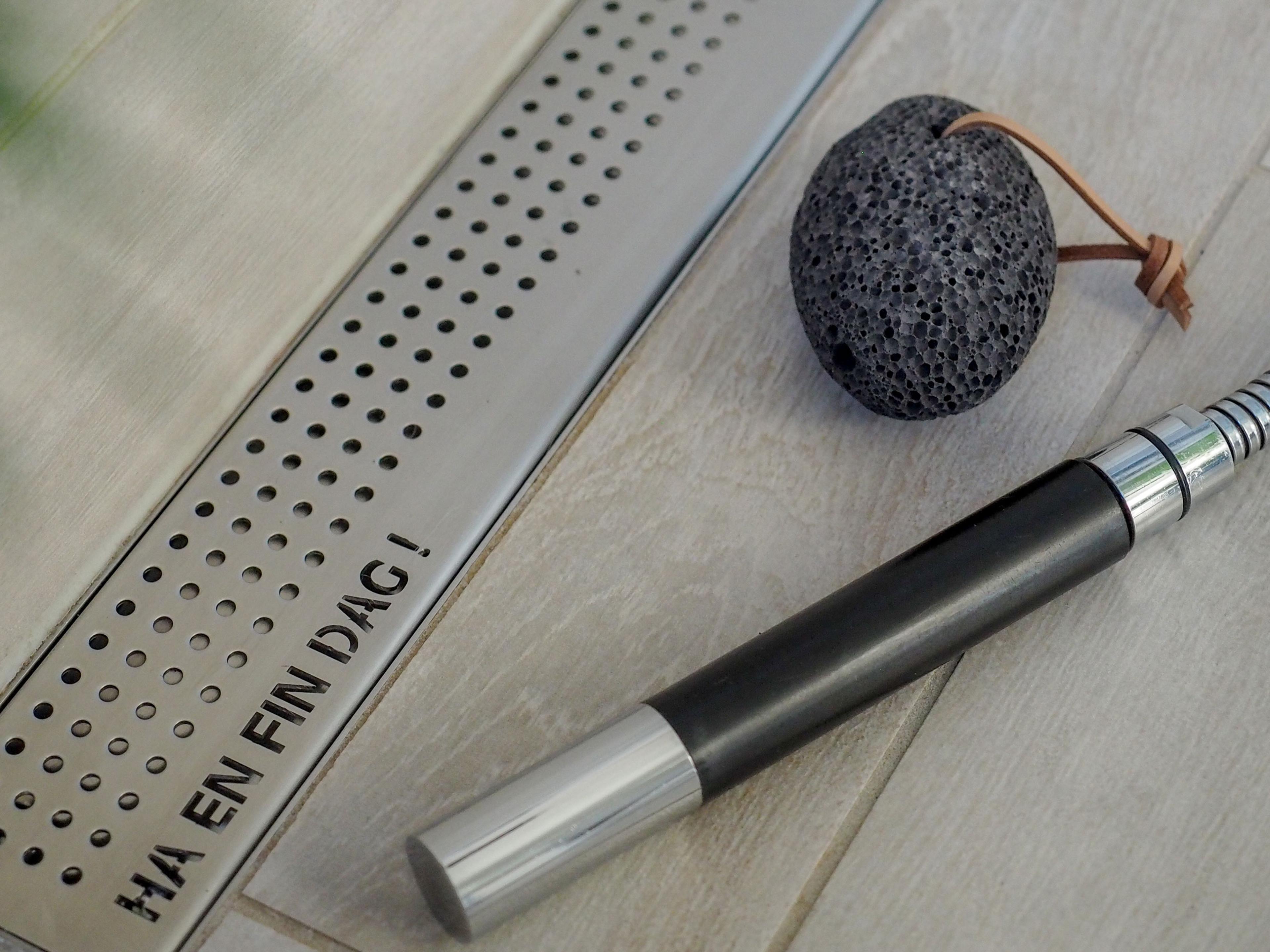 DESIGNSLUK FRA PURUS LINE: Purus-slukene kan graveres med den teksten du selv ønsker. Hva med å gi alle som bruker dusjen en god start på dagen med denne beskjeden? På bildet ser du Purus Line Pearl designsluk.