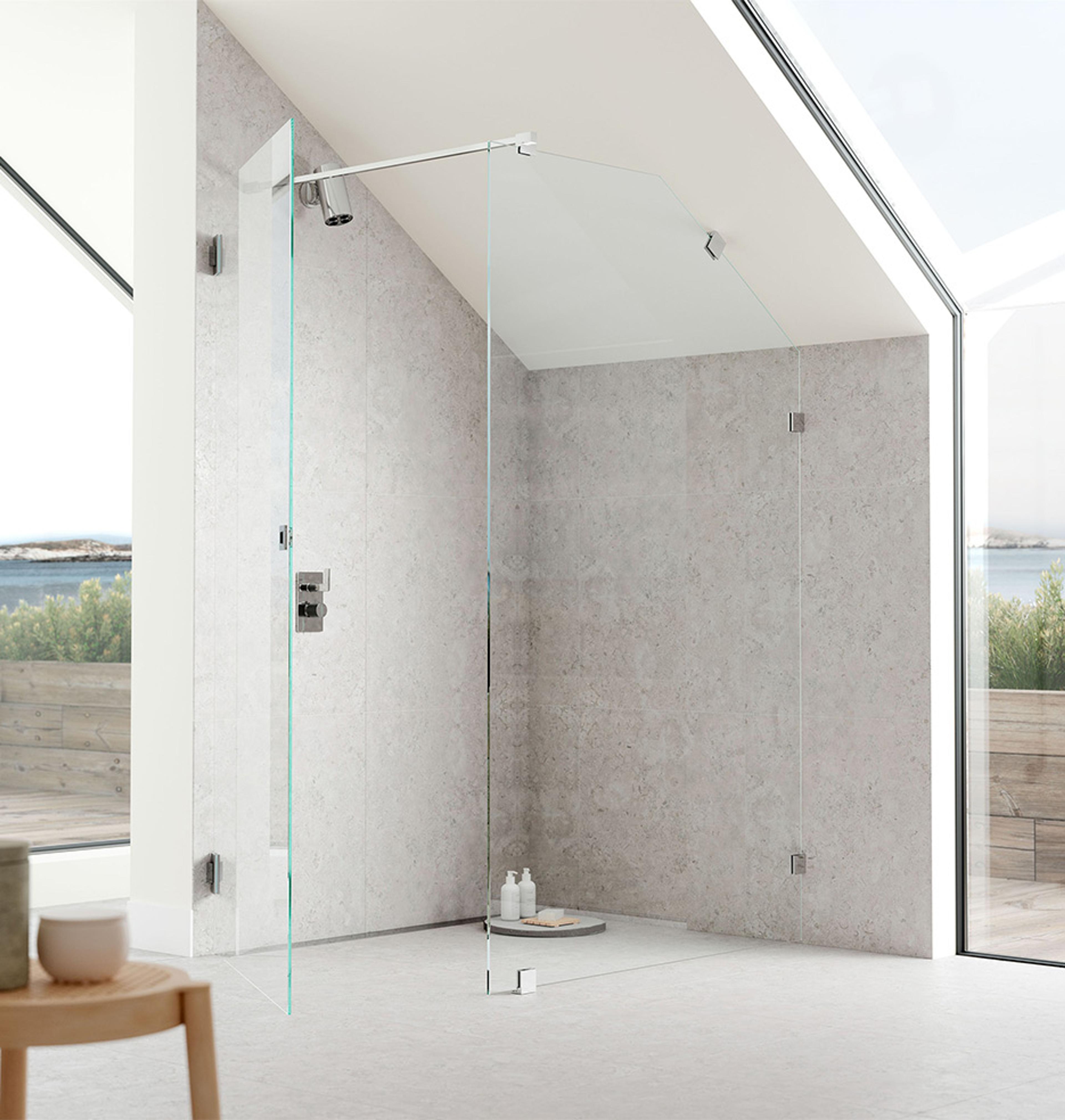 Et dusjhjørne vil gi badet ditt et lyst og moderne preg. Glassveggene er montert direkte på veggen, og du kan velge mellom et stort utvalg størrelser og muligheter for dører. Det gjør dusj-hjørne til en fleksibel og praktisk løsning, som er mye benyttet på nyere baderom.