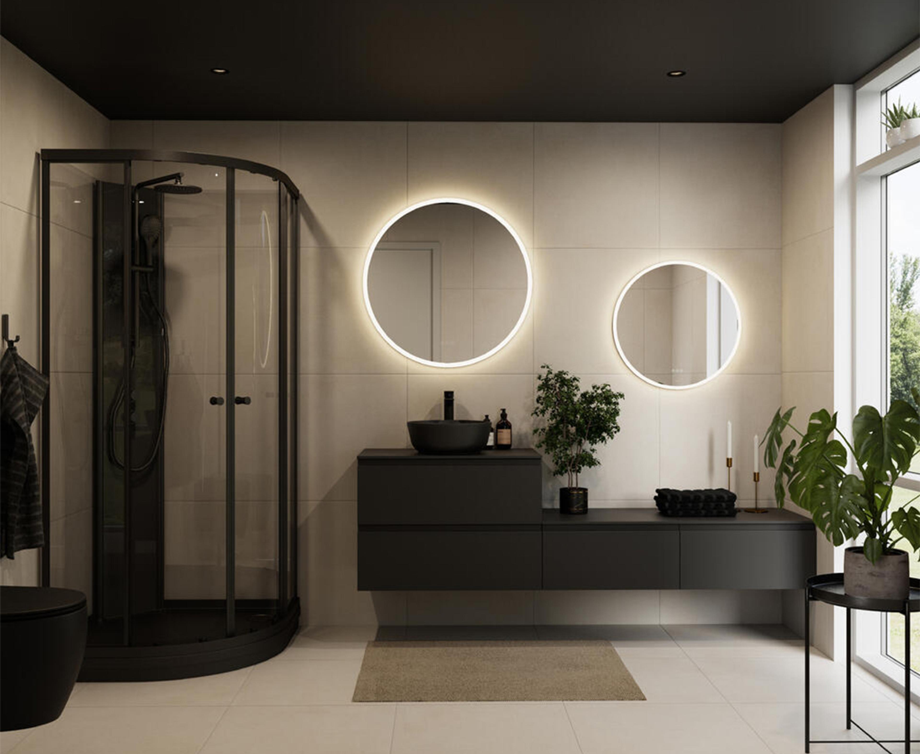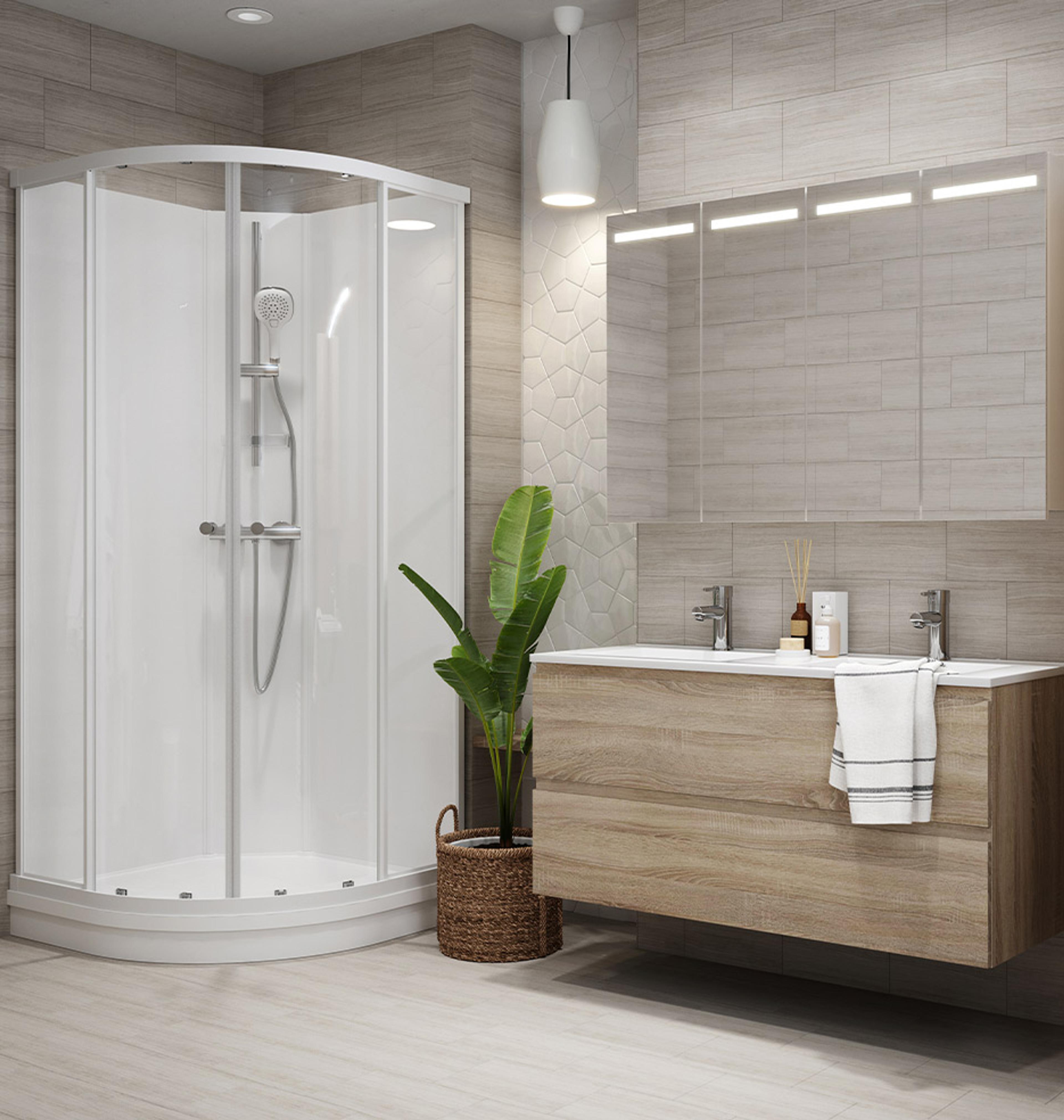 Baderomsmiljø med VikingBad Sofia dusjkabinett og INR ARC dusjveggmed Showerama 10-5 Comfort dusjkabinett og INR ARC dusjvegg