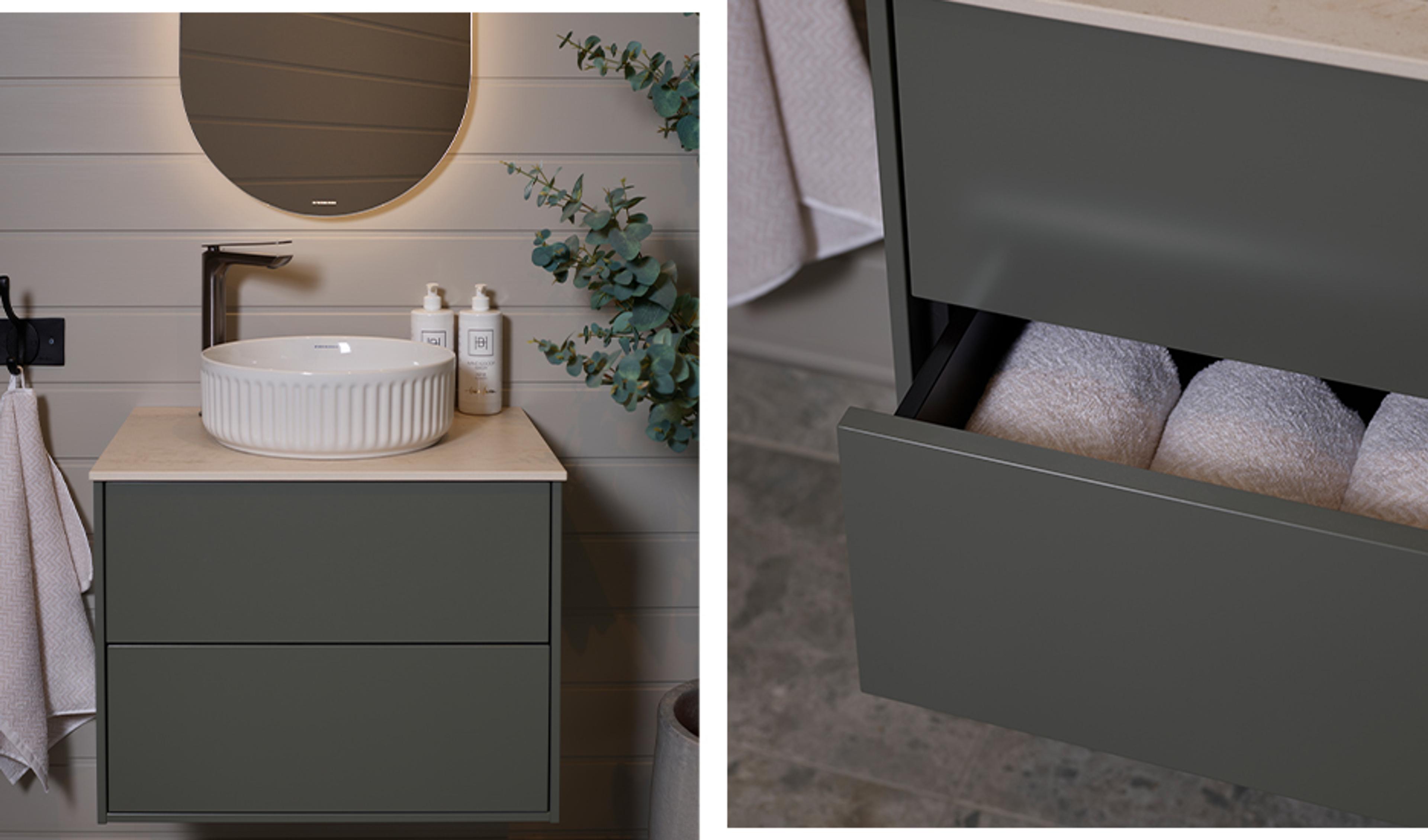 Ulike kombinasjonsmuligheter: Du velger selv om du vil ha skuffer eller åpen oppbevaring - eller hva med begge deler? | Svedbergs Epos by Halvor Bakke baderomsmøbel i fargen salvie, 60 cm bredde