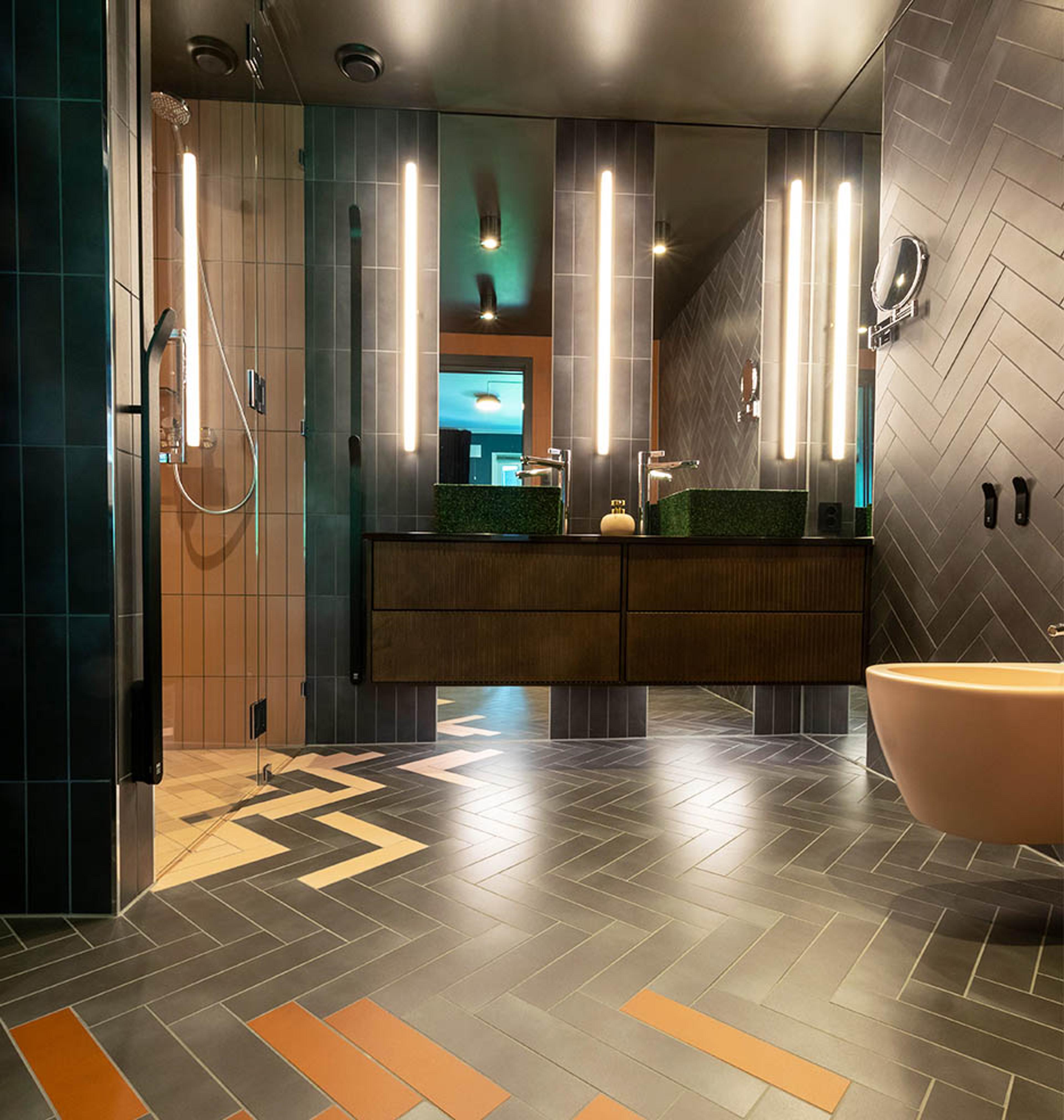 DETALJRIKT BAD: Ingenting er overlatt til tilfeldighetene på det nye baderommet – fra hvordan fiskebensflisene er satt sammen i ulike farger, ulik belysning, og til det spesiallagde speilet fra glassmester. Baderomsmøbelet «Epos» i brun ask er fra Svedbergs og er designet av Halvor Bakke.