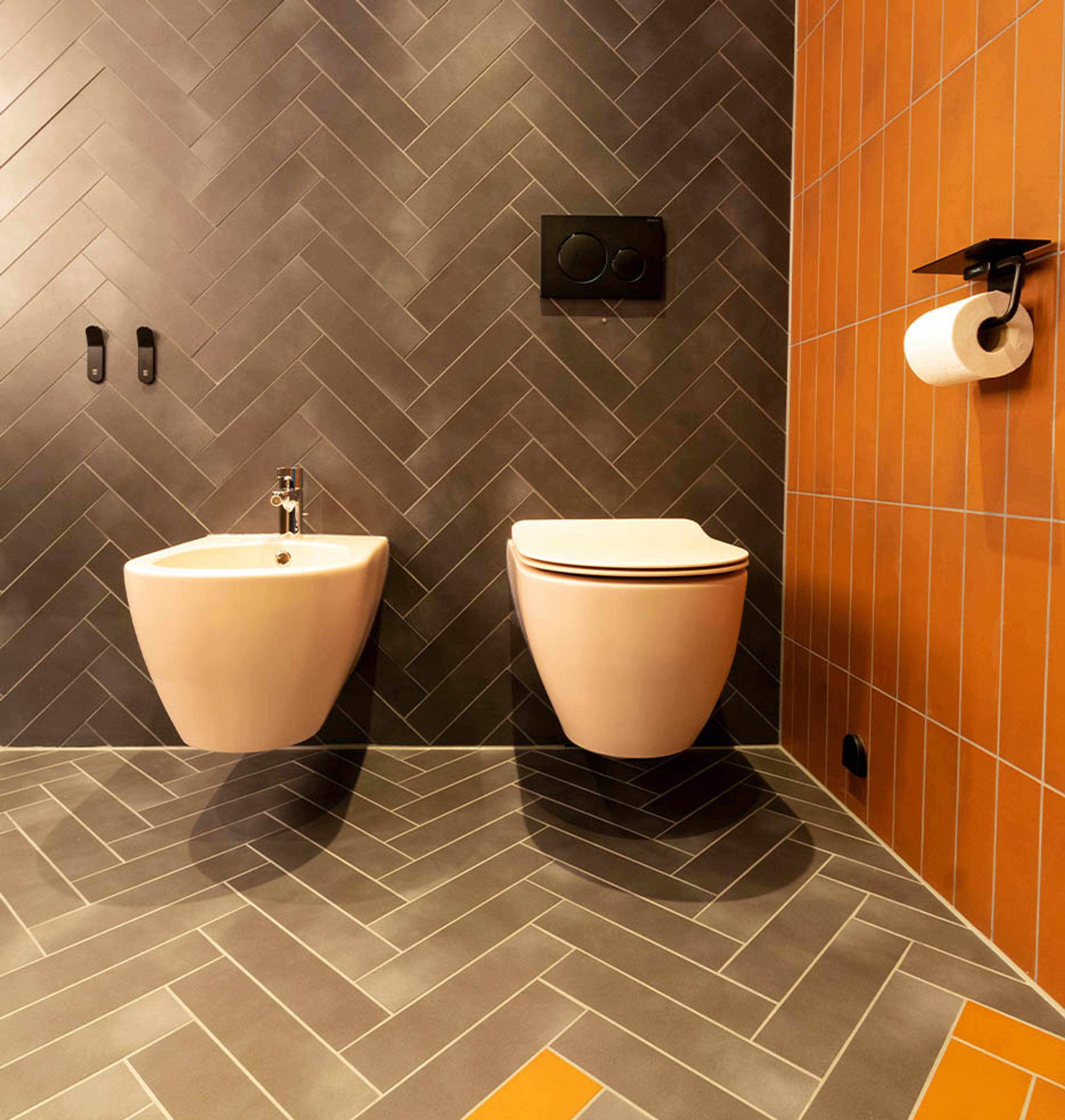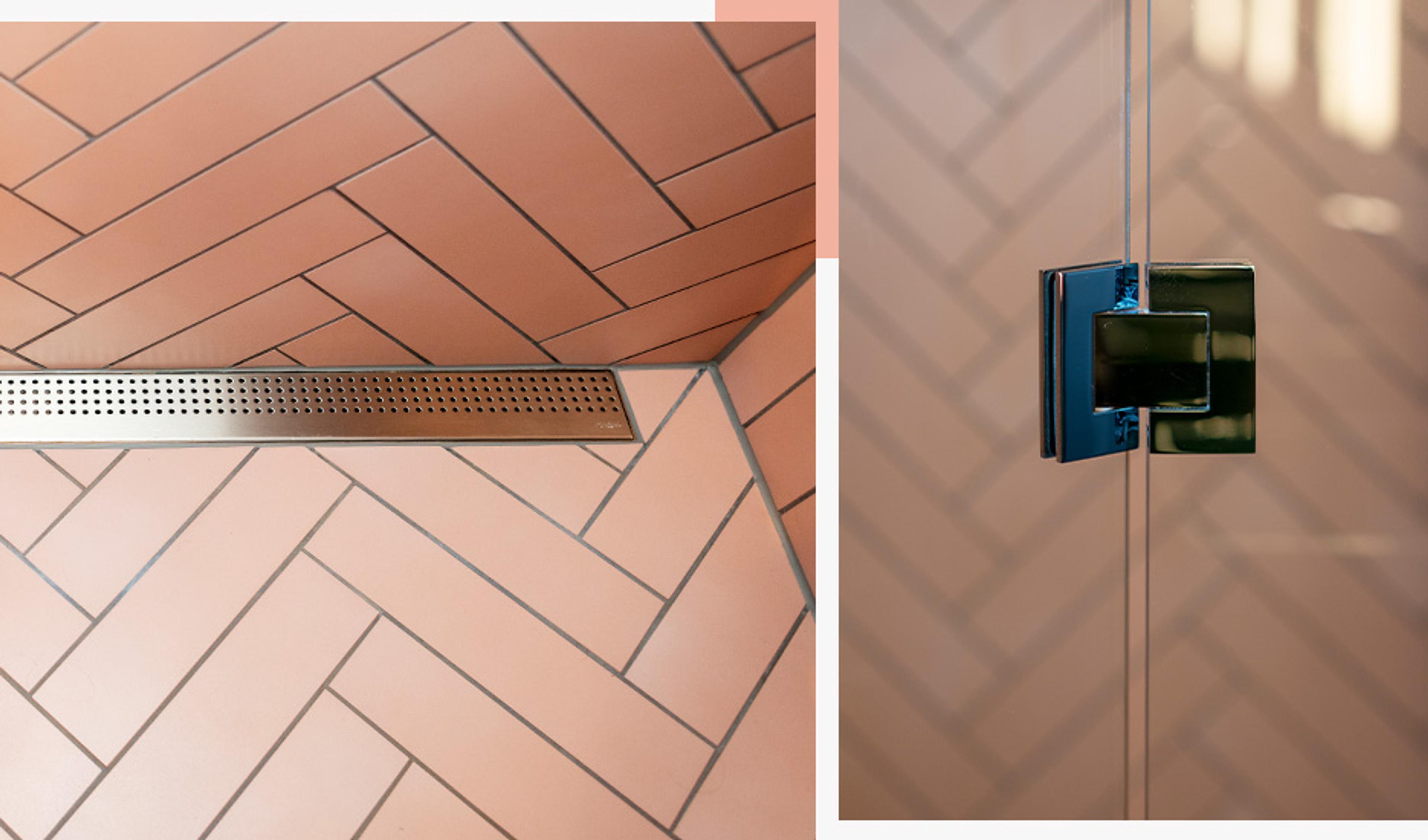 På gulvet har Tora og Morten tre forskjellige farger på flisene, som er lagt i fiskebensmønster. Dette gjør at terrakotta-fargen flyter over i en lun gråtone, som igjen går over til den myke rosafargen som også dekker veggene i dusjen.