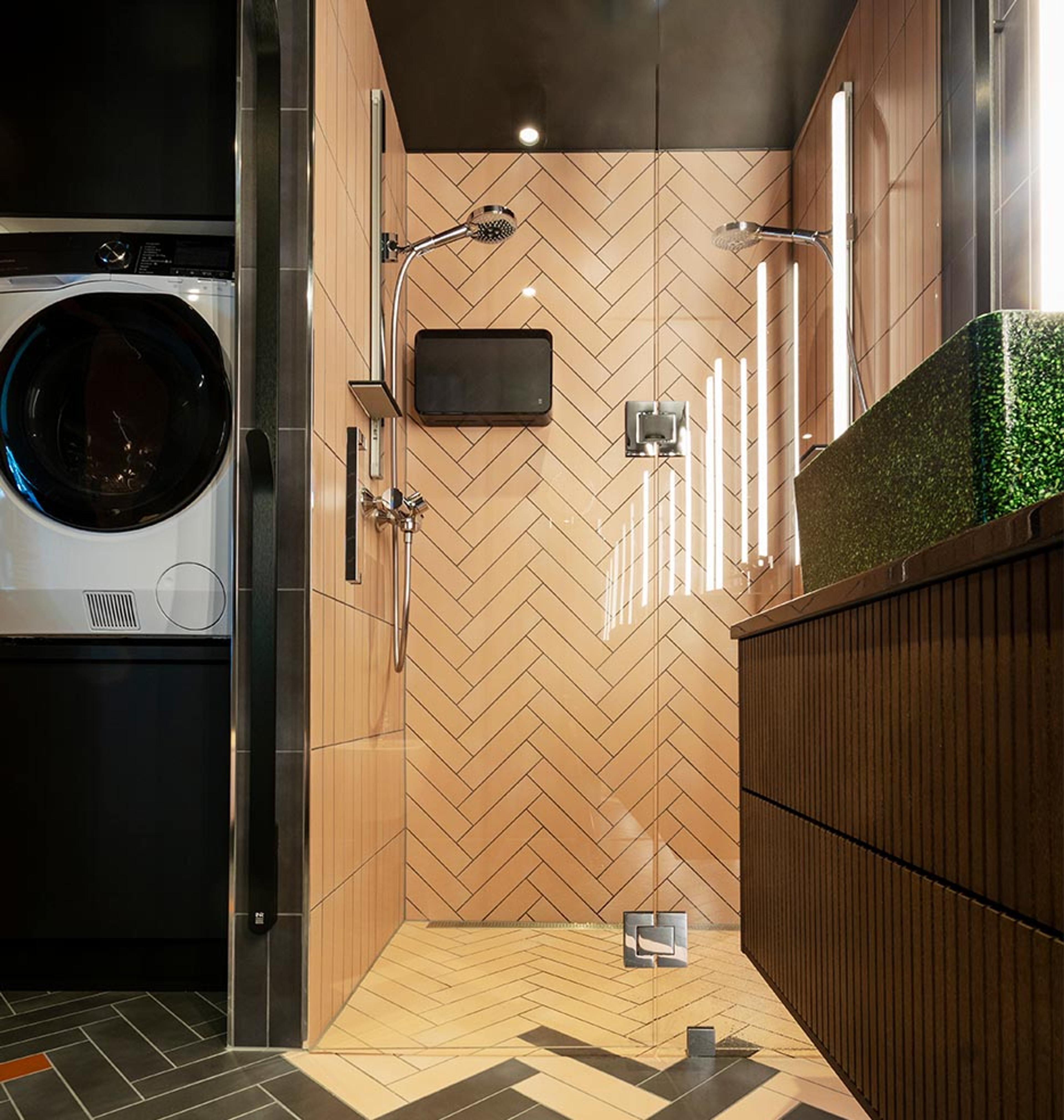 MYKE DRÅPER: Flisenes myke rosa-nyanse skaper en avslappende atmosfære i dusjsonen. Tora og Morten har gått for dobbel dusj fra Hansgrohe med den revolusjonerende dusjstrålen PowderRain. Dusjløsningen heter «ARC 5» og er fra INR.