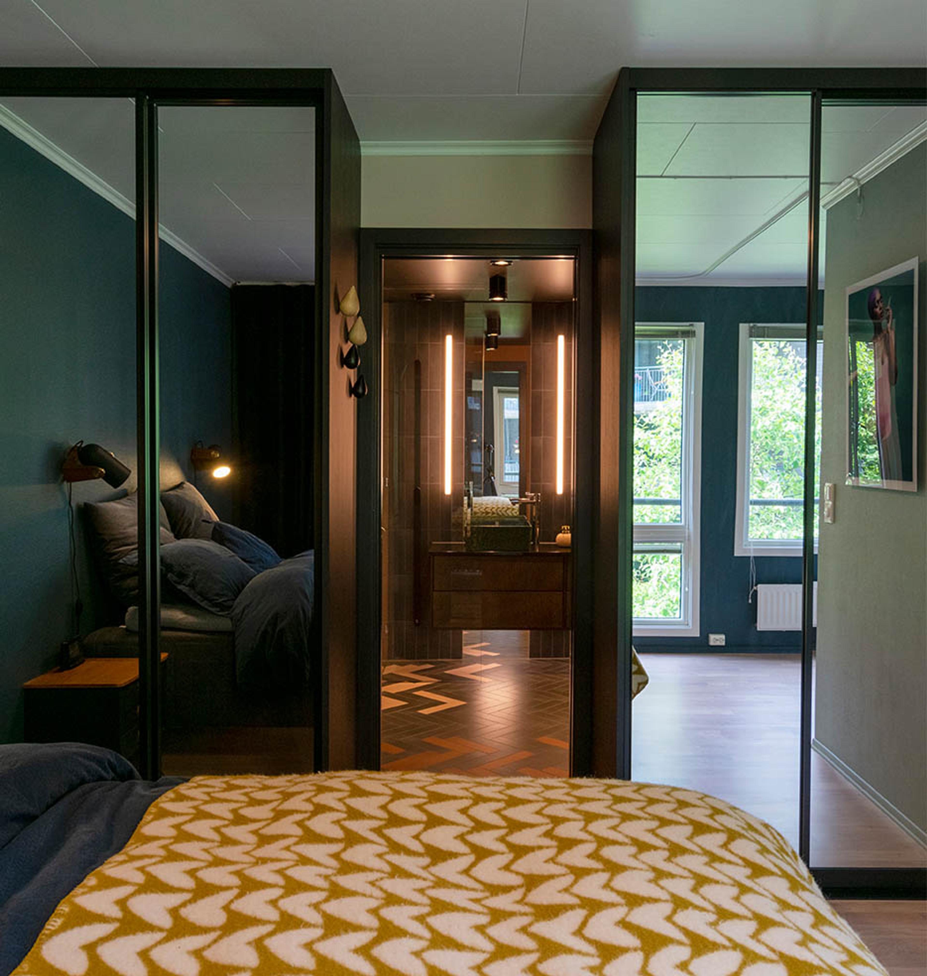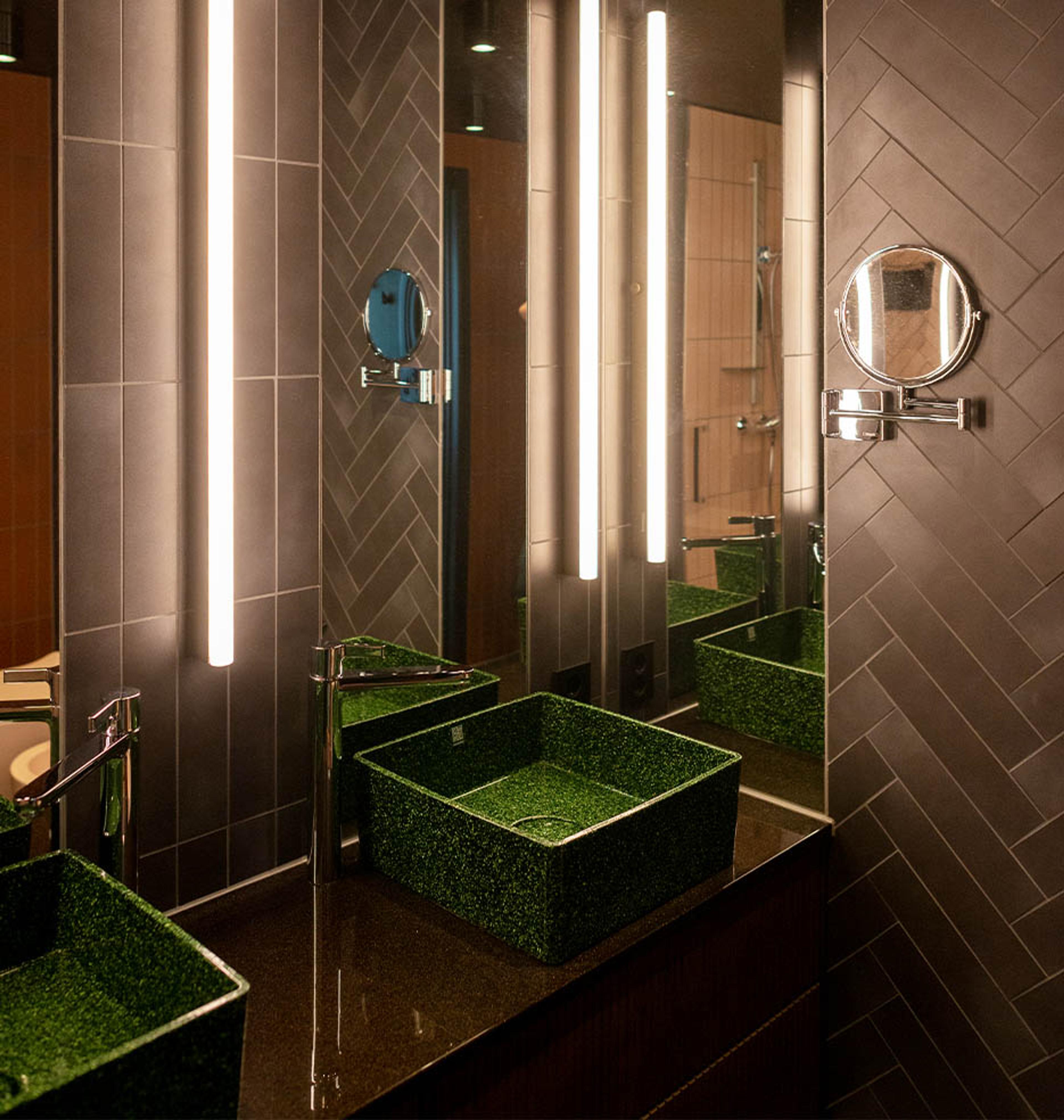 Spesiallagde speil er innfelt i veggen over hver vask, fortsetter under baderomsmøbelet og helt ned til gulvet. Sammen med nattlyset under møbelet er den med på å gjøre rommet større, og gir det en lun belysning. Ved hvert speil henger lange lysrør som står for store deler av det myke lyset på badet.