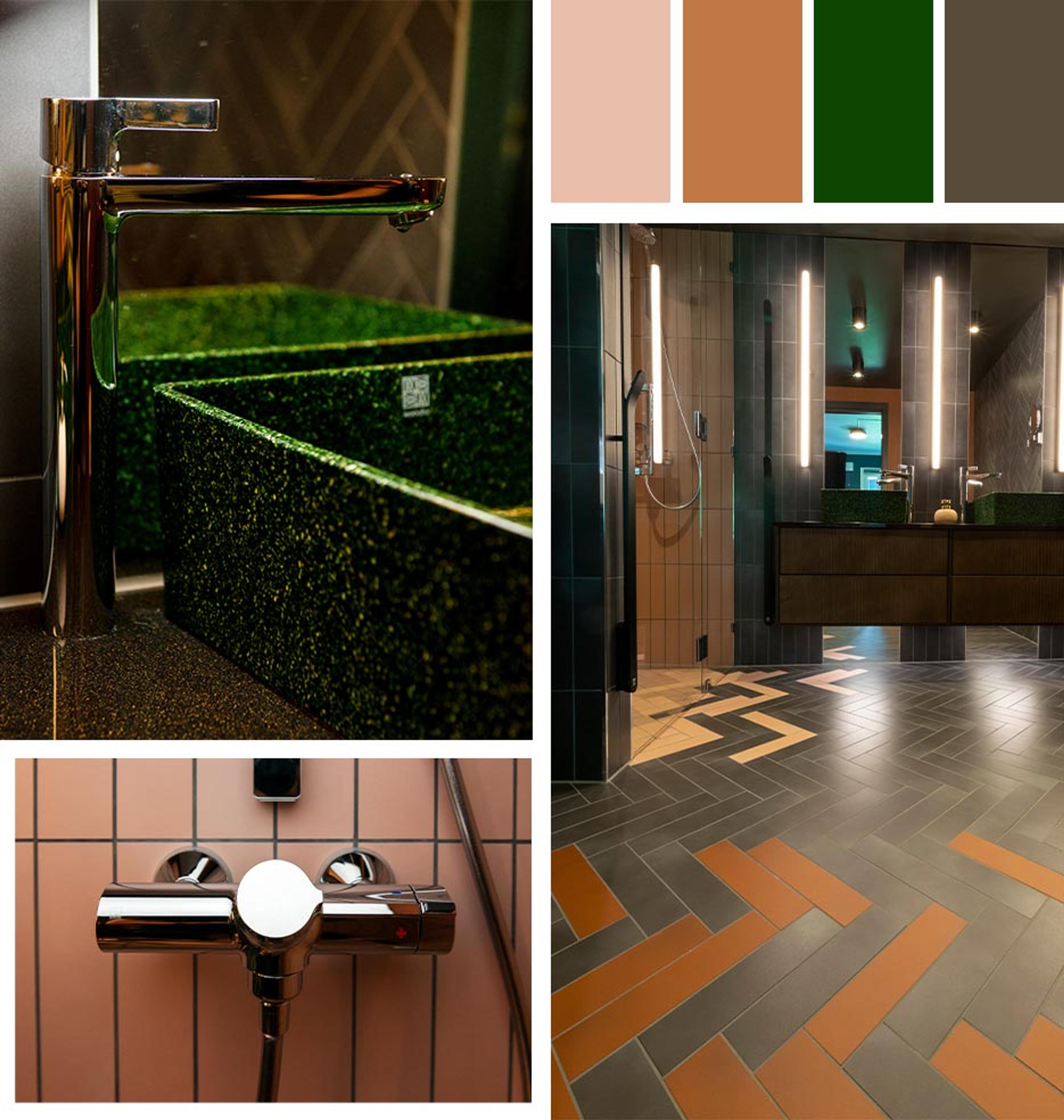 INSPIRERENDE FARGEVALG: Tora og Morten har turt å gå for rosa, terrakotta, mosegrønt og en varm gråtone både på fliser og materialer. Flisene heter «Aleluia Detroit», og i fargene Carbon, Rose og Terracota.