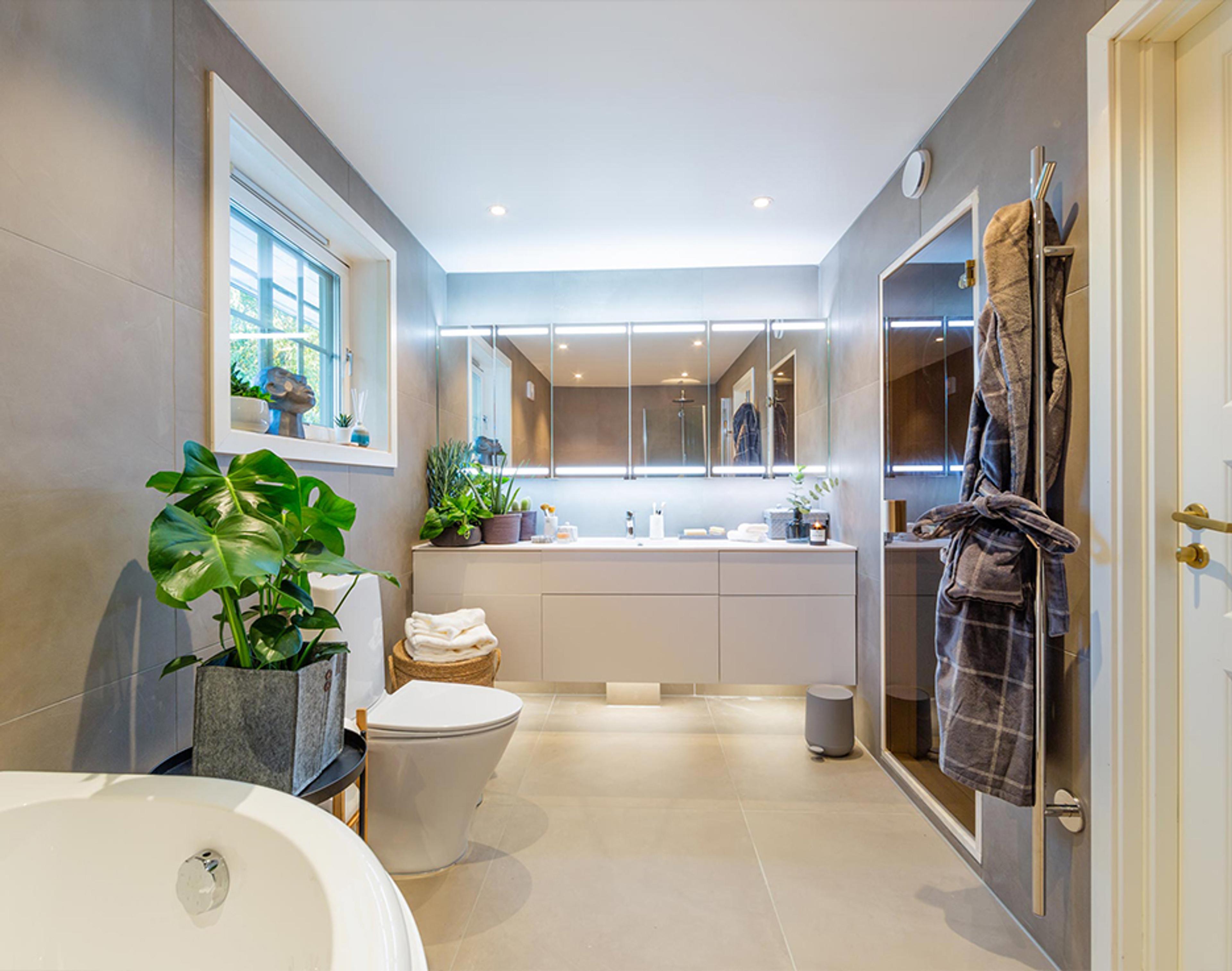 Slik fikk familien på Stange et funksjonelt drømmebad med store, naturfargede fliser og justerbar belysning.