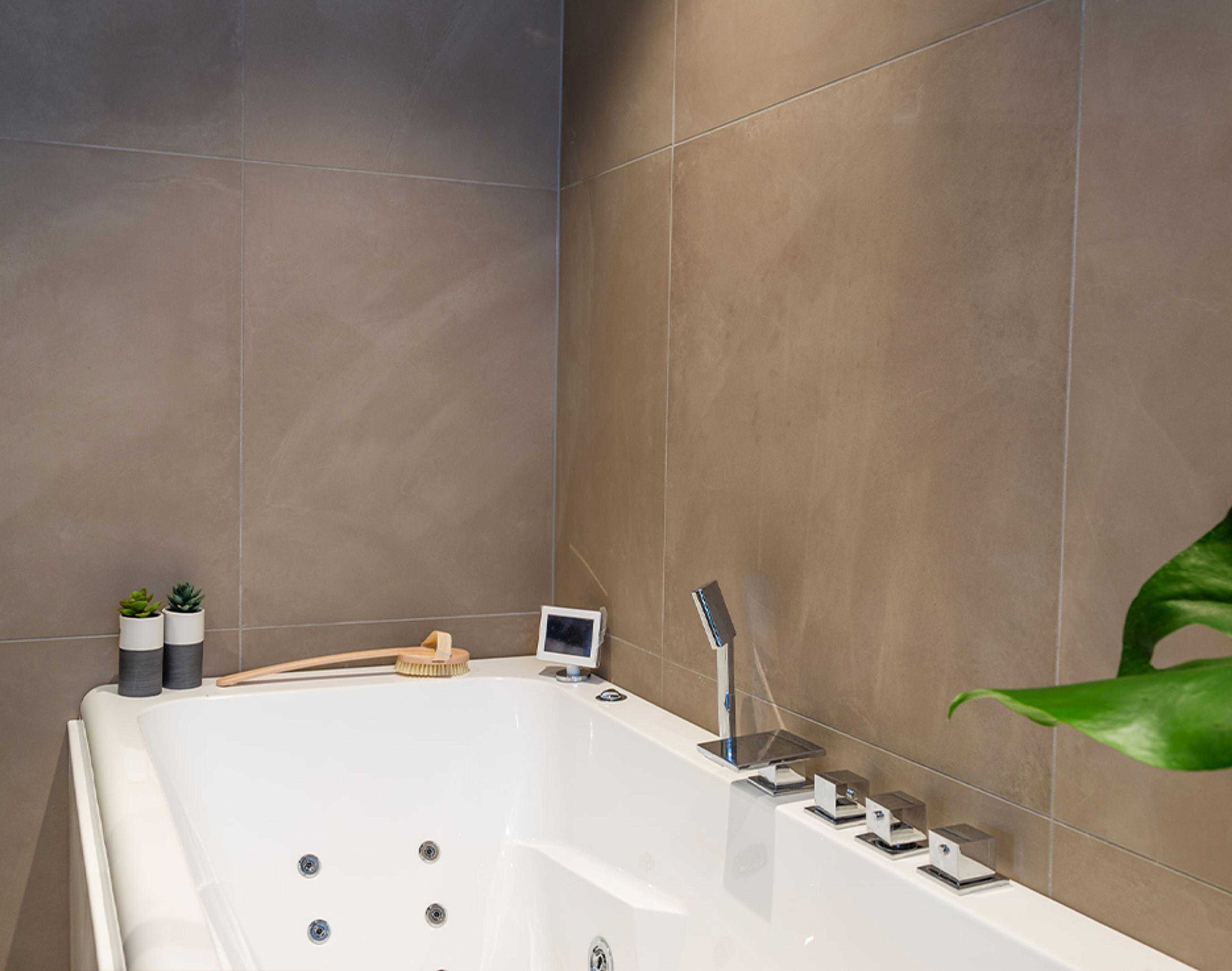 STORE FLISER: Med naturfargede fliser har badet fått et varmt og lunt uttrykk. Boblebadet fra Vikingbad er gøy for både store og små.