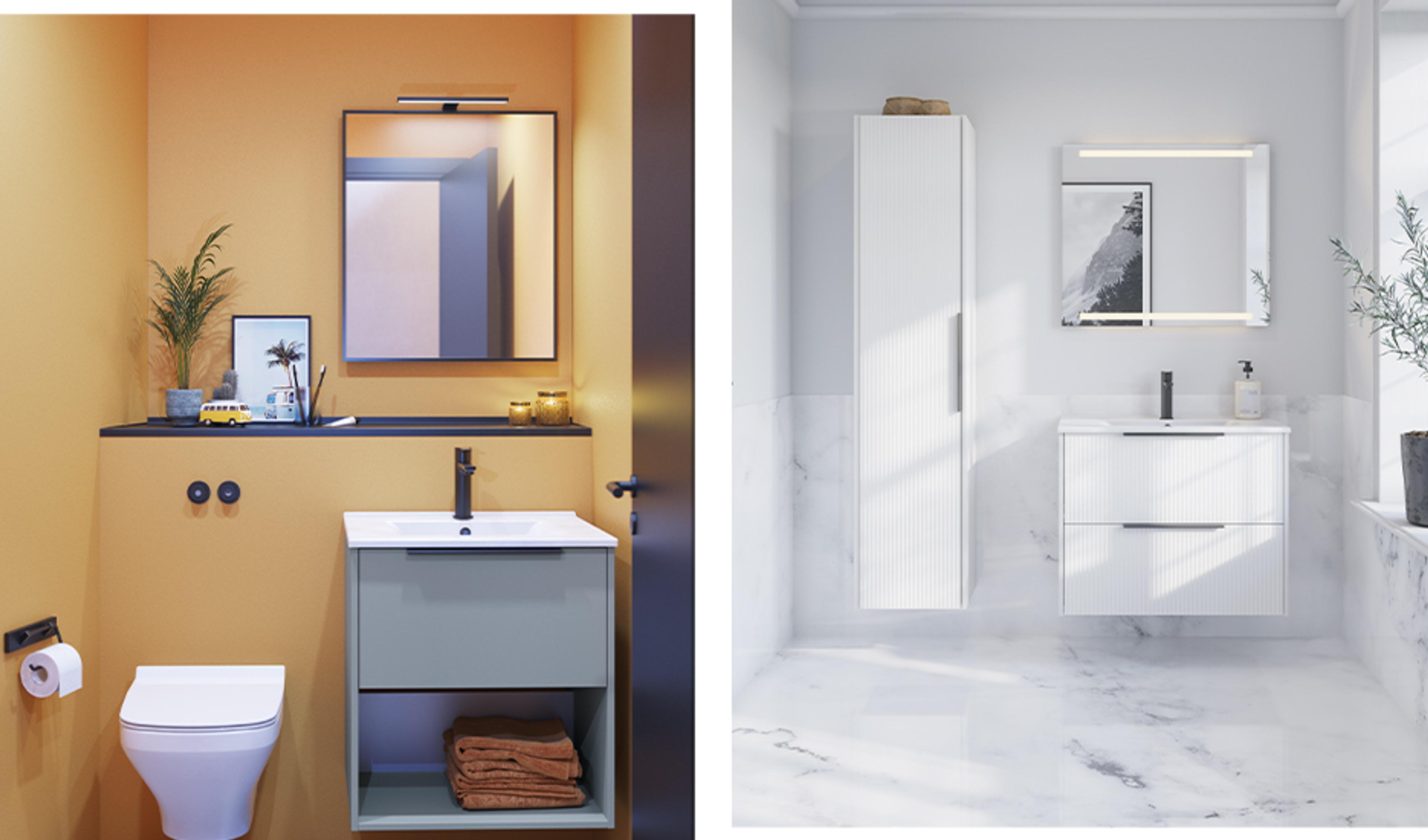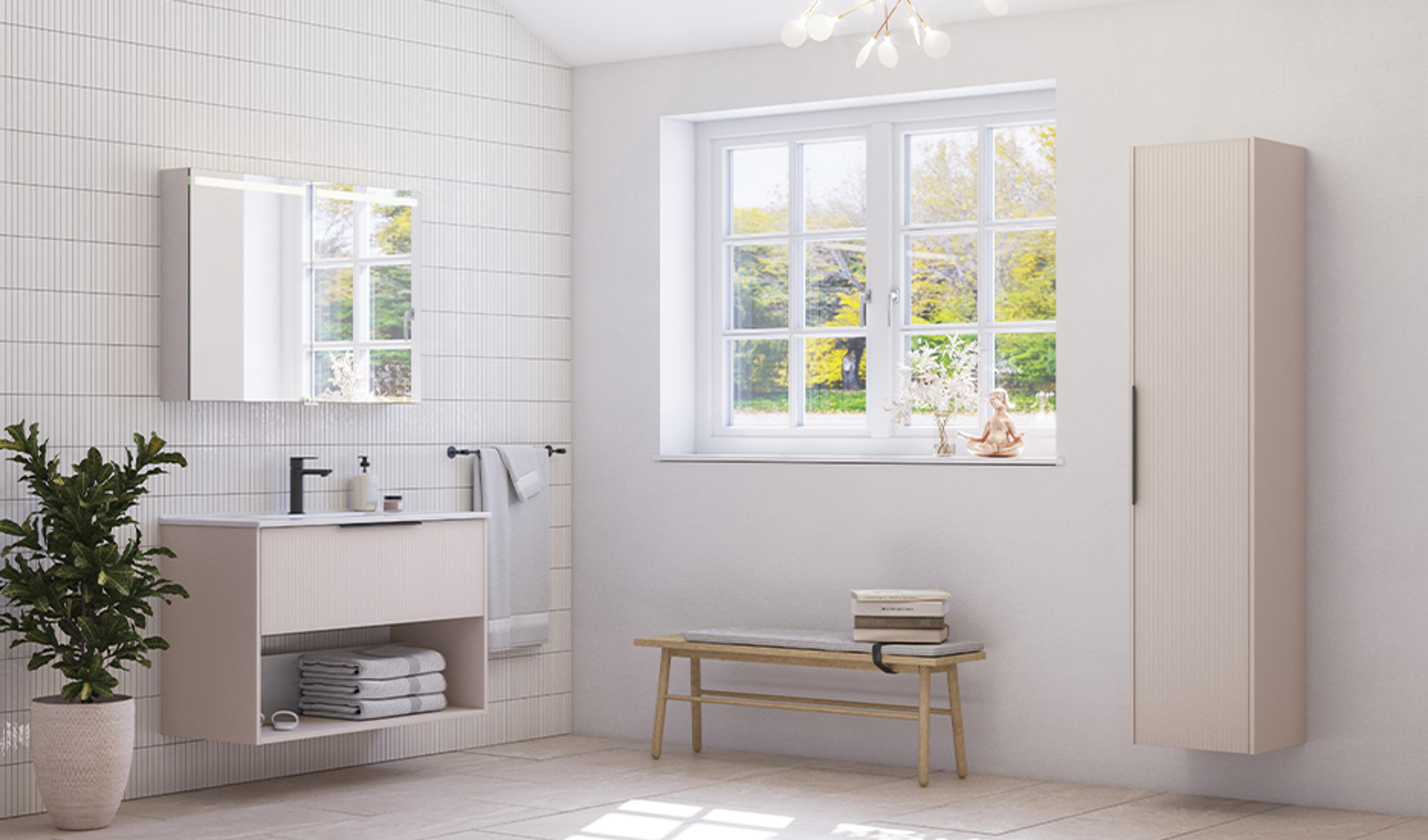 Perfekt for mindre hyttebad – Inzo-møblene kombinerer elegante linjer med maksimal lagringsplass.