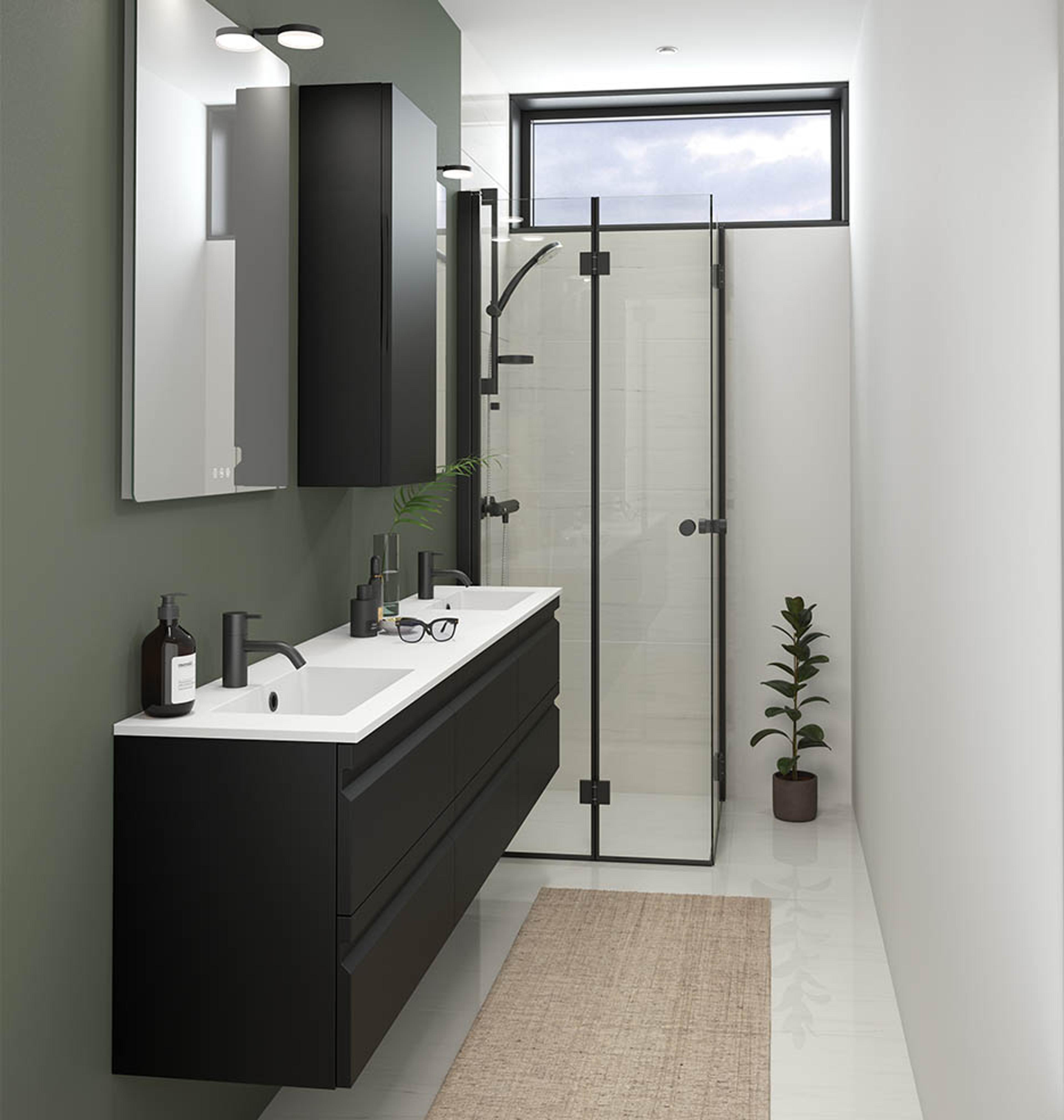 Har du et langt, men smalt baderom kan det være lurt å utnytte veggplassen uten at du mister albuerom eller muligheten til å være flere på badet samtidig. Dansani gir deg muligheten til å velge en smalere dybde på servantskapet.