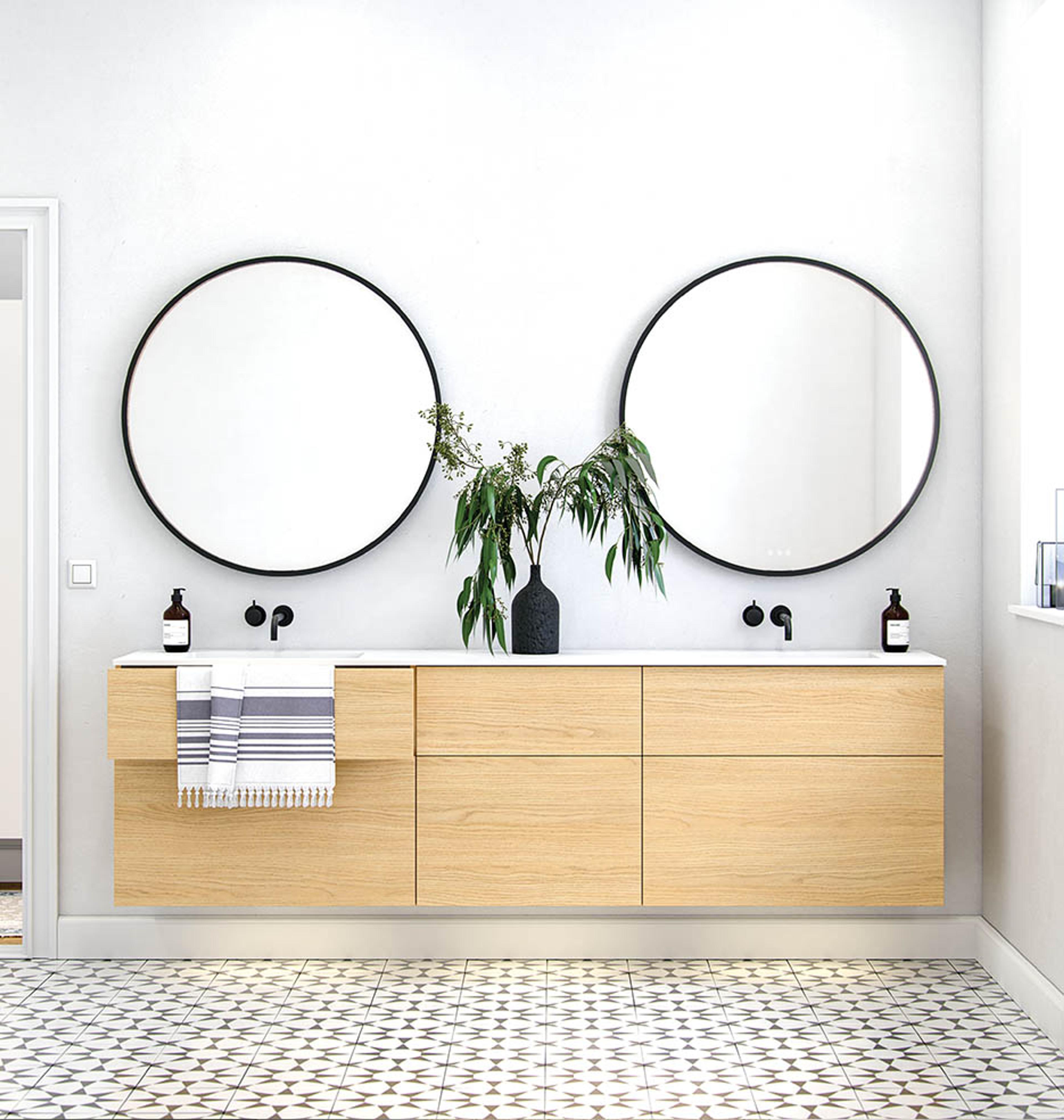 ROM TIL FLERE: «Inzo» 220 cm baderomsmøbel fra Dansani i nordisk eik med dobbel servant, og «Moon»-speil med sort ramme.