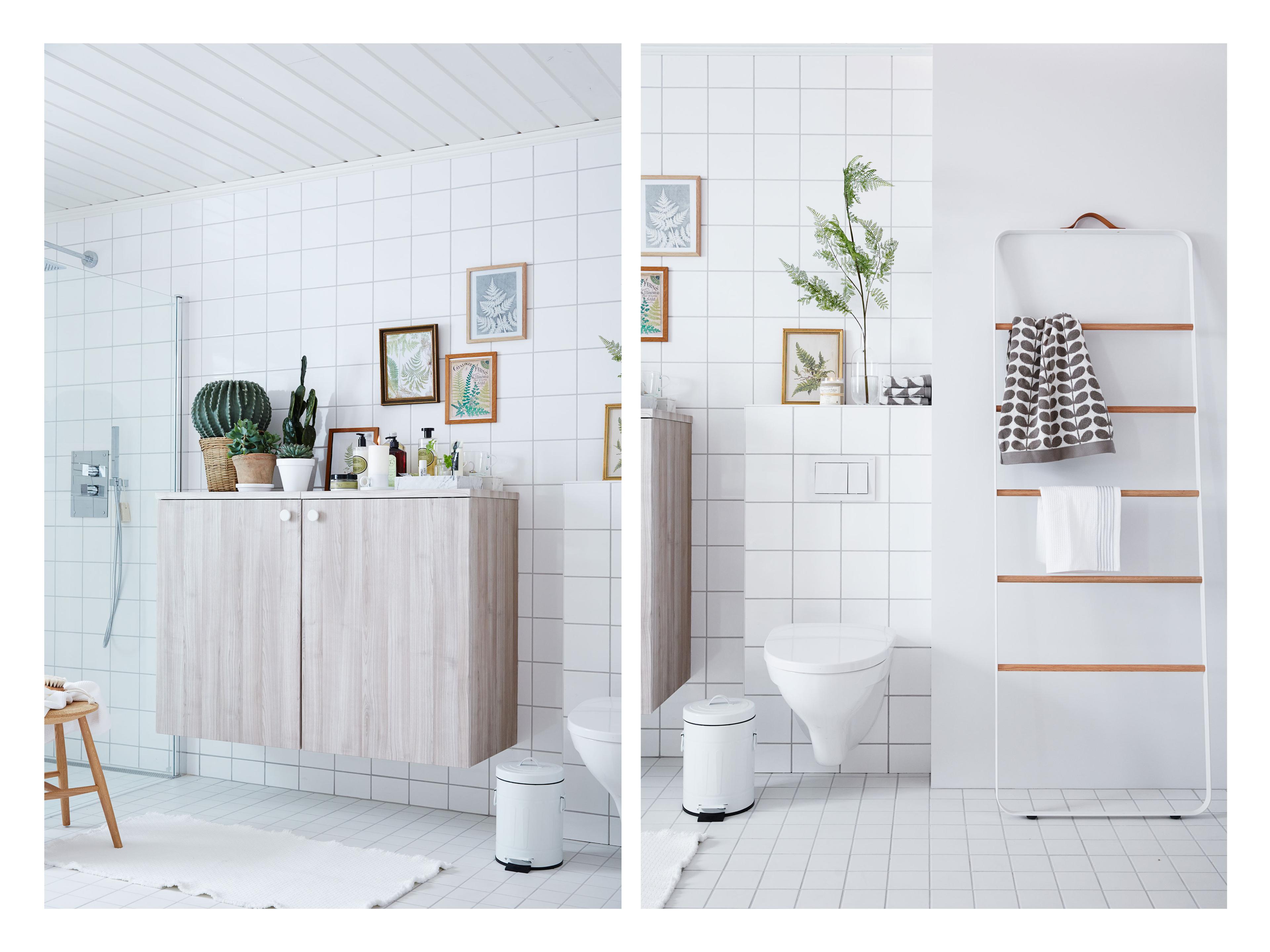 Ønsker du ekstra mye oppbevaring, kan du henge opp to vegghengte høyskap ved siden av hverandre som en kommode – slik Susanne har gjort på bildene under. Da får du god plass til gode, myke håndklær, bugnende grønne planter, fine skåler og duftlys.