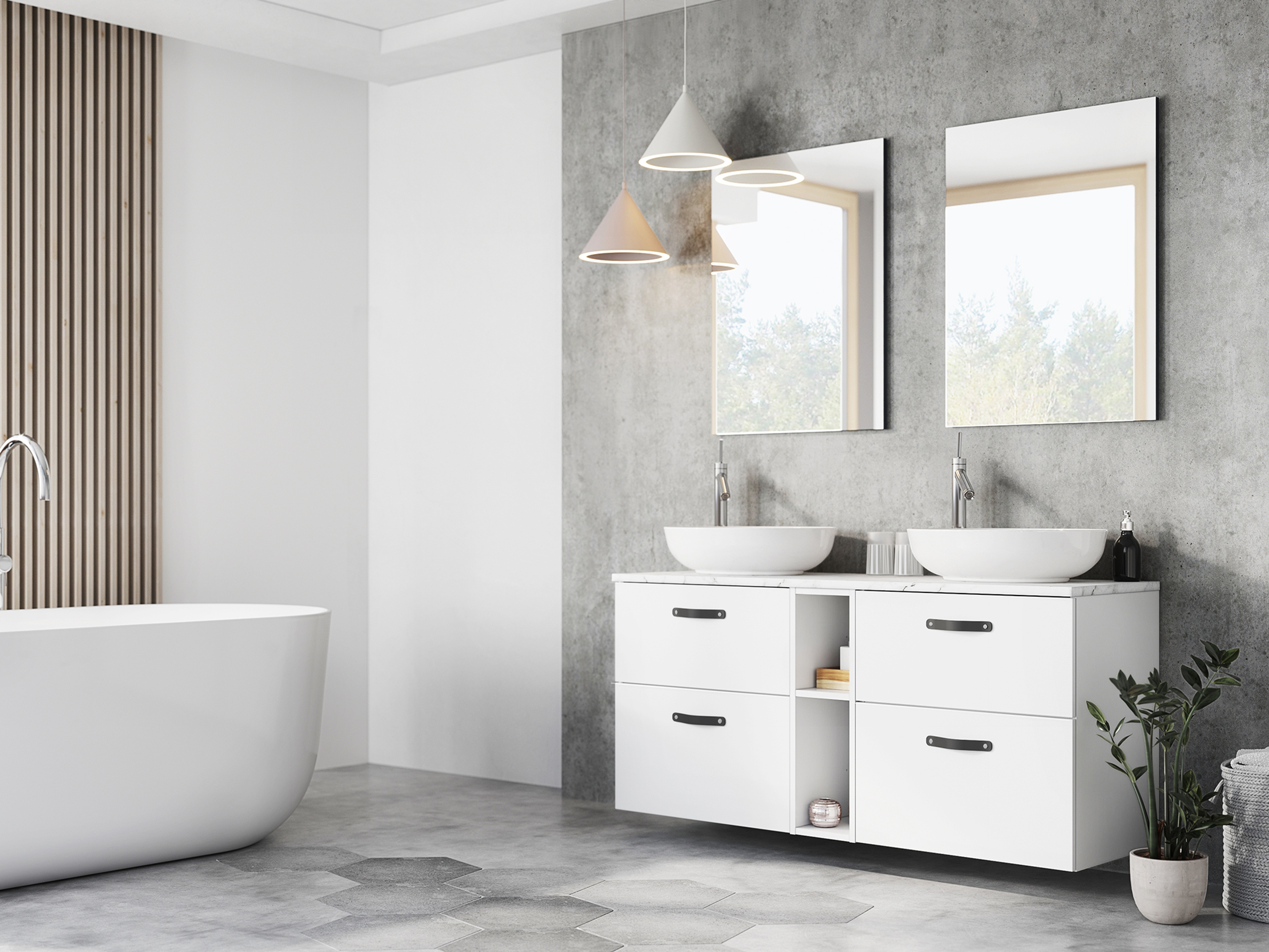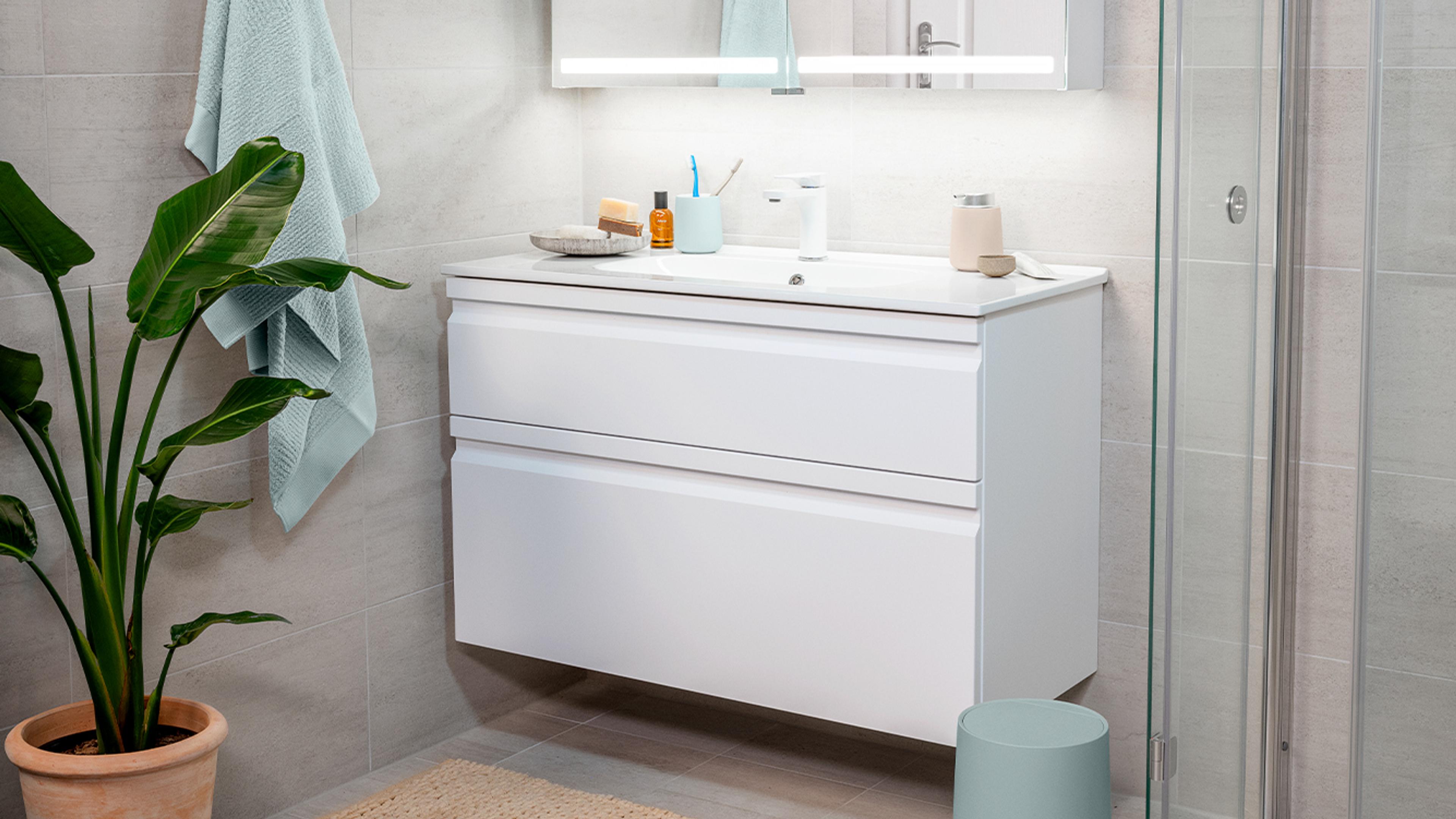 HVOR VIL DU INVESTERE: Badekar eller baderomsmøbler? Noen ganger må du rett og slett prioritere. Heldigvis finnes det fine baderomsmøbler i alle prisklasser. Her ser du den budsjettvennlige serien Mix & Match fra Element.