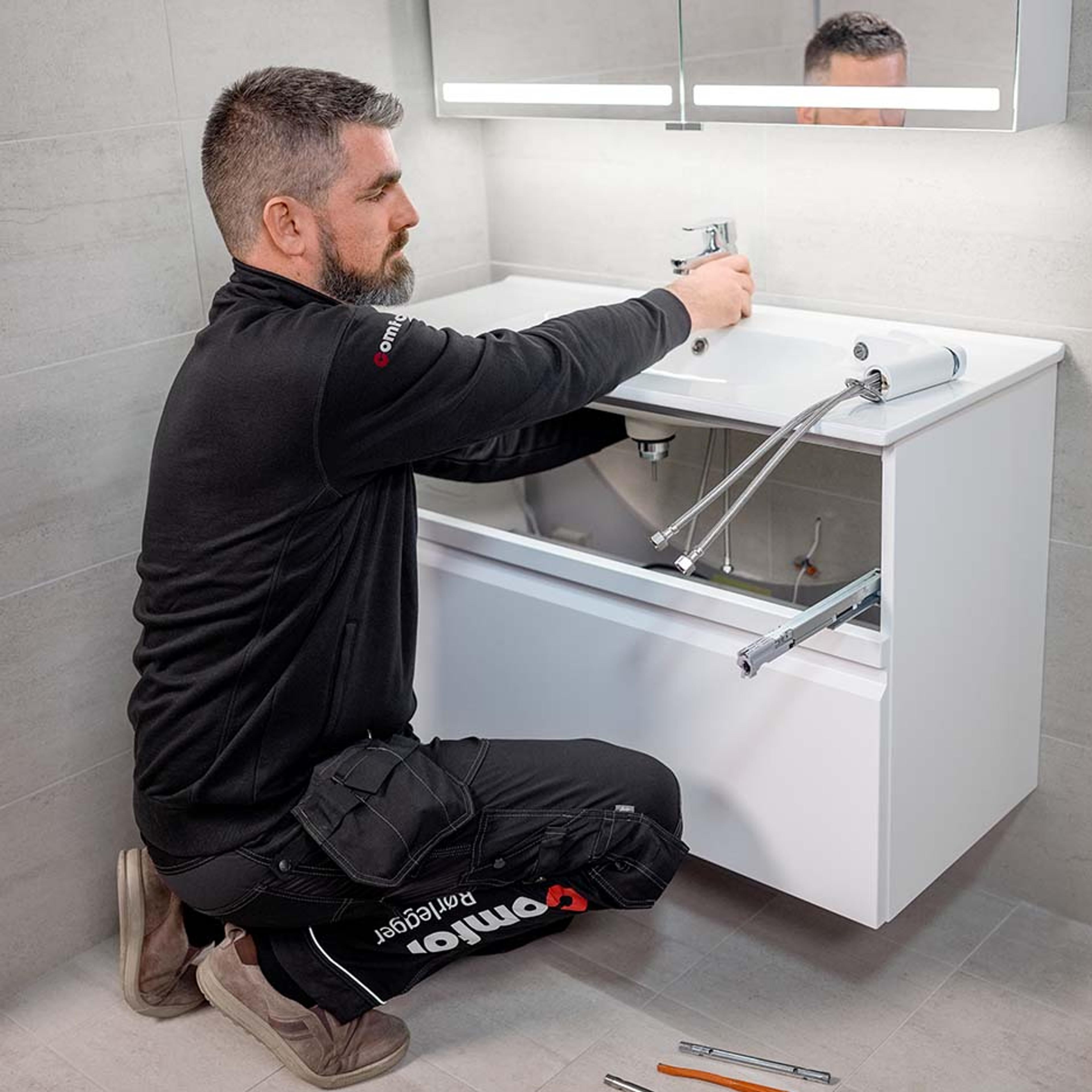 DET ER IKKE ALT DU KAN GJØRE SELV: Å bytte kran på badet er for eksempel noe du må få hjelp til av rørlegger. Kjøper du ny kran hos oss, kan en av våre rørleggere enkelt montere den for deg.
