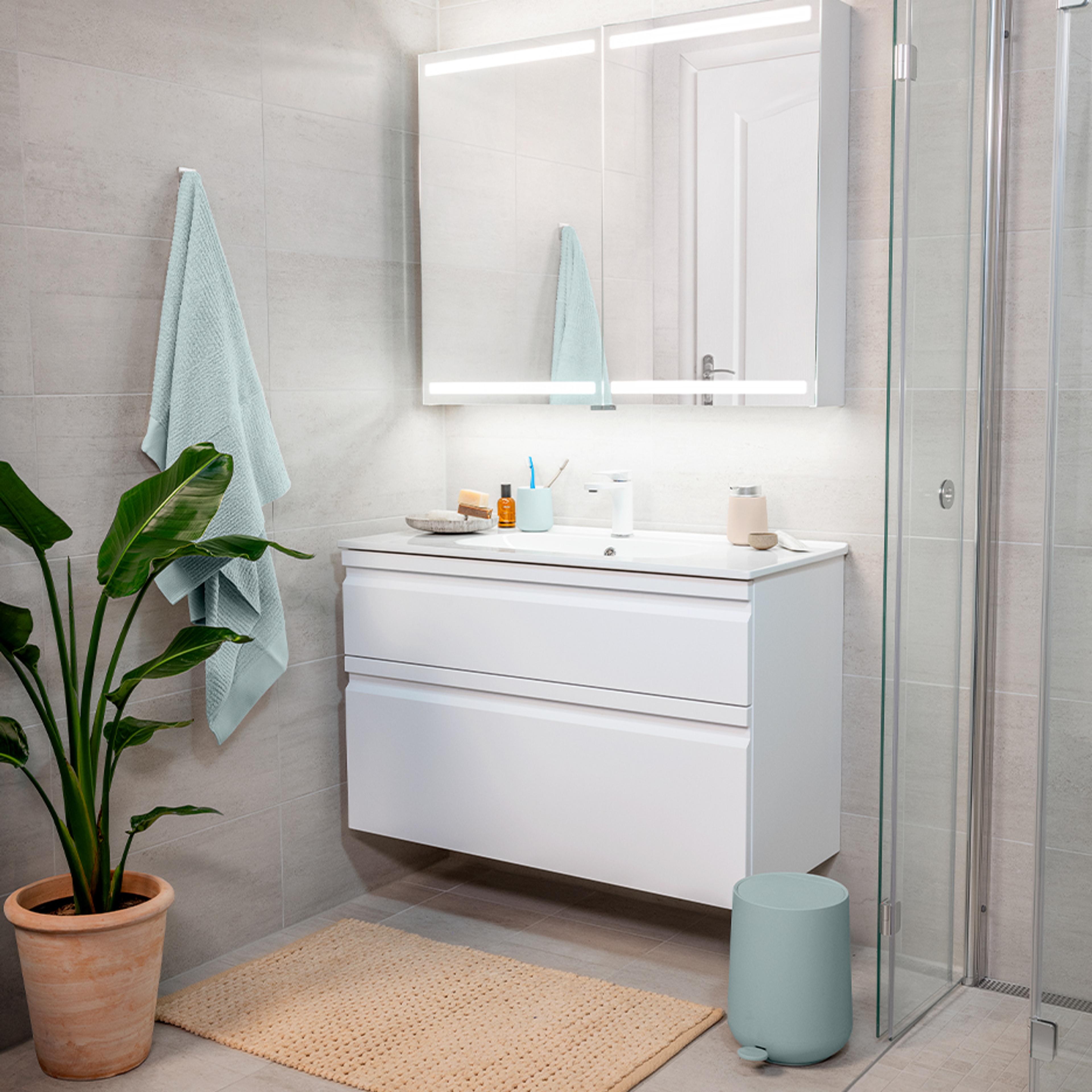 Når plantene er på plass, anbefaler Cathrine å ta tak i de synlige småtingene som håndklær, badematte, knagger, såpedispenser og småoppbevaring.