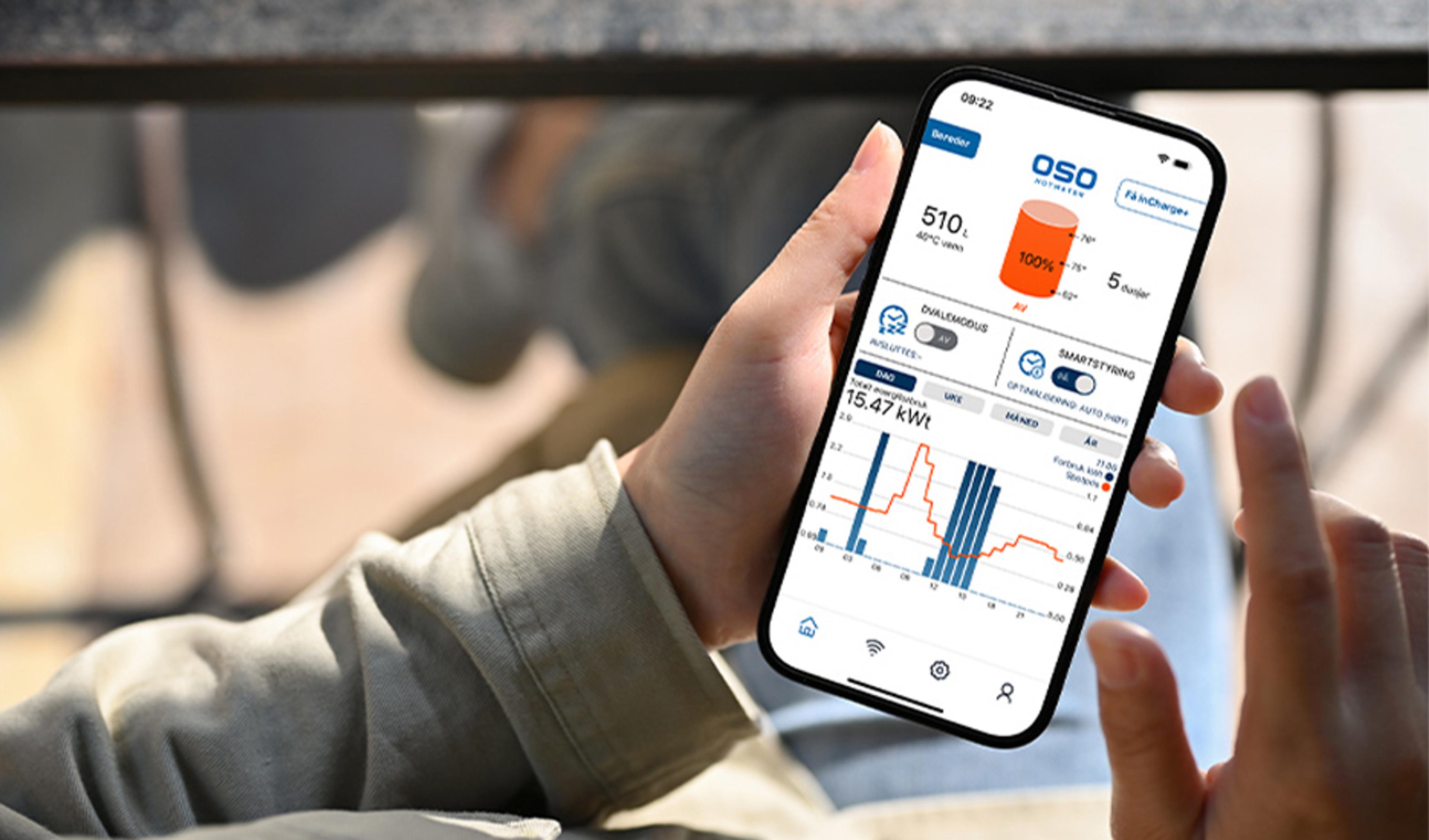 Med appen OSO inCHARGE kan du enkelt styre varmtvannsberederen, og tilpasse innstillingene etter dine behov. Funksjoner inkluderer: