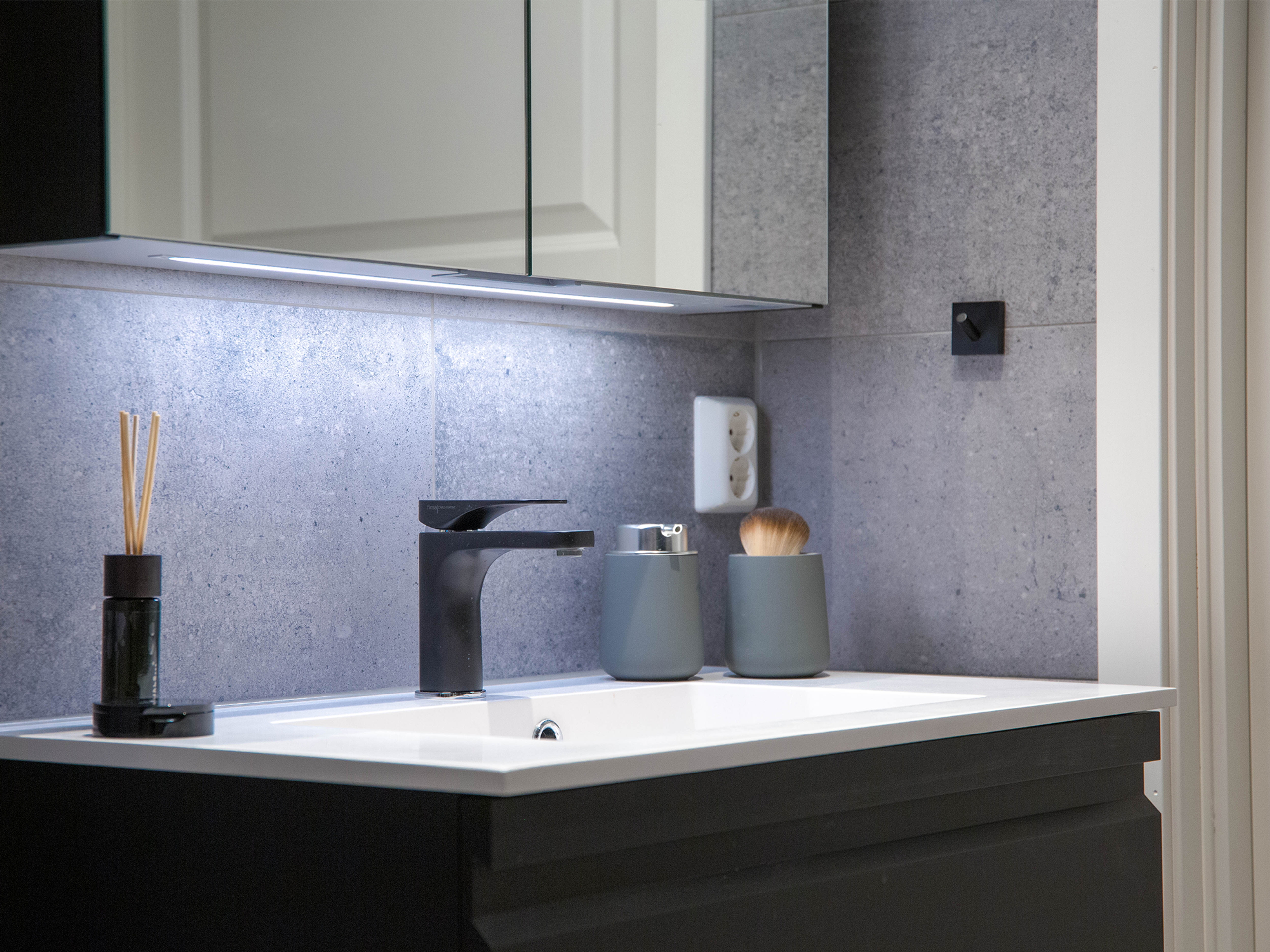 – Gjennomført. Teksturen i de store flisene, de sorte detaljene og de rette linjene skaper en helhet som oser av ro. Samtidig har jeg brukt materialer som er gode å ta på. Det synes jeg er viktig. De små svarte flisene er en uventet detalj og fungerer som et fint blikkfang.