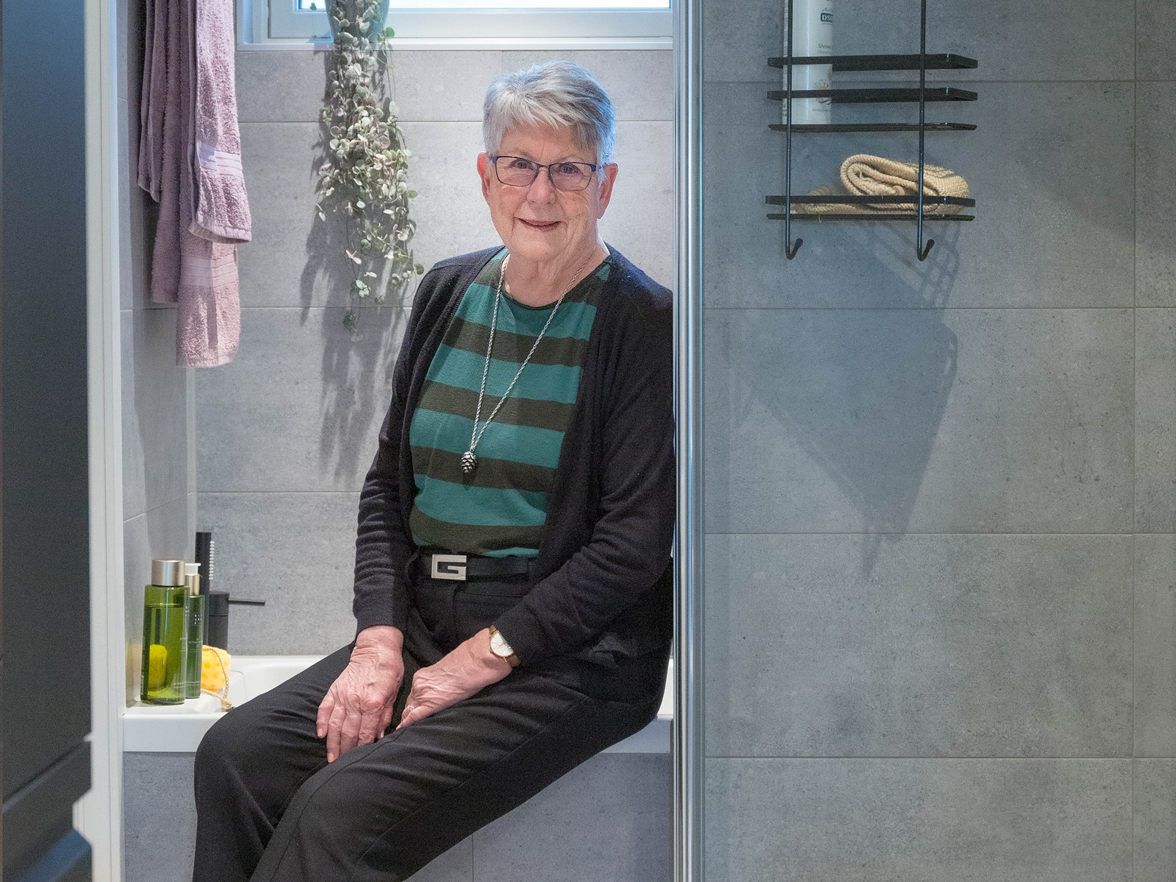 – Dusjen! I den gamle dusjen var det ikke rom nok til å kunne bøye seg, men i denne har jeg masse plass. Når dusjen ikke er i bruk, slår jeg bare sammen dusjdørene. Da blir baderommet plutselig mye større. Også elsker barnebarna mine å komme besøk for å bade i det nye badekaret!