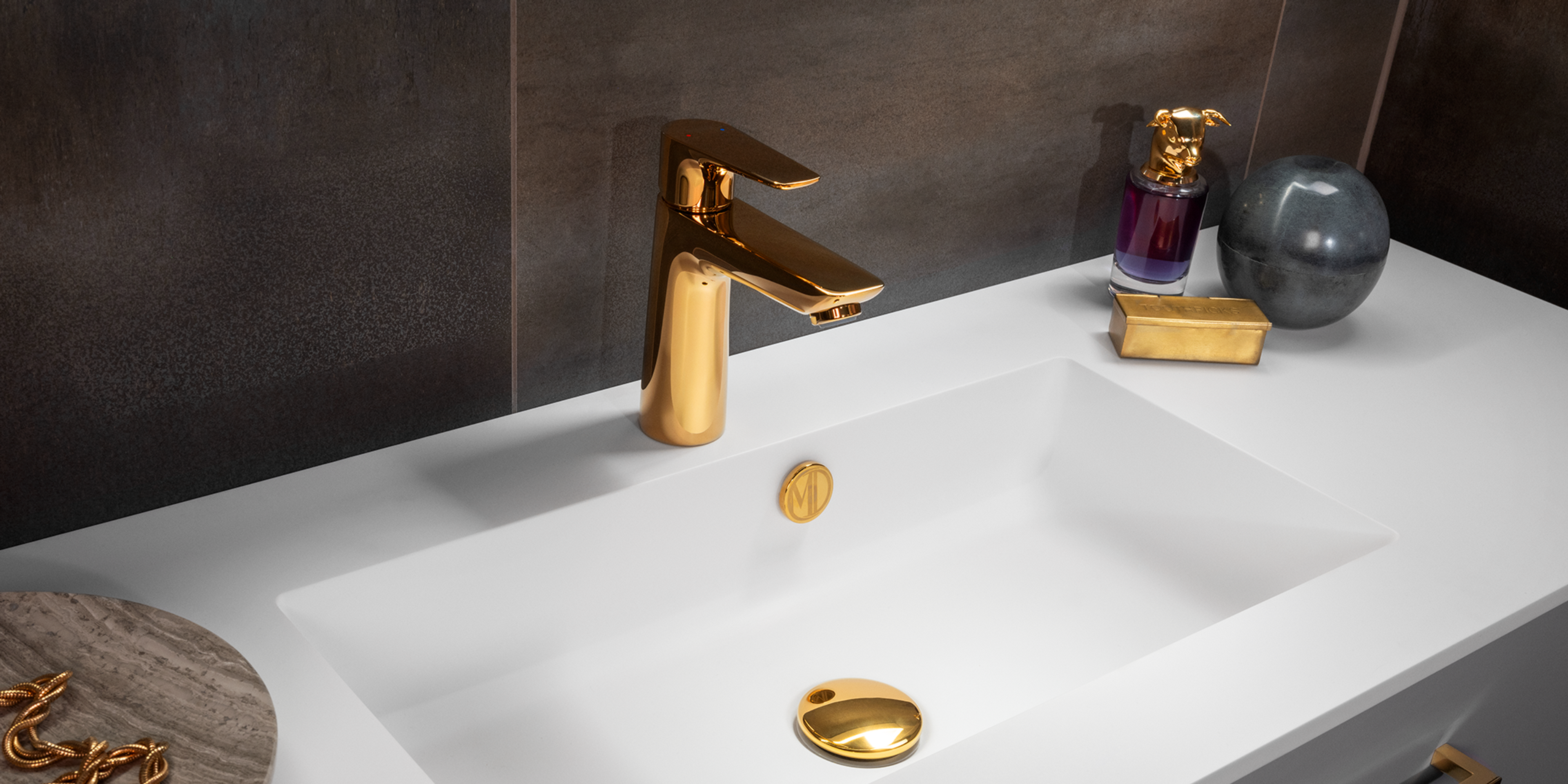 Slik kan detaljer i gull, hvitt, sort og krom sette stemningen på badet.