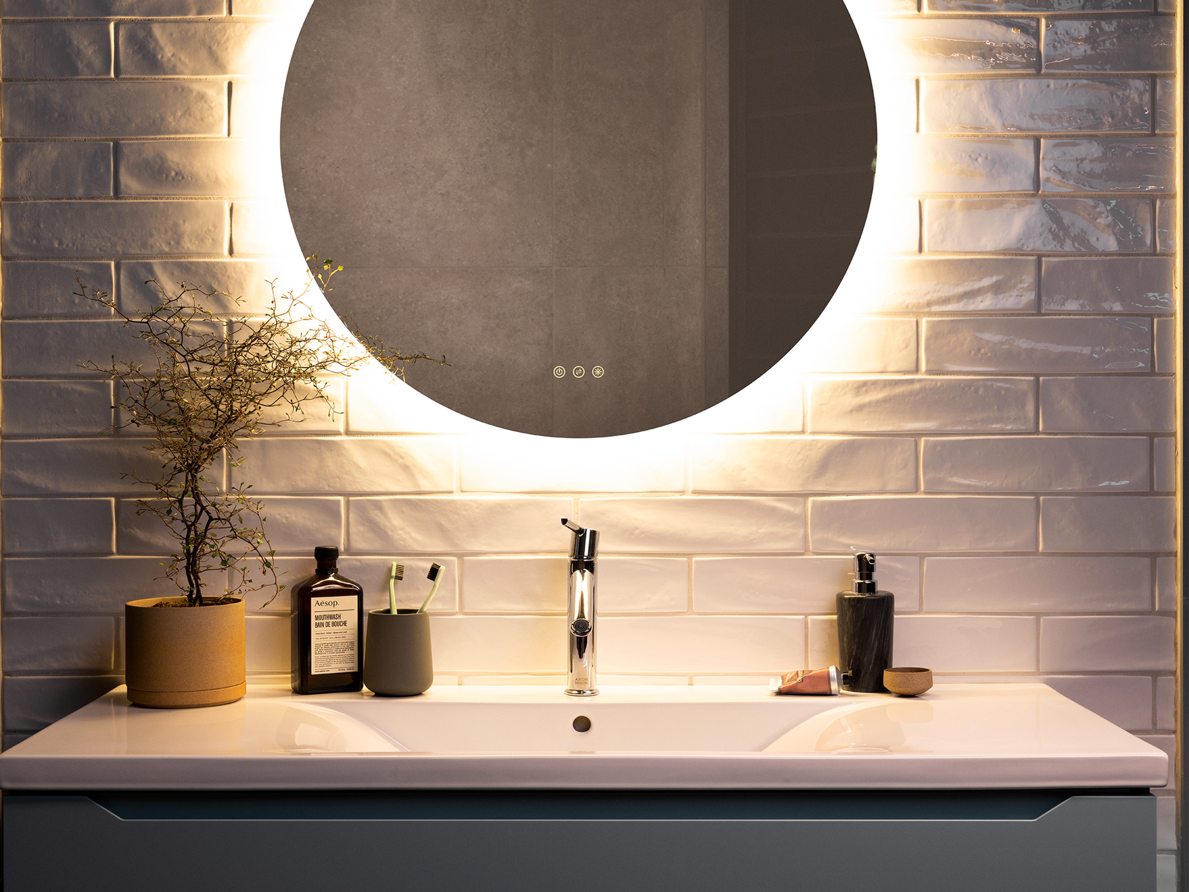 Runde speil, som disse fra Linn Bad, gir badet en uventet detalj, og fungerer som blikkfang. Det runde speilet fra Linn Bad har frostet lyskant og berøringspanel med dimmer, av/på og gir deg mulighet til å regulere fargetemperaturen.