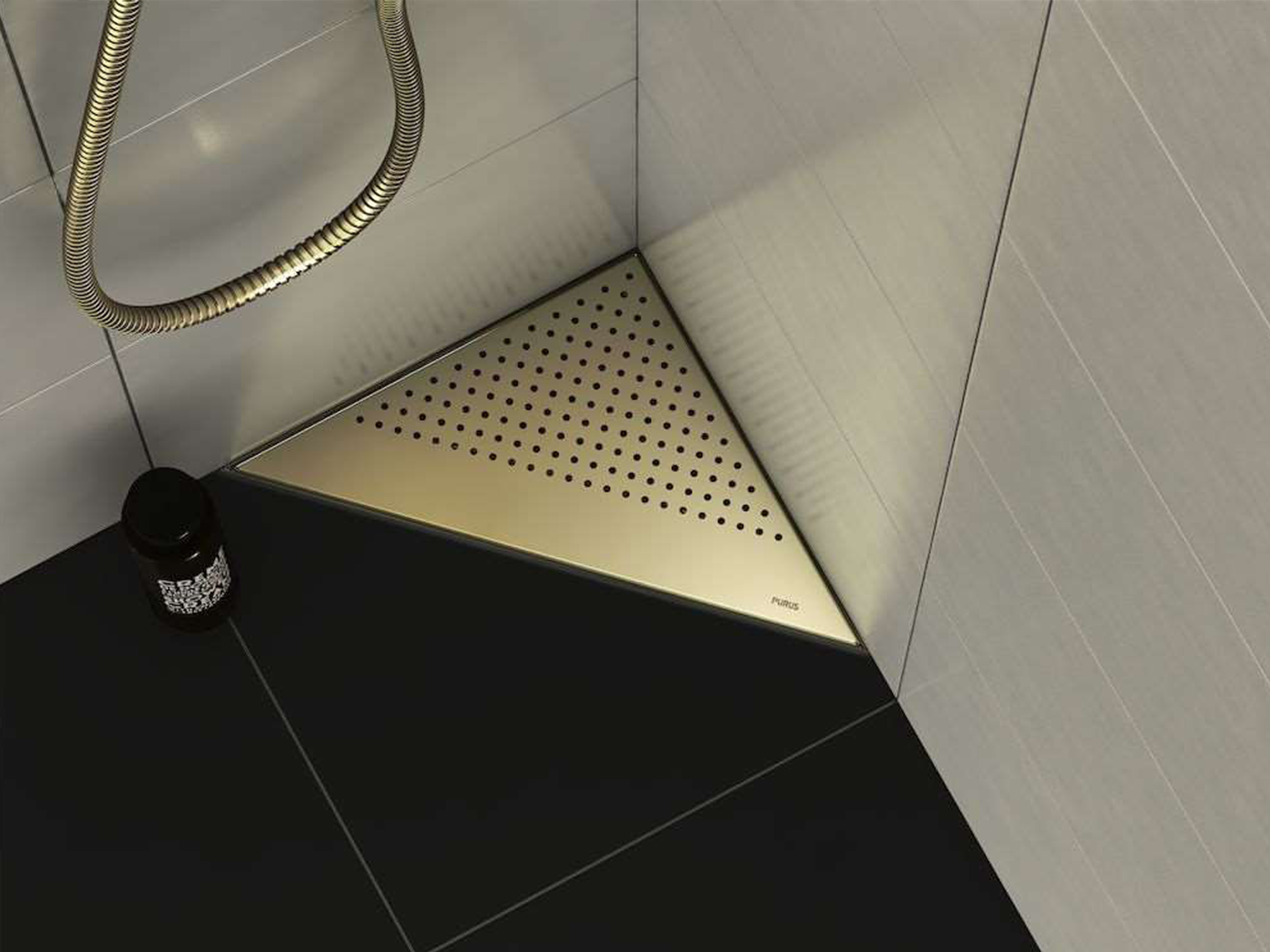 GULL OG GLITTER: Har du allerede montert et Purus Corner designsluk kan du enkelt skifte ut ristene. Her ser du "Pearl" hjørnesluk i gull fra Purus.