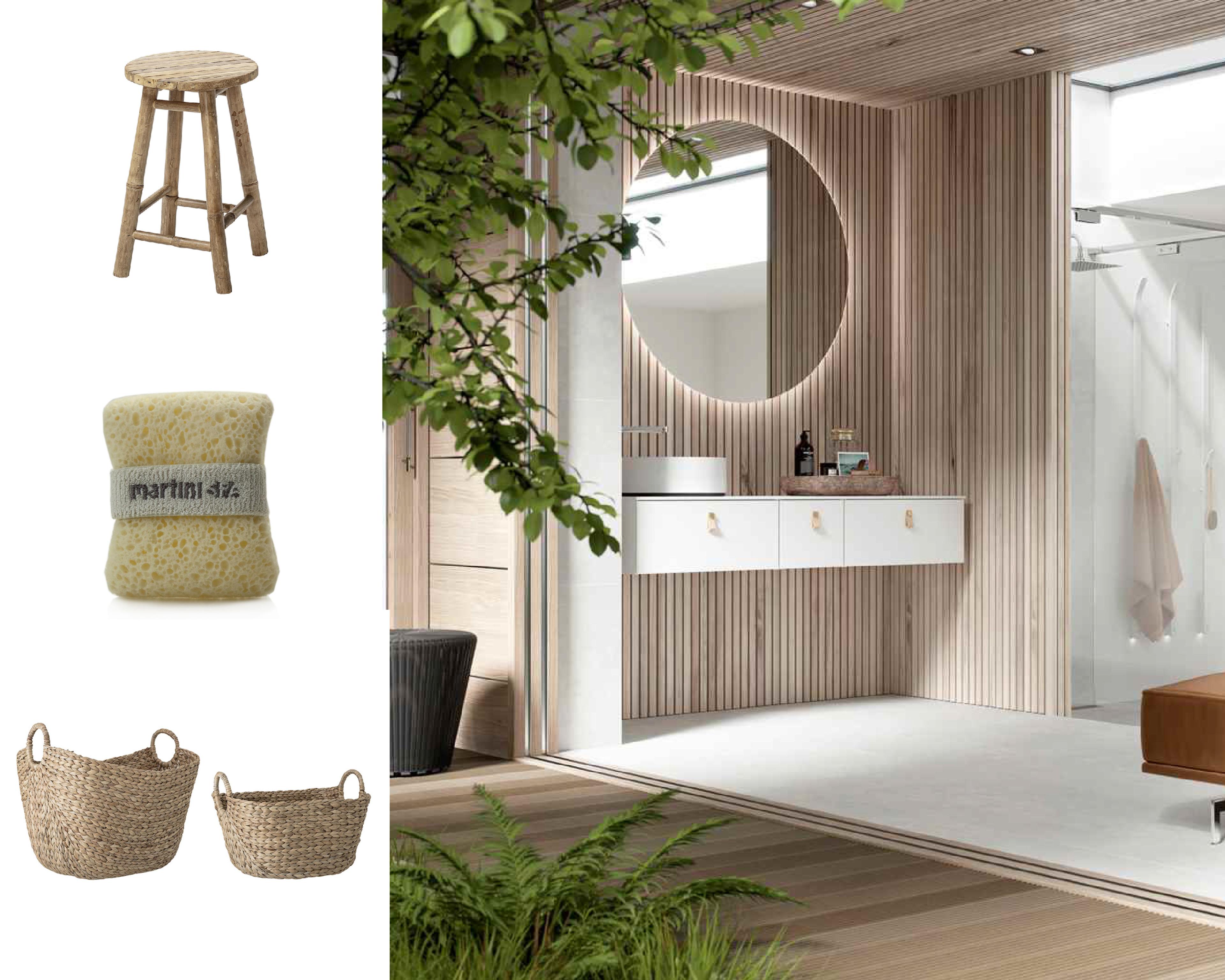 NORDISK OG NATURLIG:Smart krakk i bambus (øverst) En perfekt svamp til dusj og bad (midten) Praktiske kurver i naturmateriale (nederst) Urbant og naturfarget med INR (t.h)