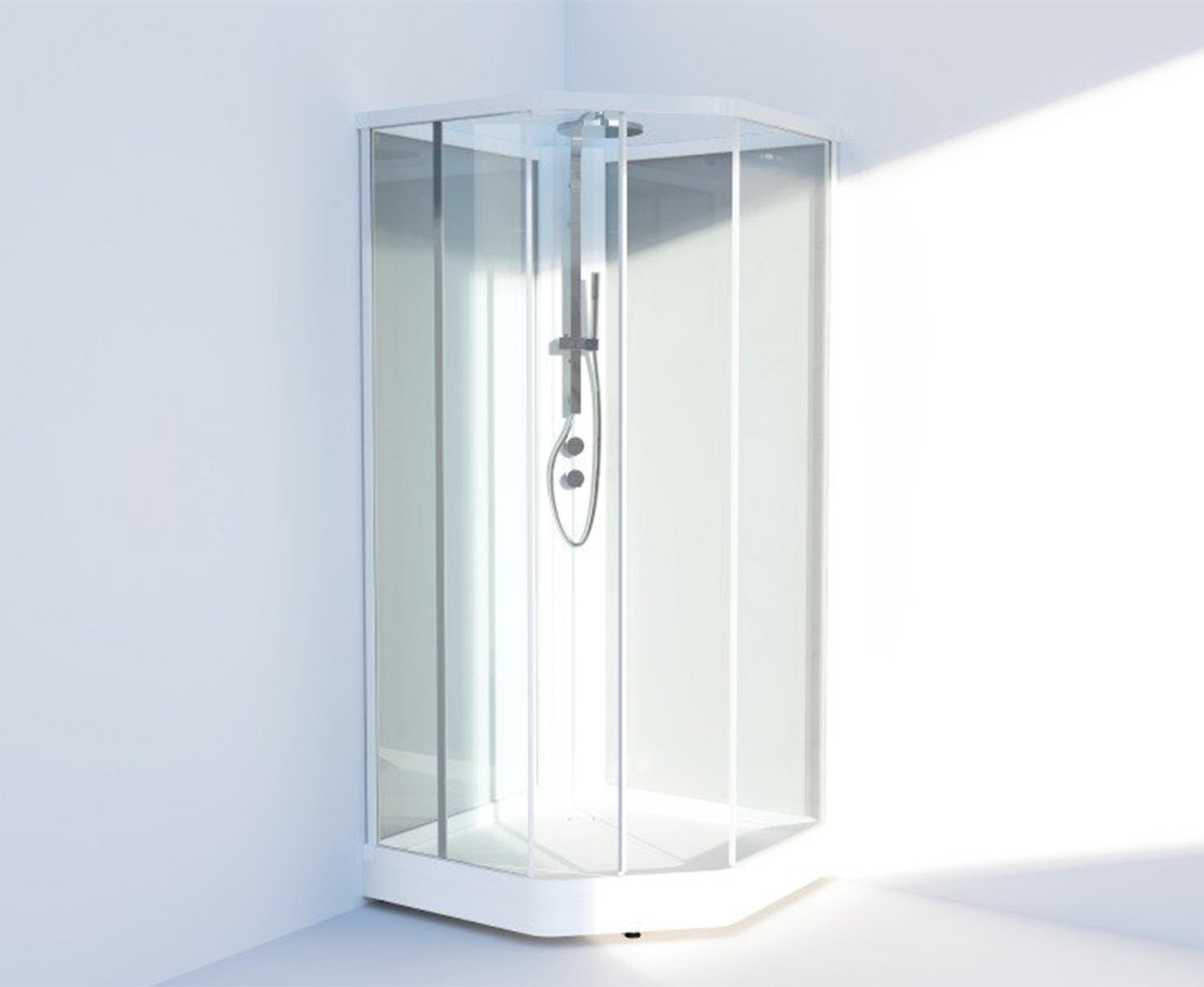 Dusjkabinett med hvite profiler og klart glass. Hvite bakvegger. Inkludert takdusj. Et behagelig og sikkert dusjkabinett med mange gode funksjoner.