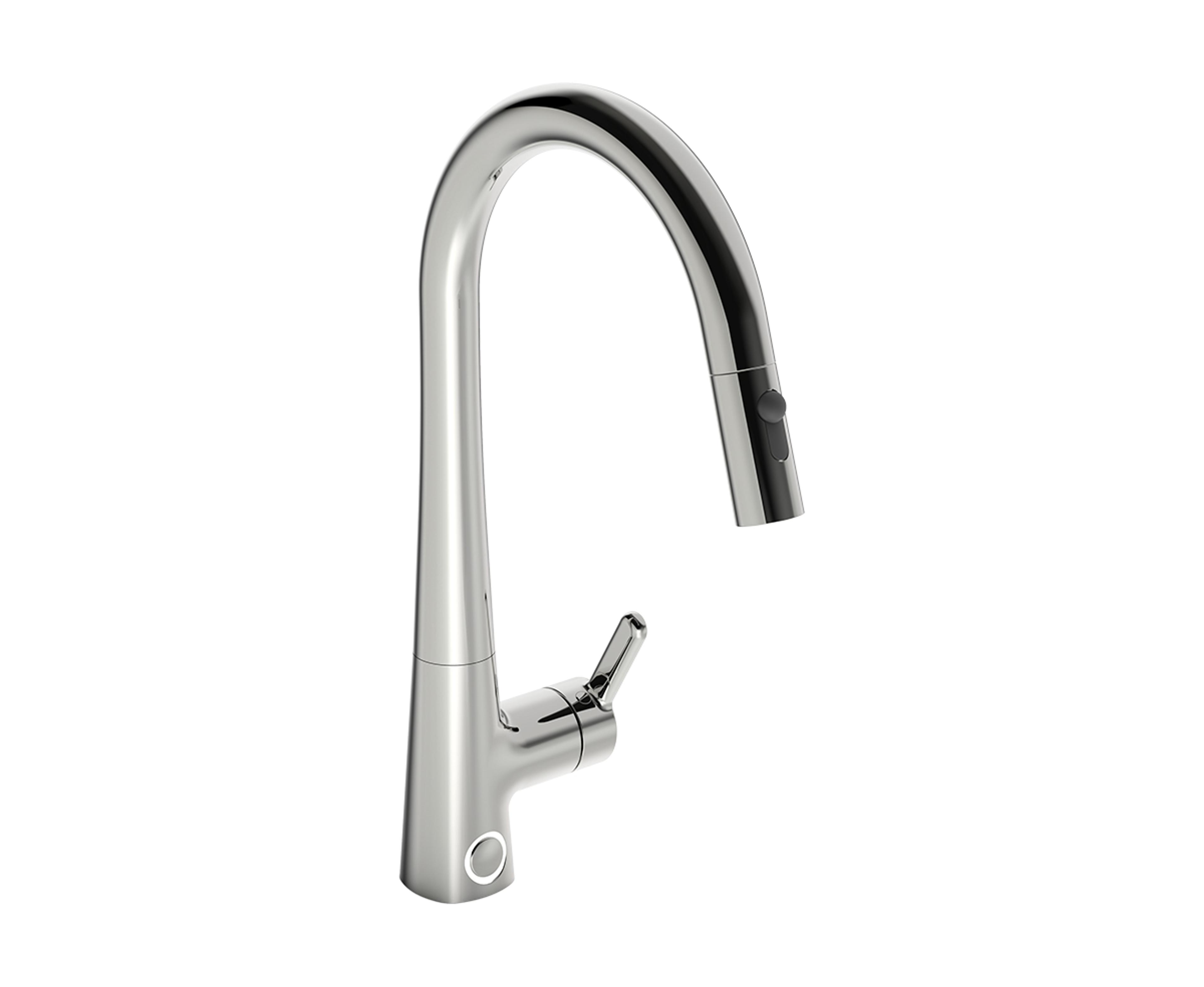 Kjøkkenkran med ettgreps betjening med uttrekkbar tut og ekstra knapp for spylefunksjon. Høy rund dreibar tut. Fleksible slanger for enkel tilkobling. Velg mellom krom og sort matt. Farge: Krom