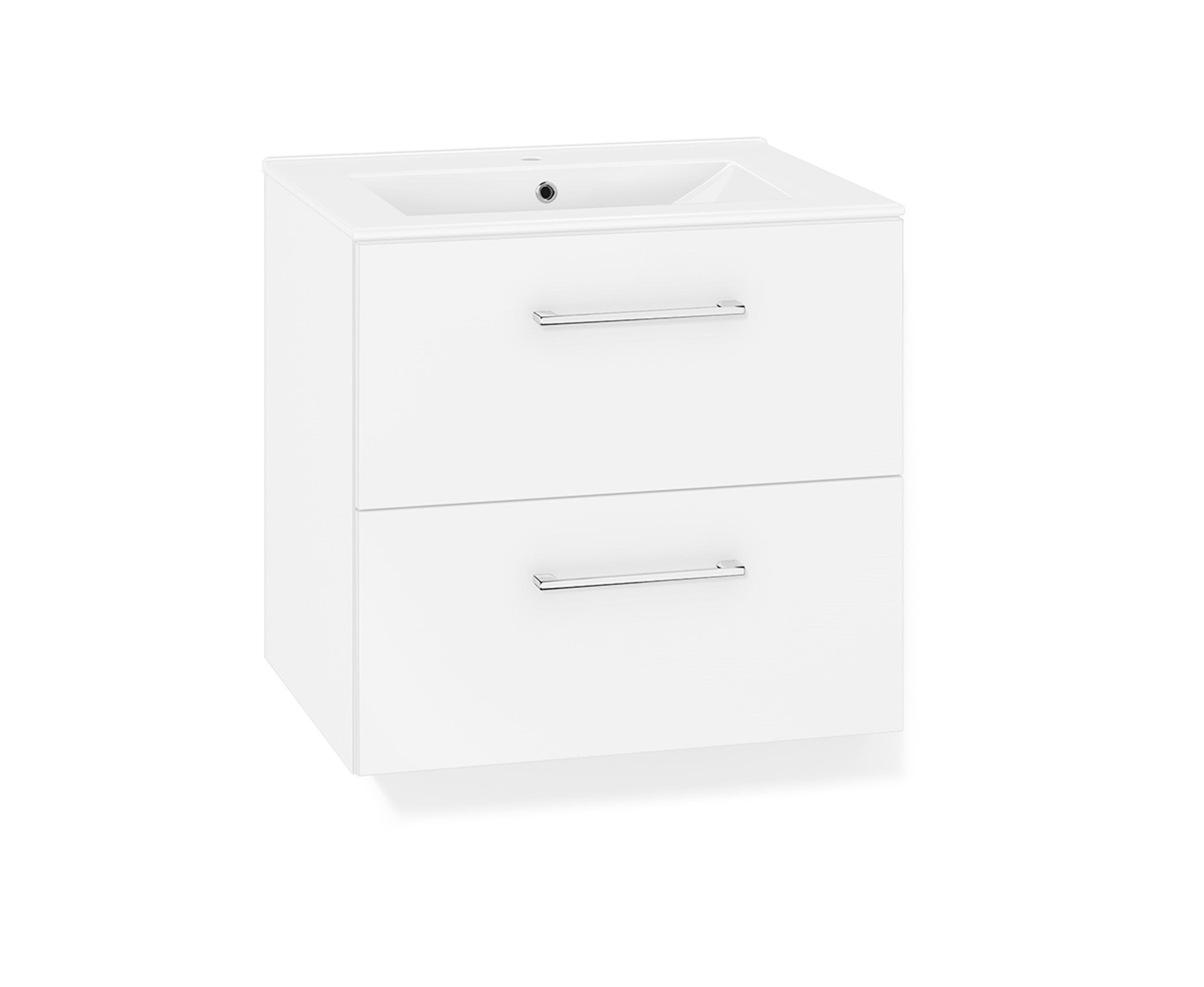 Baderomsmøbel i hvit matt to skuffer og håndtak i krom. Bredde 61 cm. Inkludert tynn heldekkende porselensservant og speil med toppmontert energieffektiv LED-lampe. Pris uten blandebatteri. Mål B x H x D: 60x55x45,7 cm