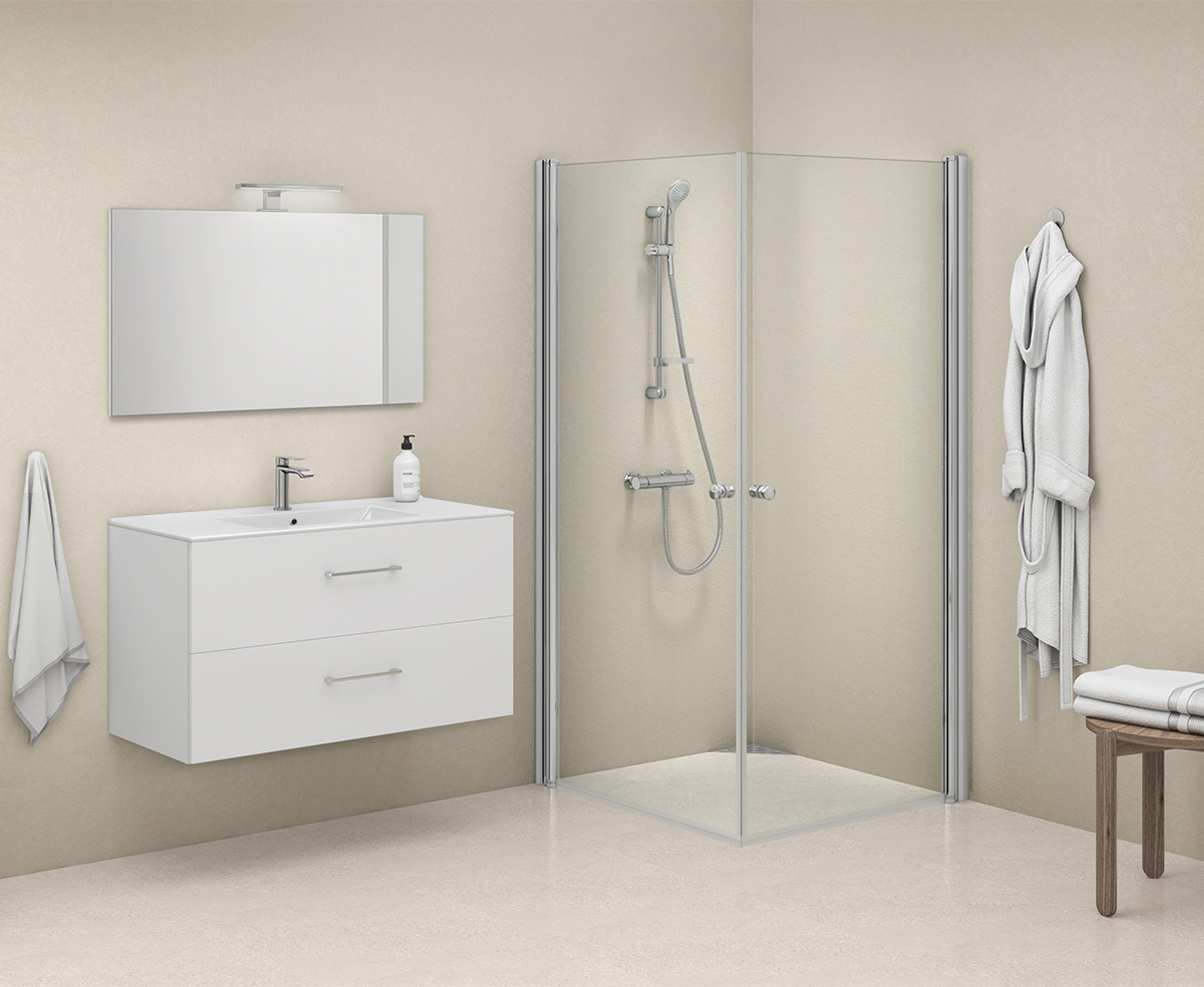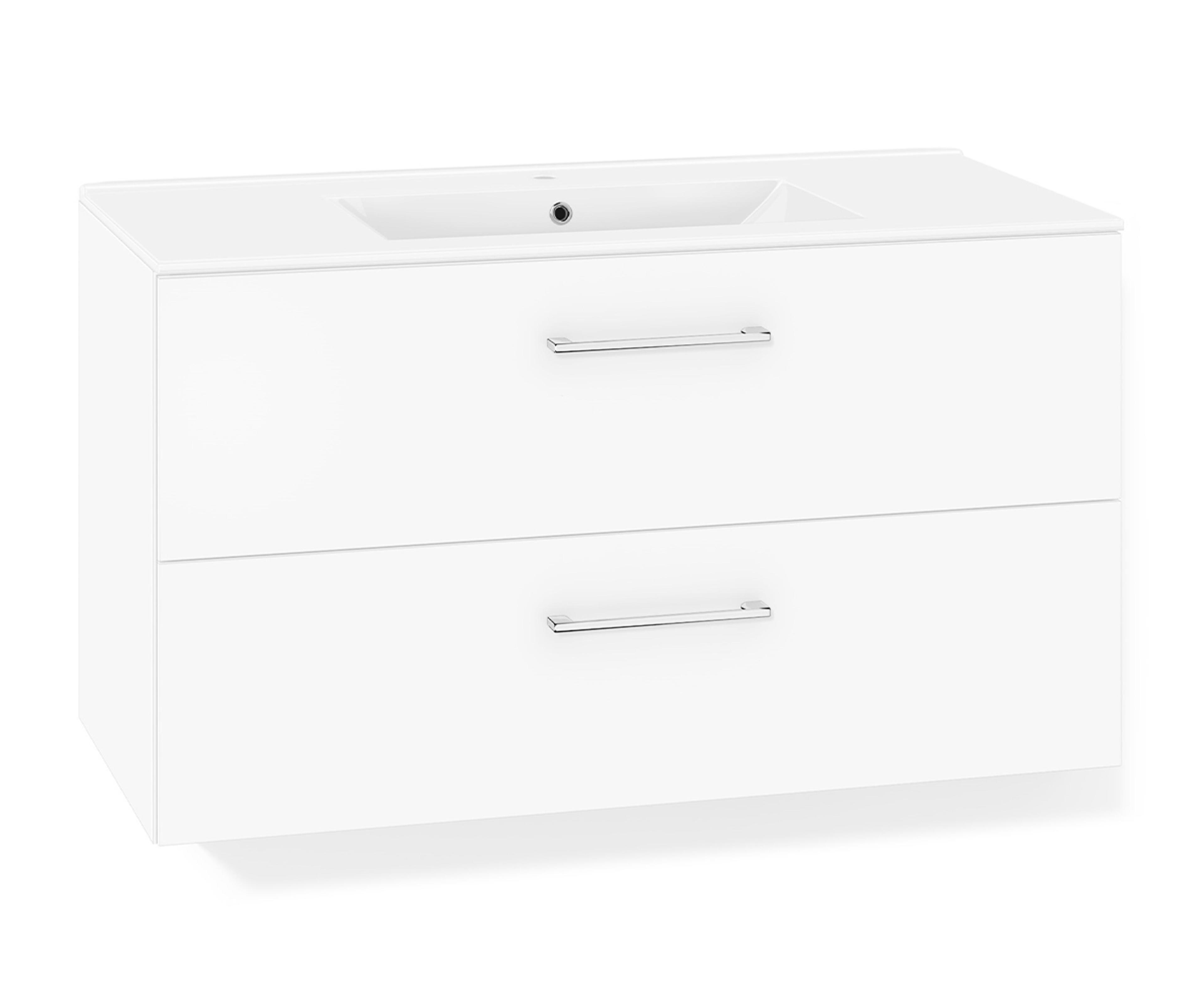Baderomsmøbel i Hvit Matt som inkluderer servantskapet (100x55x45,7 cm) med to skuffer og håndtak i krom. Heldekkende tynn porselensservant (101x18x46 cm) i hvit og speil (100x55x2 cm) med toppmontert energieffektiv LED-lampe. Pris uten servantkran.
