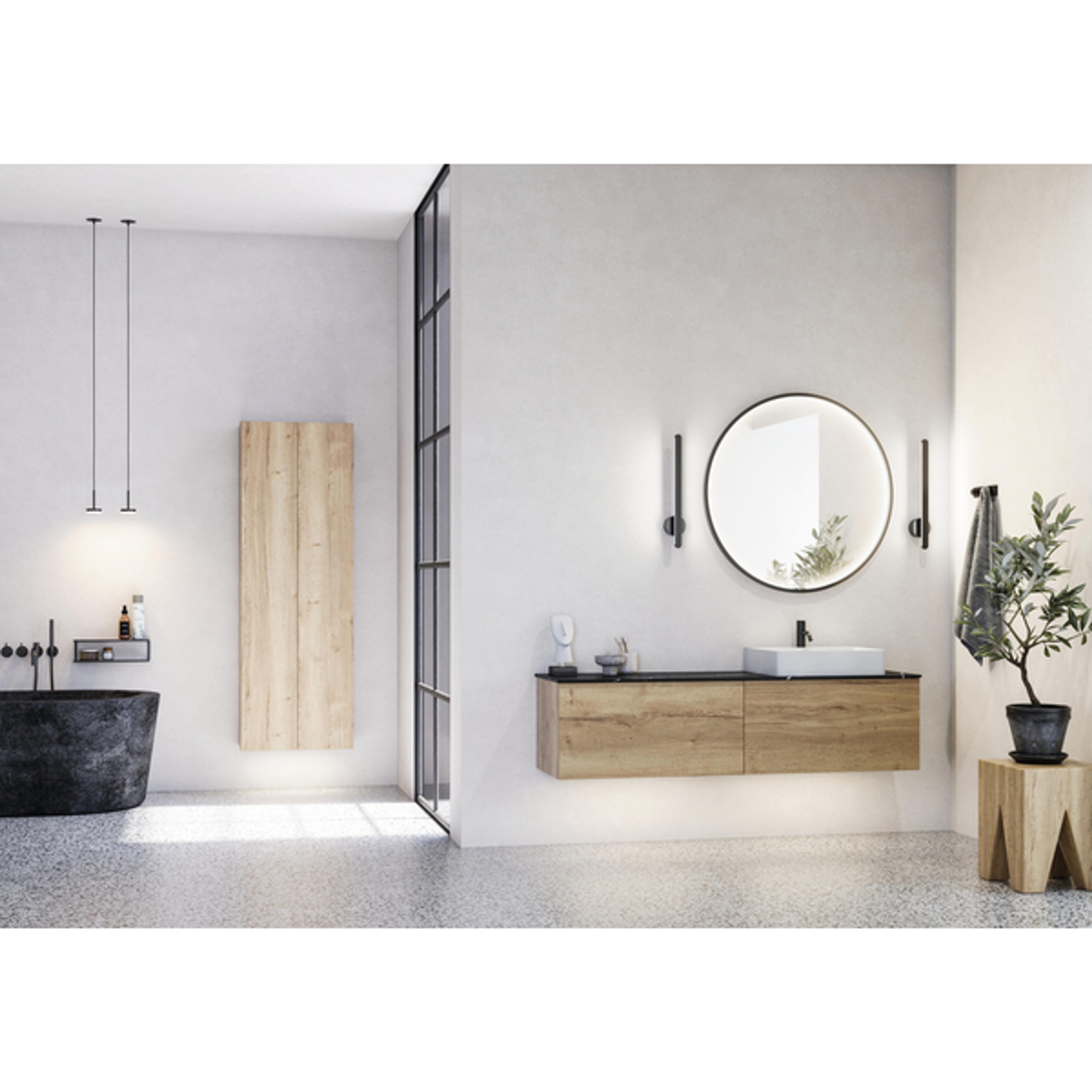 Skap et stilrent og funksjonelt bad med Inzo Urban-settet fra Dansani i 160 cm i den flotte fargen natur eik. Her får du en elegant løsning med både servantskap og sideskap, som gir deg god oppbevaringsplass og et rolig, innbydende uttrykk i hverdagen. Den eksklusive Silestone-benkeplaten er både slitesterk og motstandsdyktig mot flekker og riper - perfekt for et bad i daglig bruk. Den benkeplasserte Cube-servanten tilfører et moderne og skarpt design, mens det runde Moon-speilet med sort ramme skaper en flott kontrast og balanse. De to Linear-lampene gir et behagelig og funksjonelt lys. Med Dansani får du dansk design, solid håndverk og gjennomtenkte løsninger basert på mer enn 40 års erfaring - slik at du kan nyte både kvalitet og funksjon hver dag.