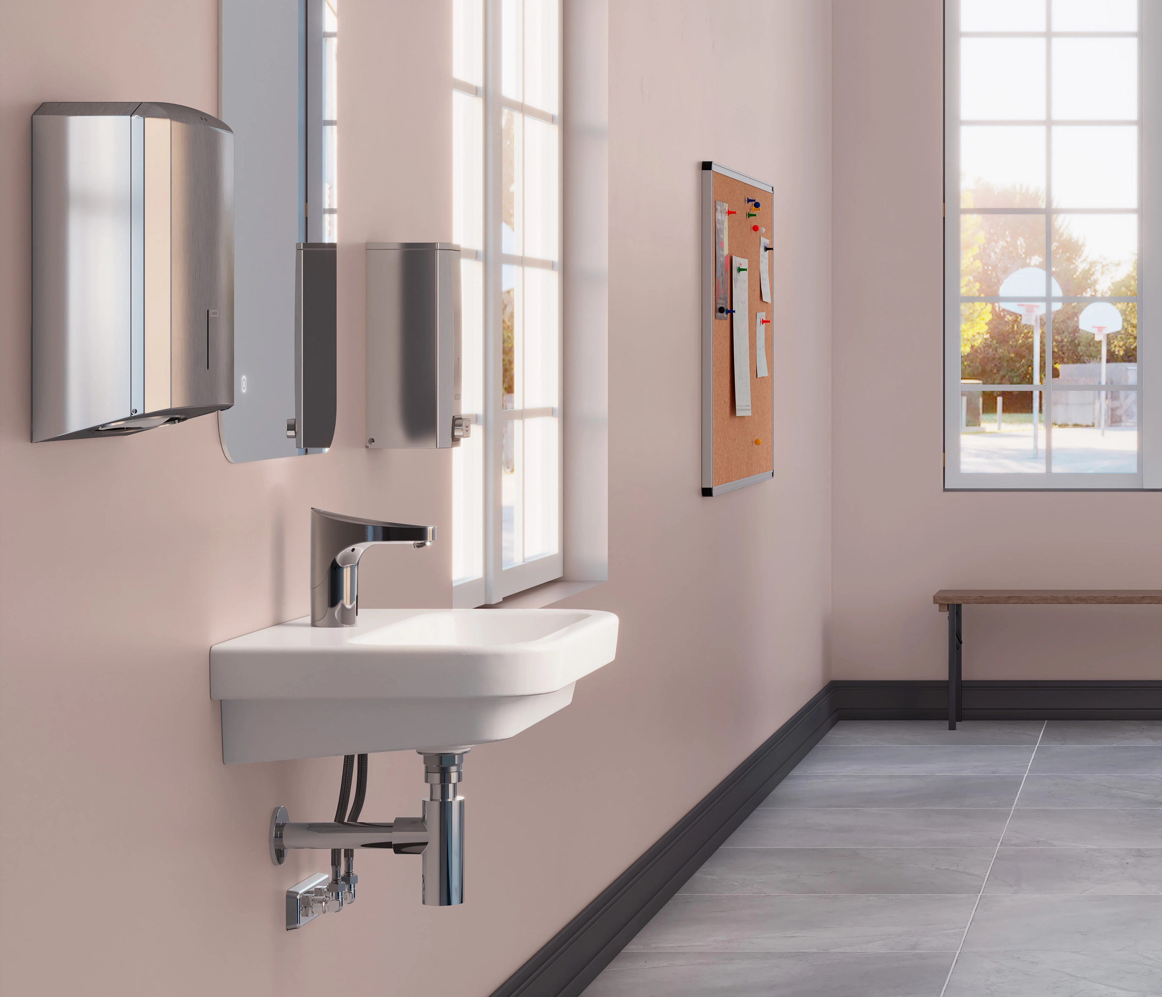 FMM 9000E Tronic med temperaturspak, nettdrift (eks. transformator) Berøringsfri blandebatteri. Berøringsfrie kraner gir både en enklere bruk og samtidig sparer både vann og energi. 9000E Tronic er en ny generasjon svensk-utviklede berøringsfrie kraner med all teknikken integrert i batterihuset.