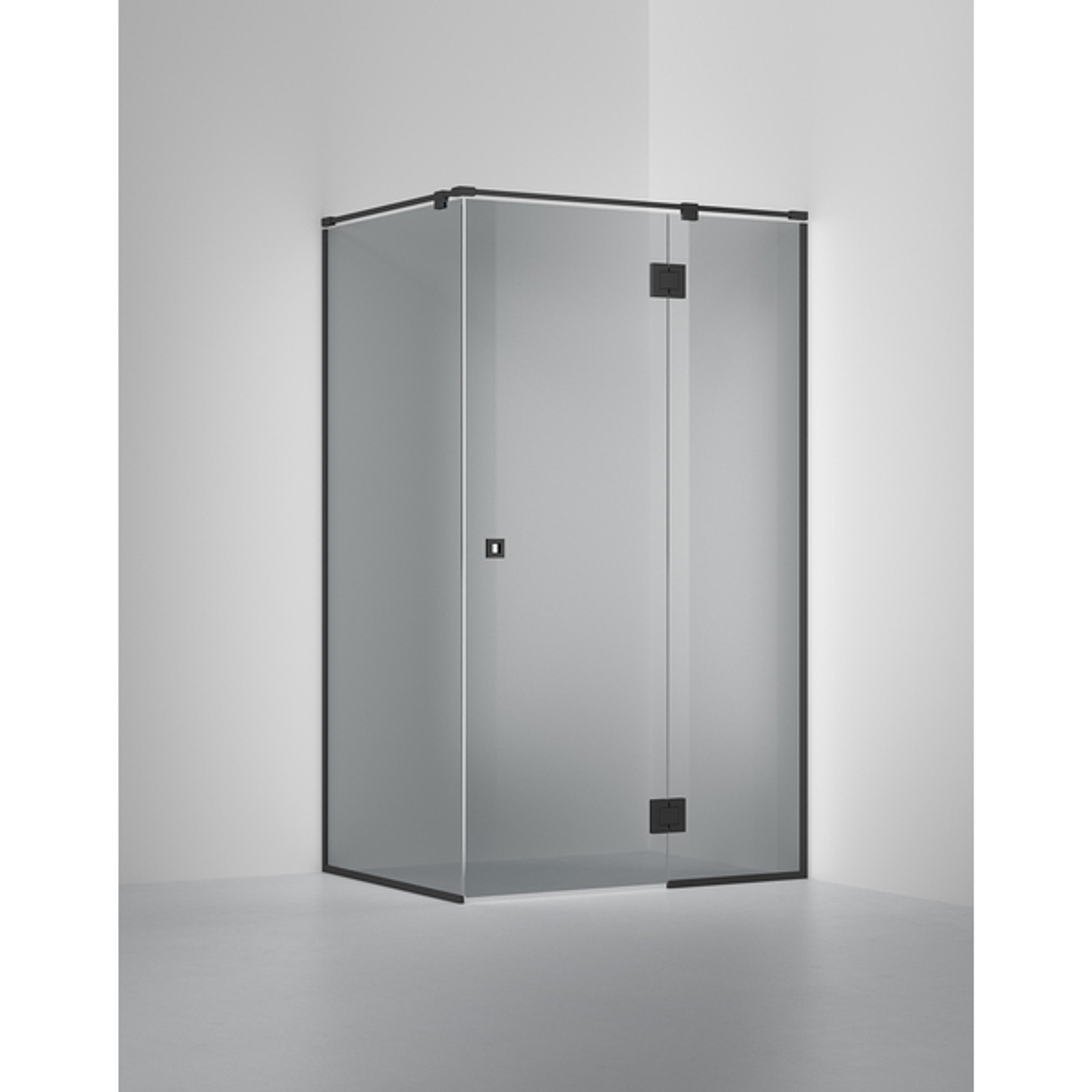Dusjhjørne med en fast vegg og en vegg med dør i 8 mm glass. Måltilpasses innen angitte intervaller. Tilpasses enkelt etter akkurat dine mål.