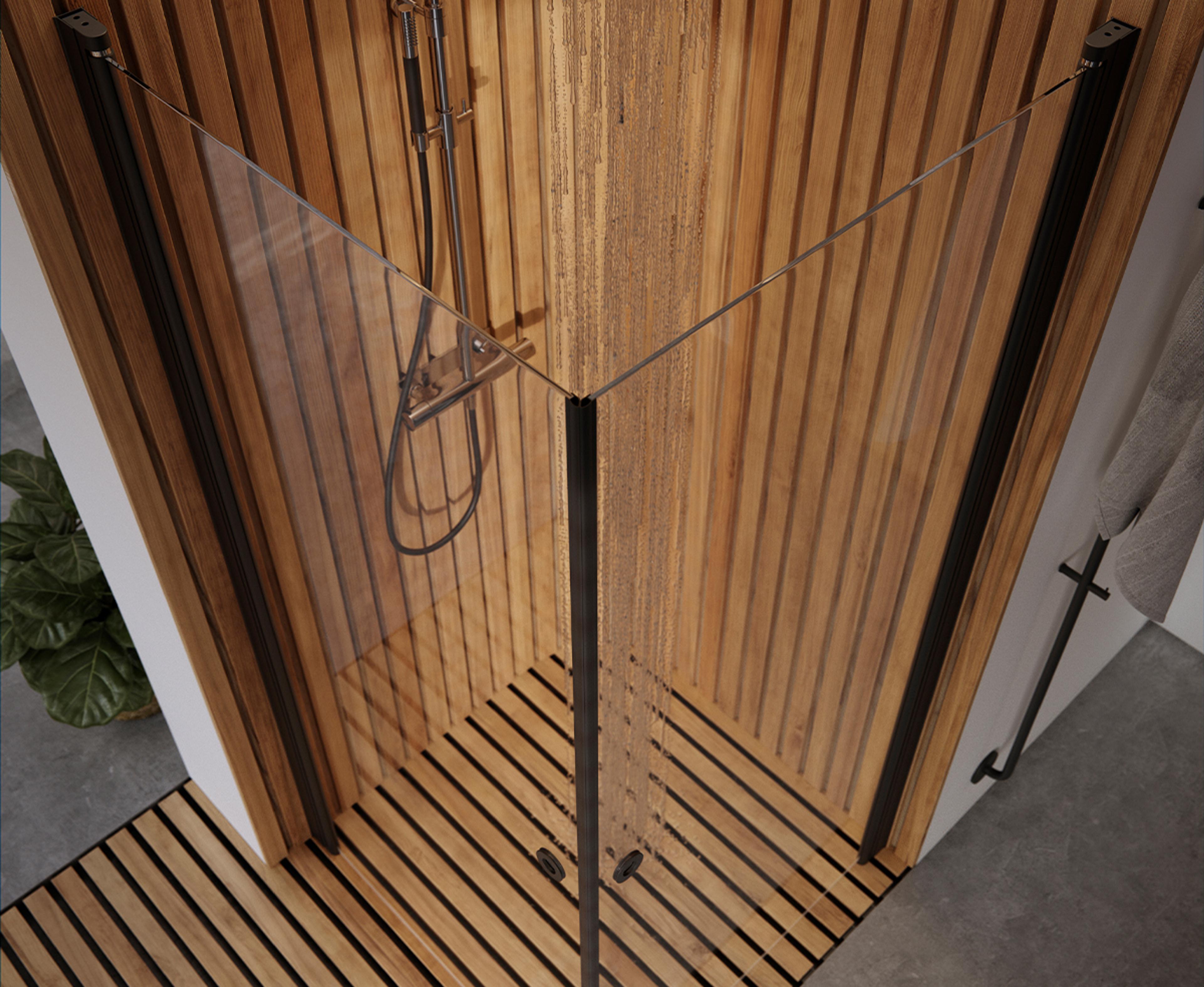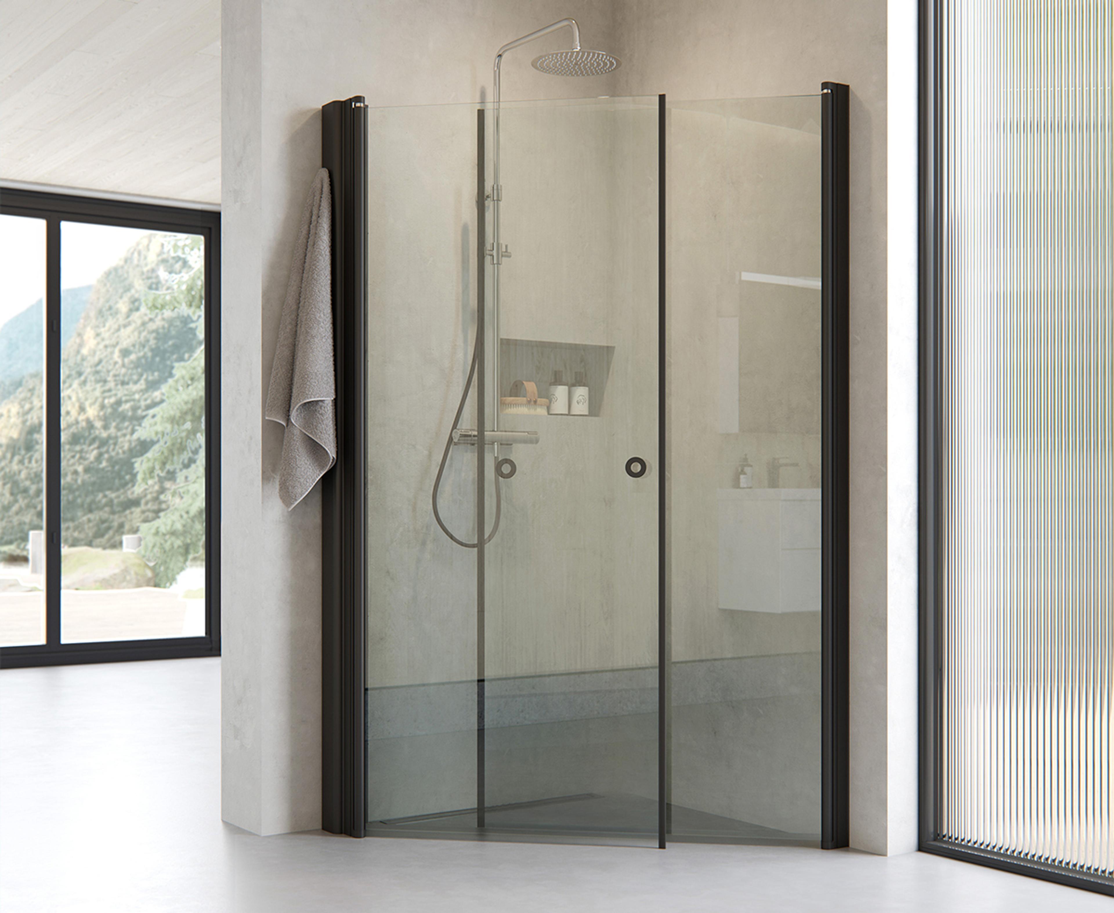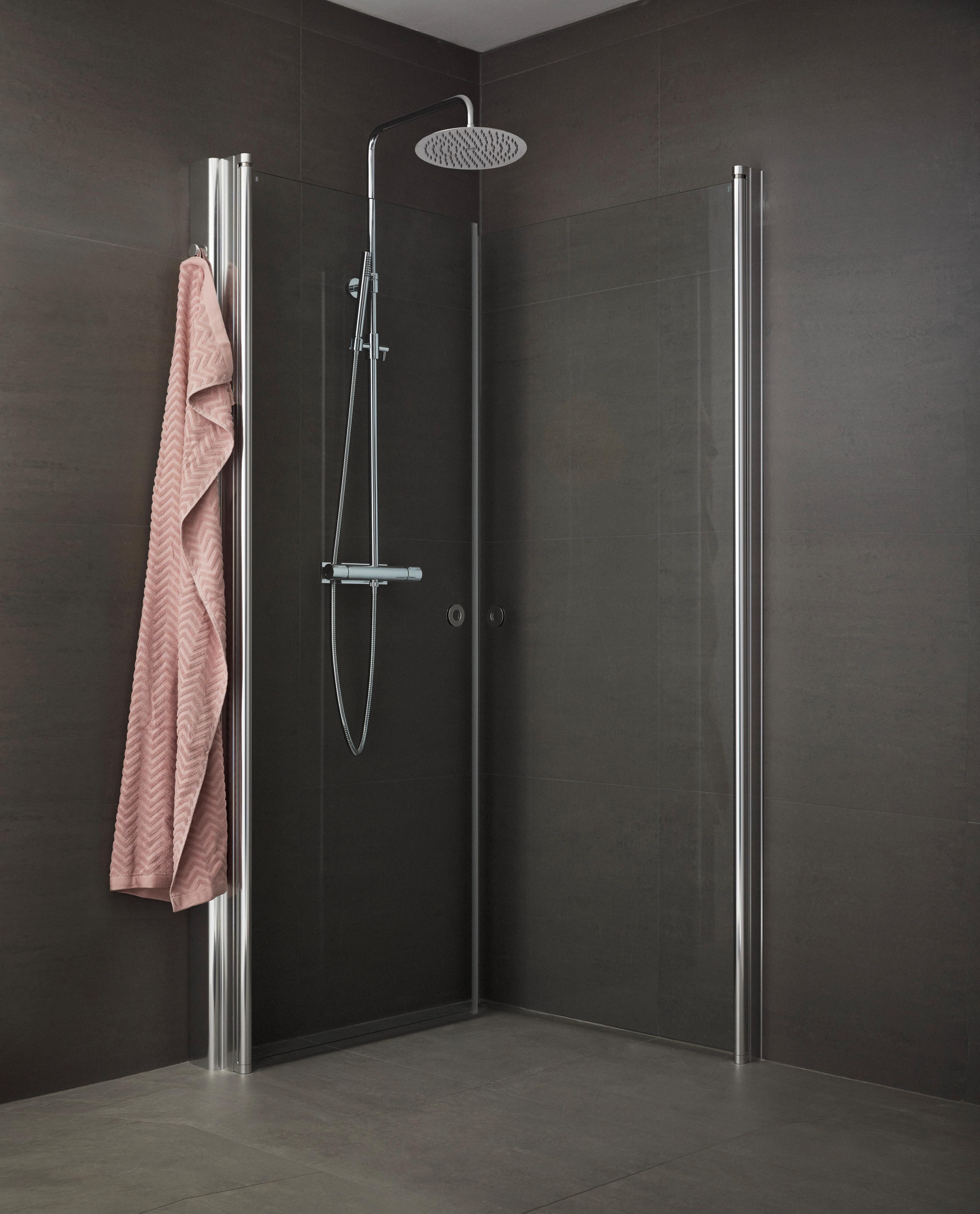 Dusjhjørne med to rette innsvingbare dører i 6 mm glass. Finnes i faste standardmål som du kan kombinere fritt, men også i måltilpasset utførelse. Kan kombineres med Pile.