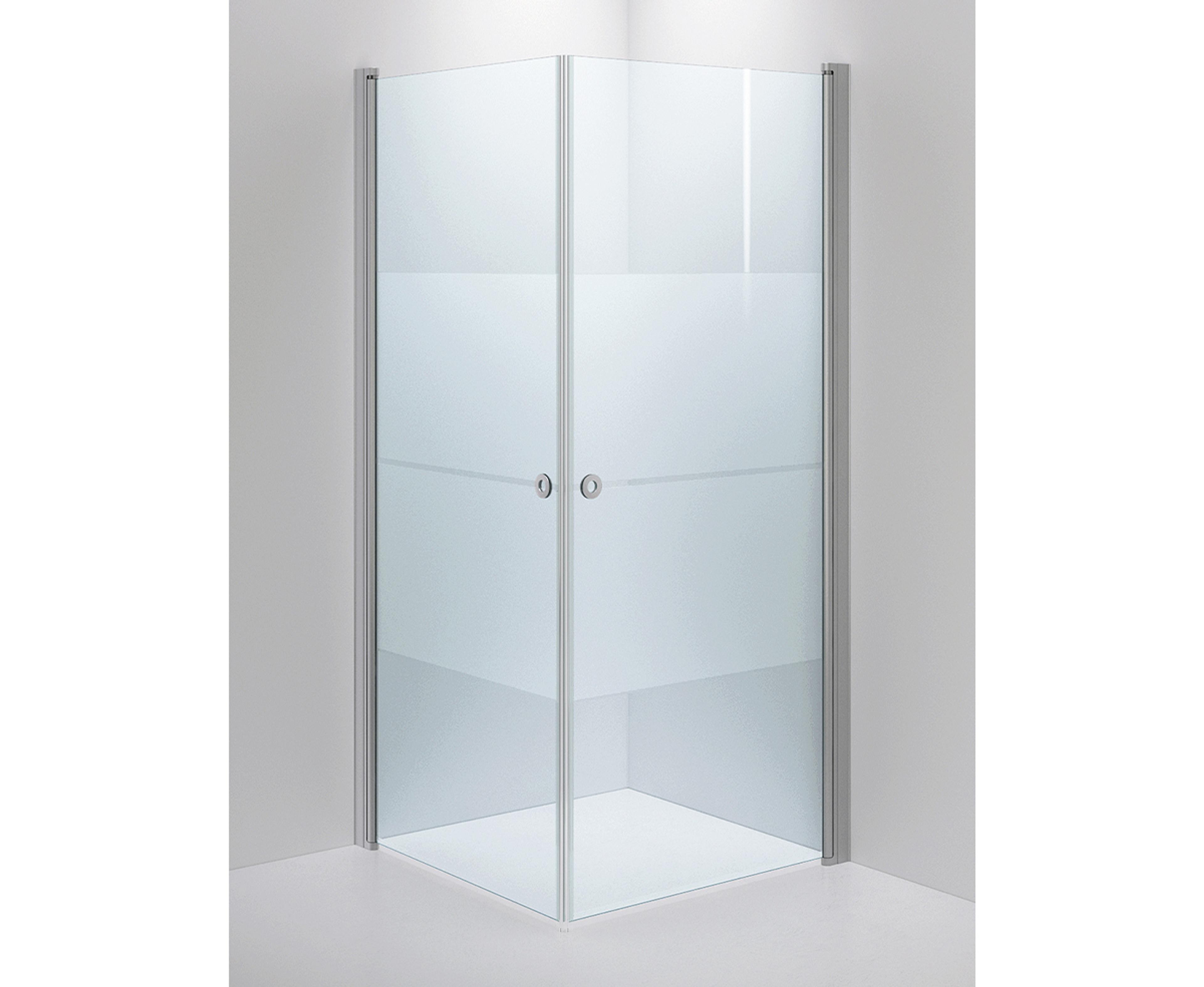 Dusjhjørne med frostet stripe og blank krom profiler. Dusjhjørnet har høy kvalitet, som leveres i flere forskjellige størrelser, glasstyper og profilfinish. Dørene er vendbare, og er utstyrt med hev-/senkbeslag. Alle dusjvegger fra INR er laget med termisk herdet sikkerhetsglass. Mål: 90x90 cm