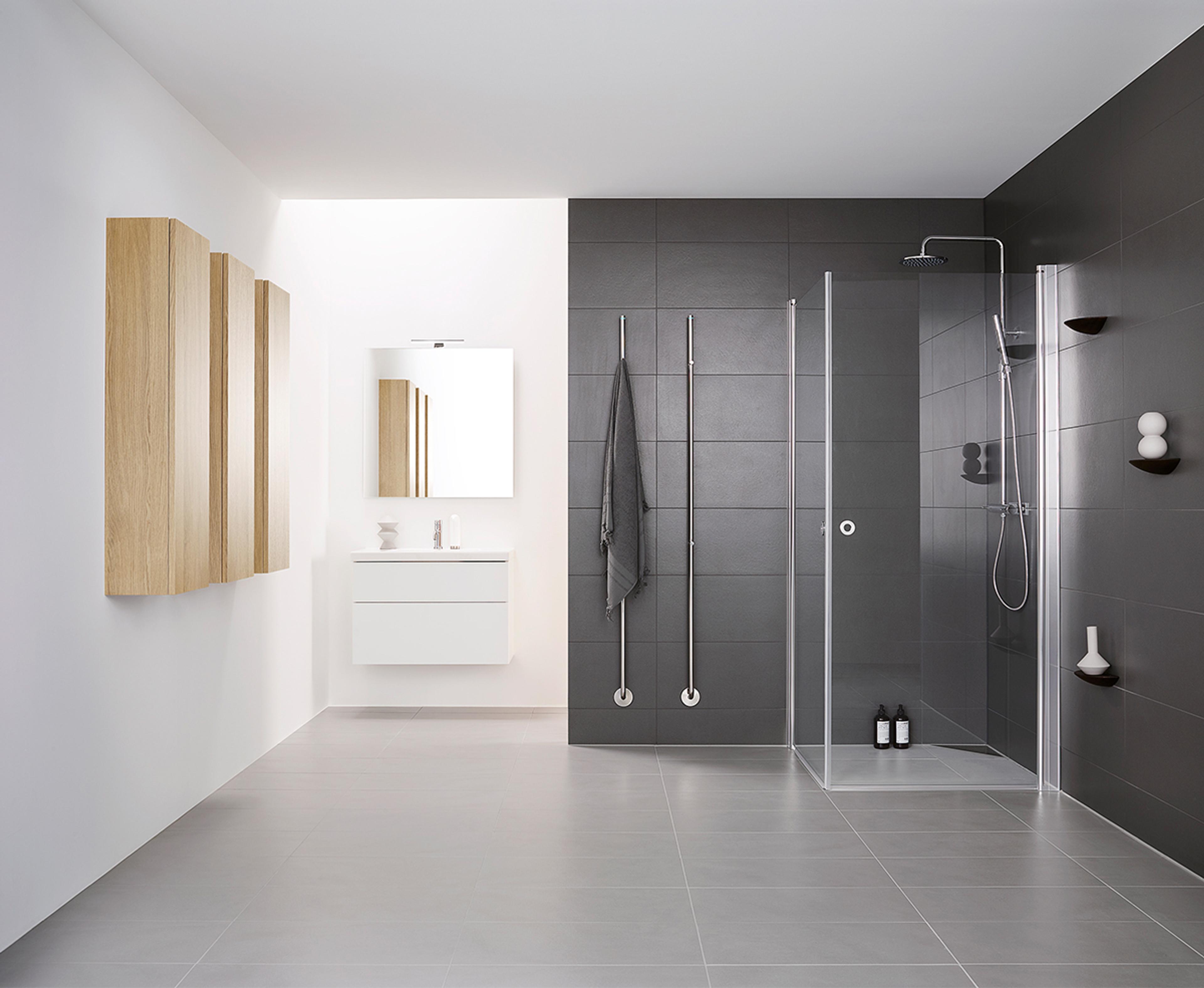 Dusjhjørne med to rette innsvingbare dører i 6 mm glass. Finnes i faste standardmål som du kan kombinere fritt, men også i måltilpasset utførelse. Kan kombineres med Pile.