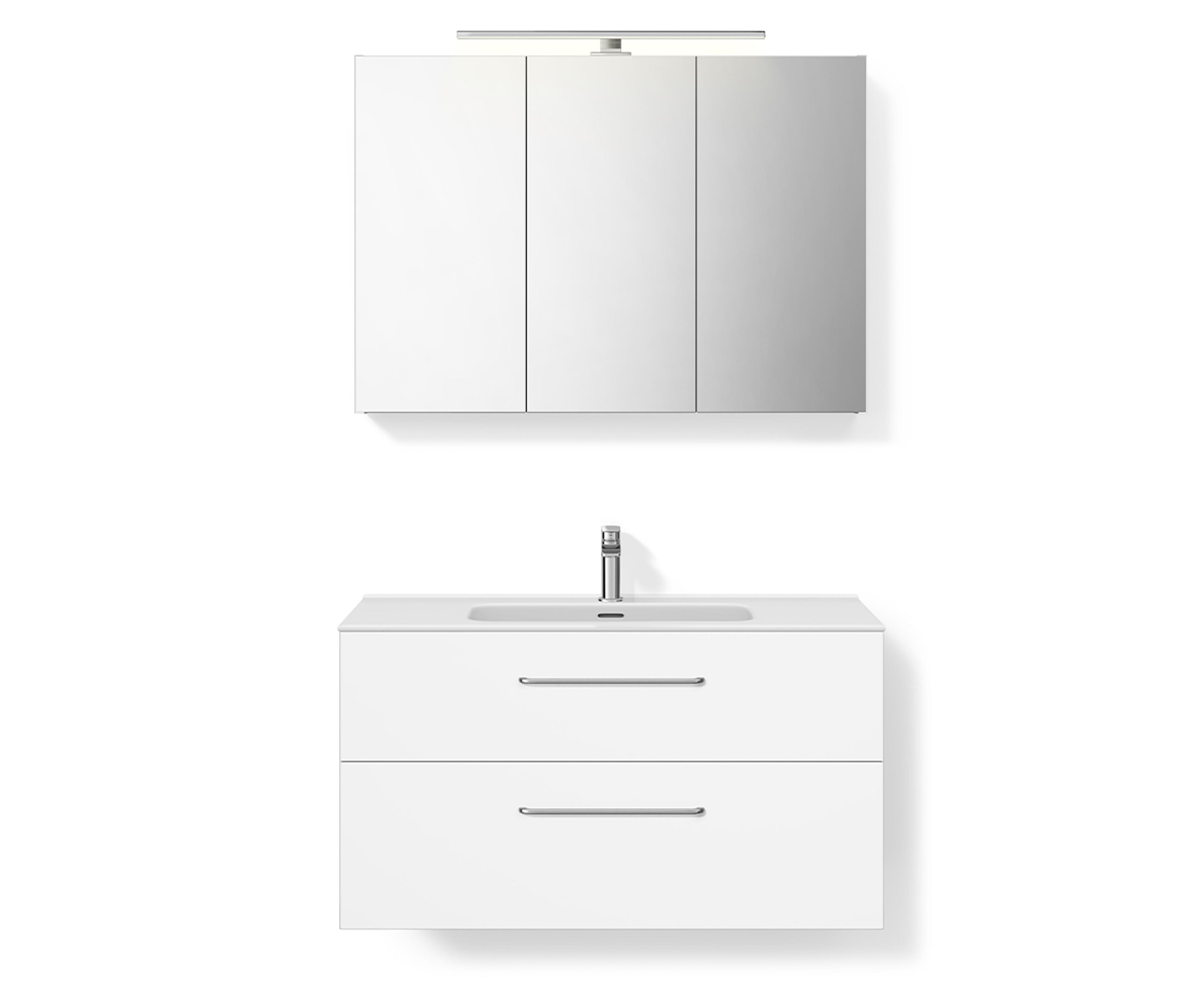 Baderomsmøbel i hvit matt som inkluderer servantskapet (99,7x55x45,6 cm) med to skuffer og håndtak i krom. Heldekkende tynn porselensservant (101x17x46 cm) i hvit og speilskap (99,7x70x13,6 cm) med to-sidig speil, myktlukkende hengsler og toppmontert LED-lampe. Velg mellom flere ulike overflater og størrelser. Pris uten servantkran. Mål B x H x D: 101x56,8x46 cm
