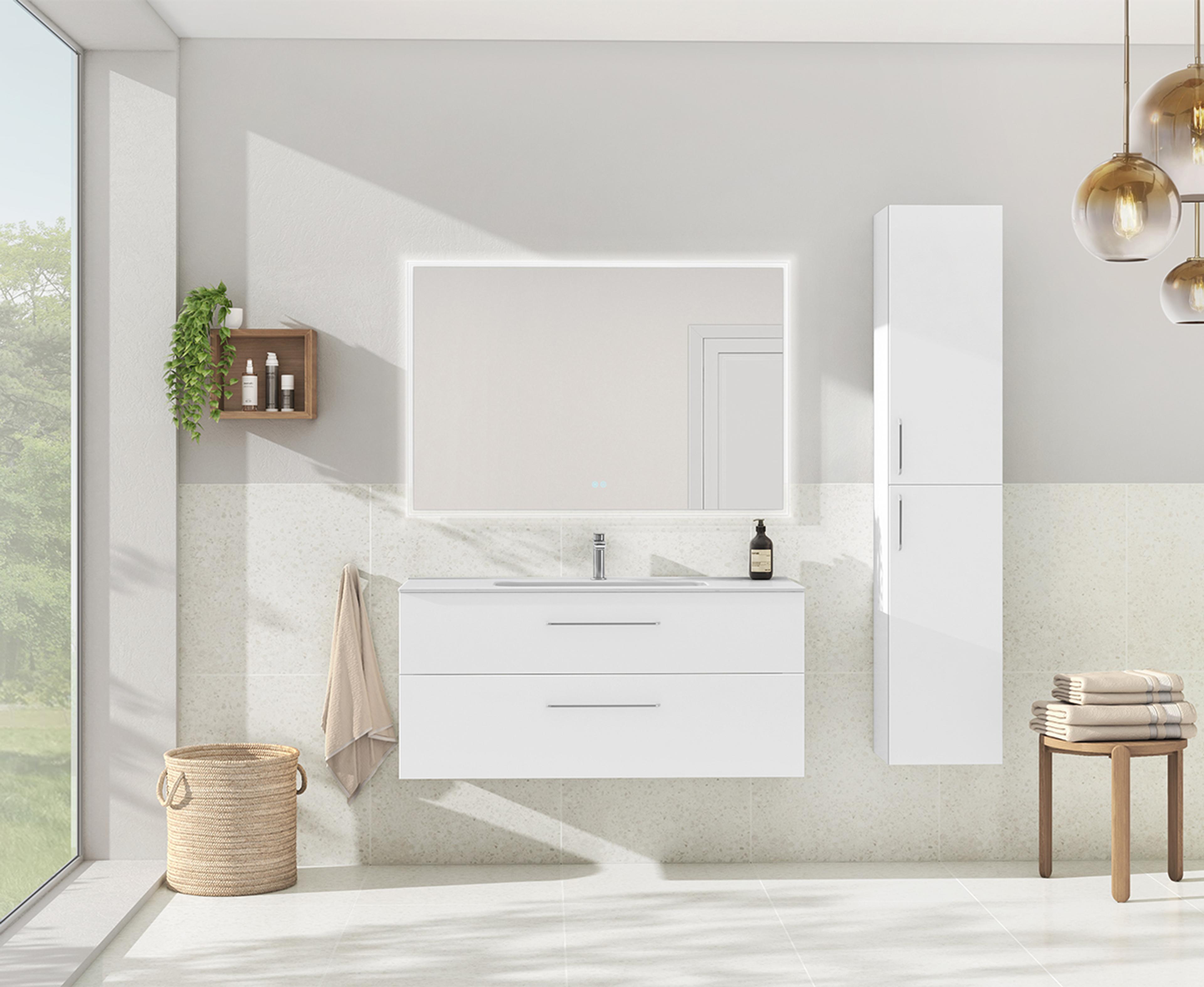 Baderomsmøbel i Hvit matt som inkluderer servantskapet (119,7x55x45,6 cm) med to skuffer og håndtak i krom. Heldekkende tynn porselensservant (121x17x46 cm) i hvit og firkantet speil (120x80x3,5 cm) med dimbart kaldt og varmt lys, og antidugg. Pris uten servantkran.
