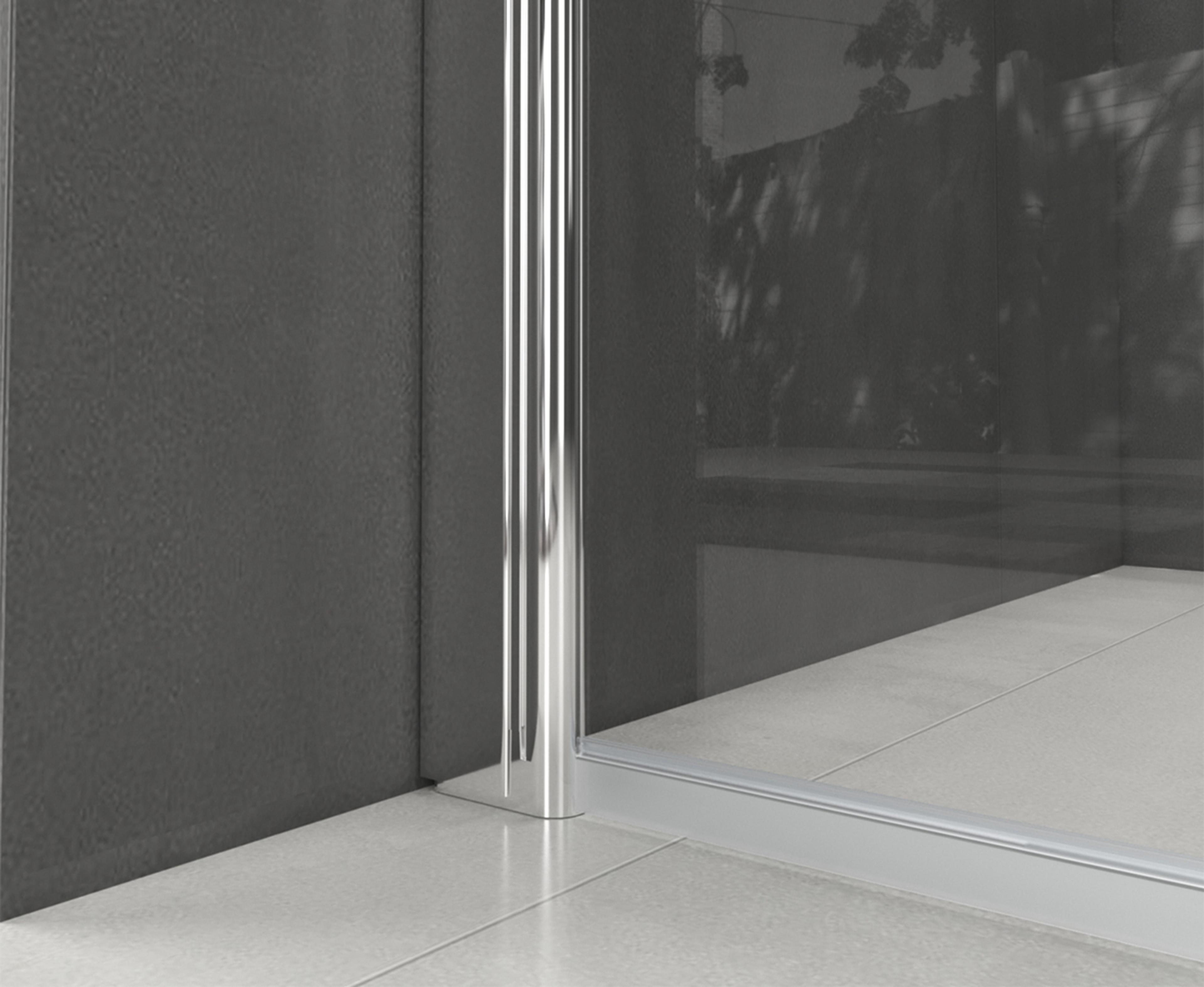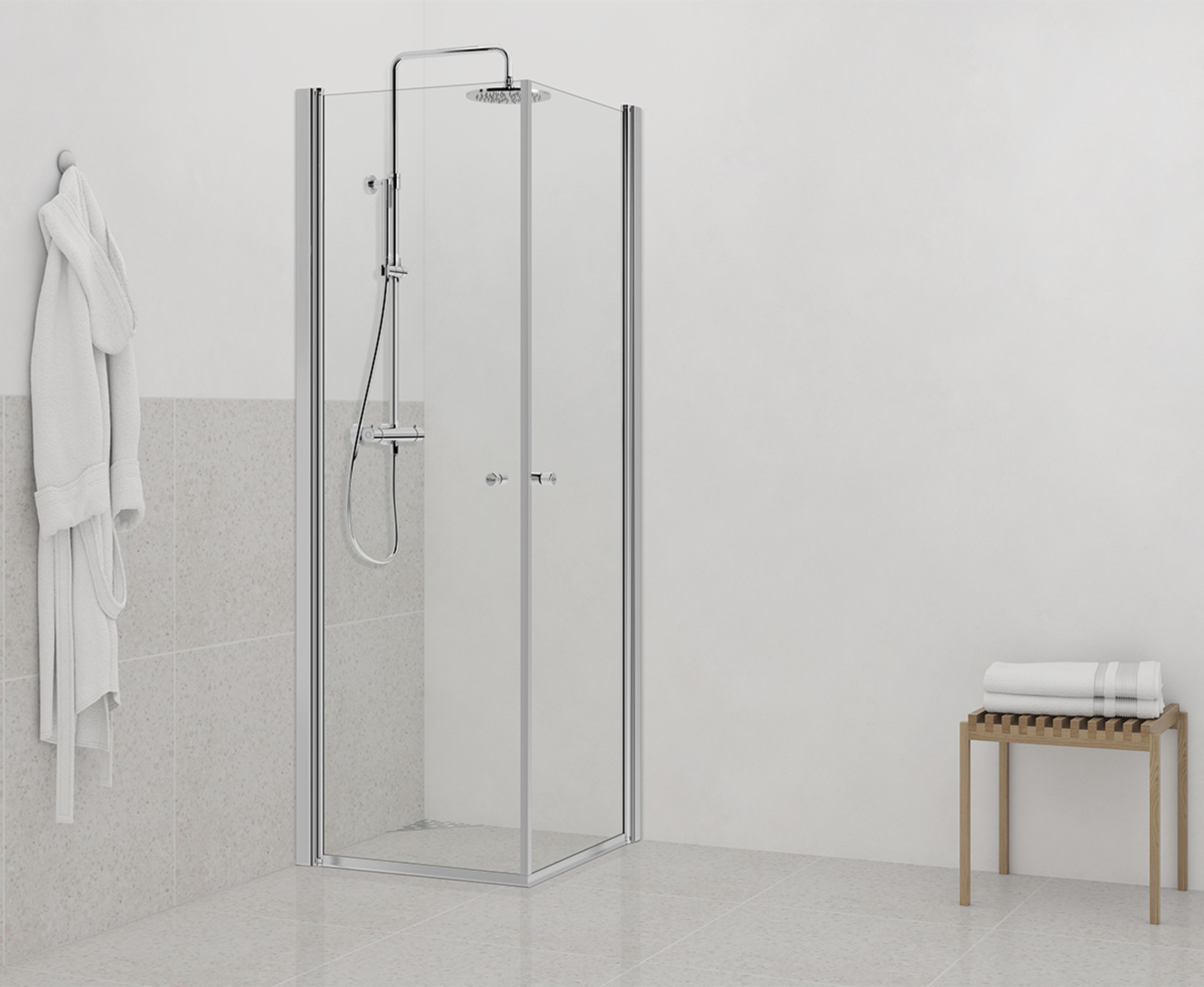 Dusjhjørne i 6 mm klart, herdet sikkerhetsglass med profiler i krom, med vendbar hev/senk funksjon. Pris uten takdusj og dusjbatteri. Mål: 70x70x200 cm.