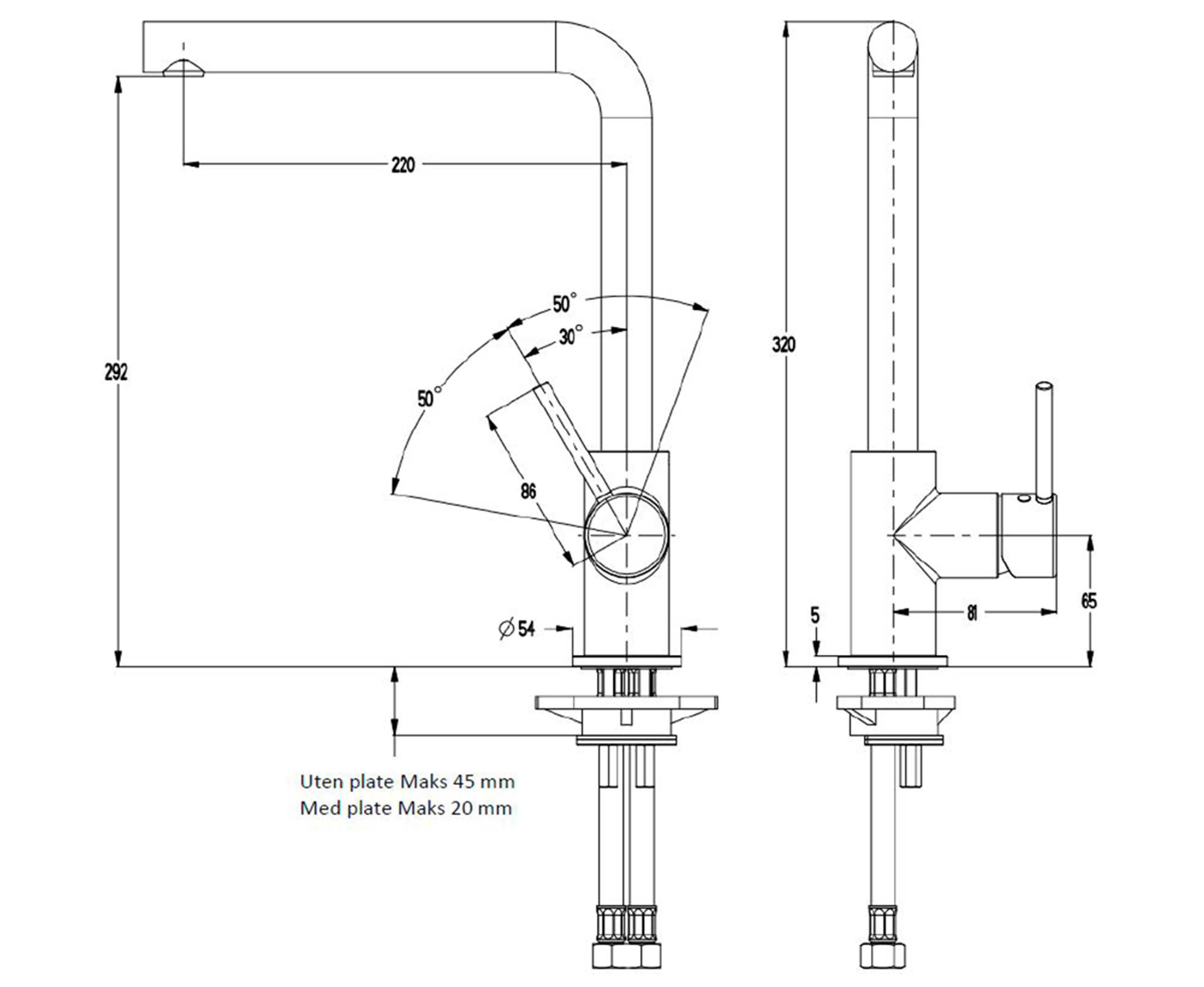 Kjøkkenkran med ettgreps betjening med svingbar tut og fleksible slanger. L-formet tut. Solid og driftssikkert i et slankt og moderne design. Farge: Krom