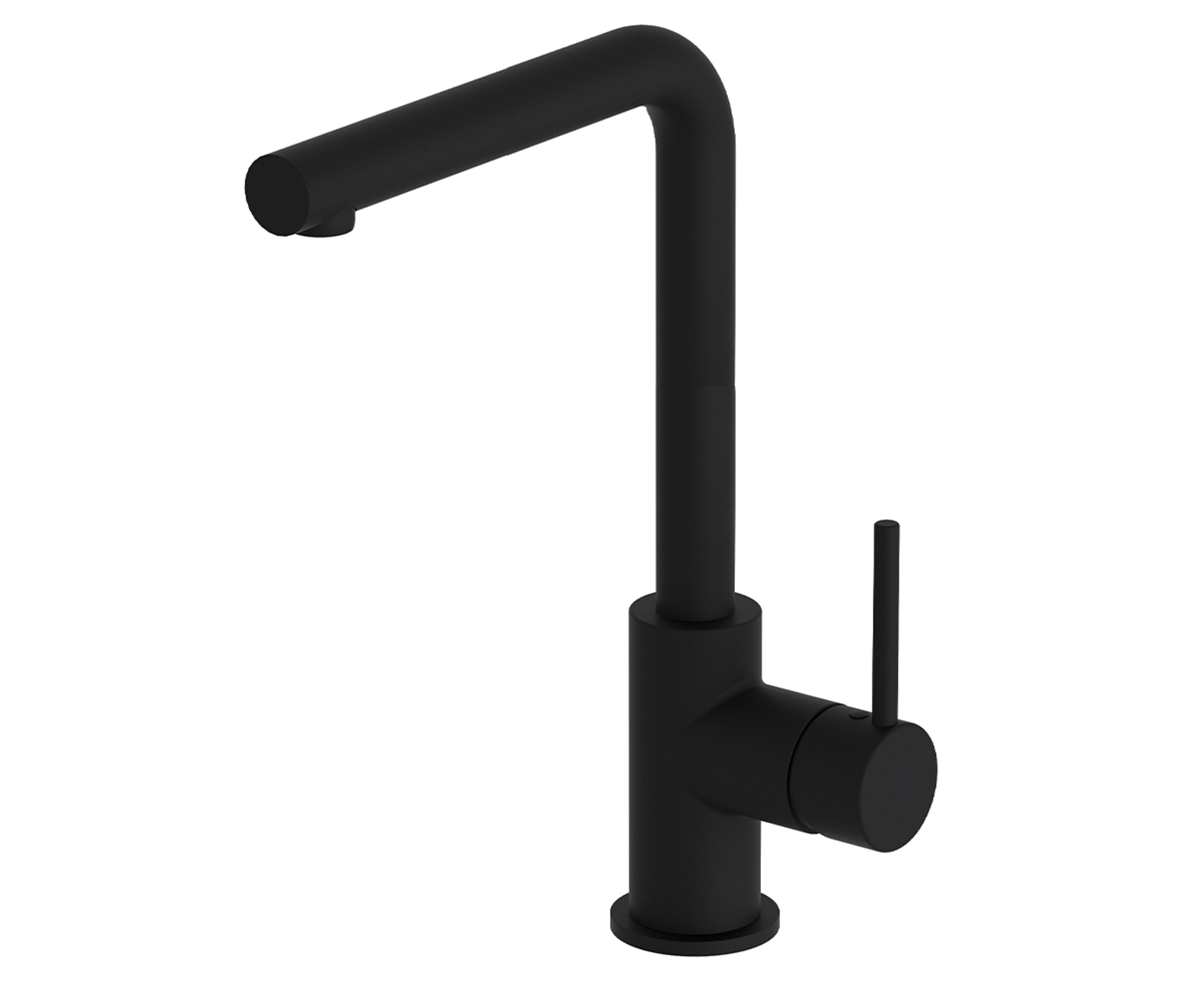 En elegant kjøkkenkran med ettgreps betjening, svingbar L-tut og fleksible slanger. Karakteristisk og stilsikker kran med rette, slanke og stramme linjer.